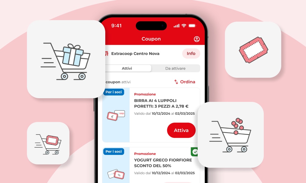 I coupon di Coop Alleanza 3.0 riservati ai soci ti aiutano a risparmiare sulla spesa o ad accumulare più punti. Tieni sempre sotto controllo la tua area Coupon per verificare le novità dedicate a te, attiva i coupon prima dell’acquisto o utilizza quelli già attivi, e inizia a risparmiare!