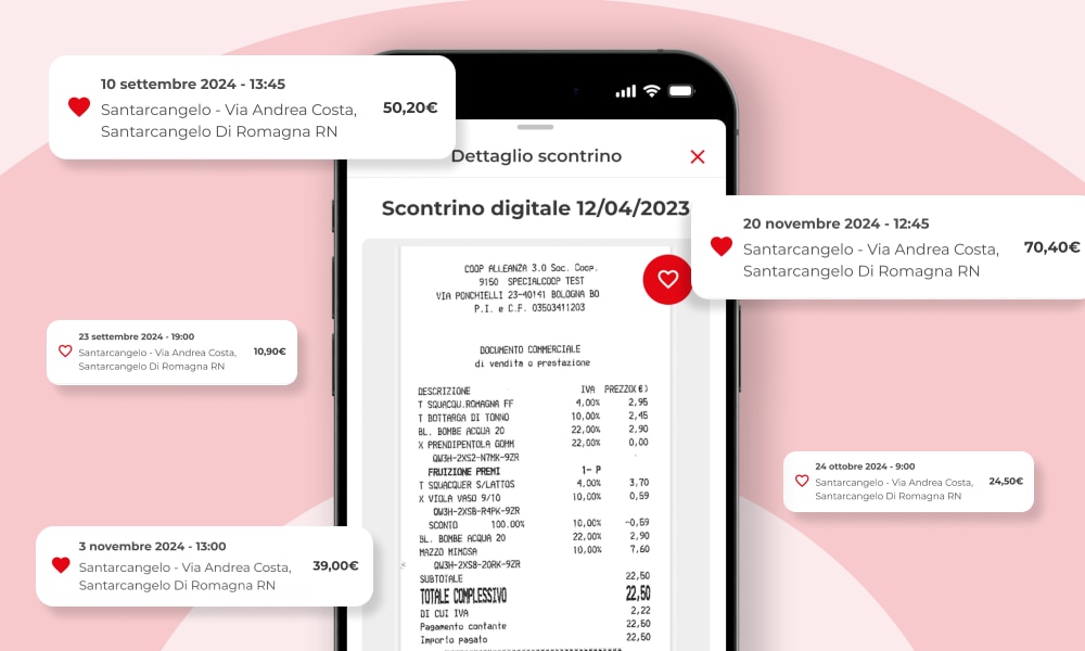 Buono per l'ambiente, e comodo per te: nella tua area riservata del sito o dell'app puo infatti tenere sotto controllo tutte le tue spese. Puoi visualizzare, scaricare e, se desideri, stampare, gli scontrini digitali per 26 mesi, o condividerlo online. L'archivio degli scontrini digitale è anche molto utile, per esempio per recuperare scontrini emessi da tempo, come la garanzia di un elettrodomestico o di un articolo tecnologico. Scegli come essere avvisato ad ogni spesa, con e-mail o notifica in app, decidendo tu la soglia minima.