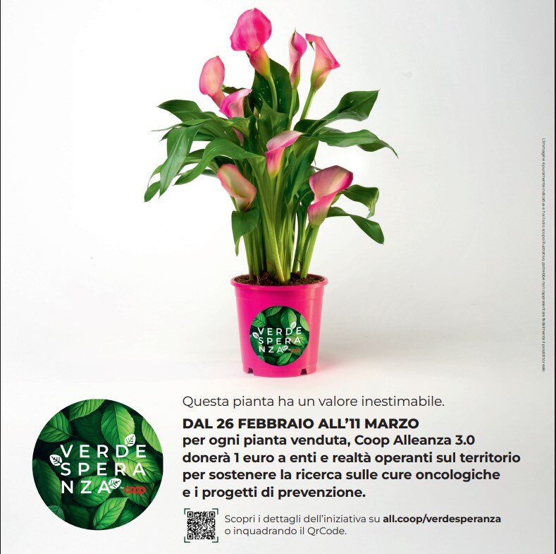 Al via da domani, 26 febbraio, per il 2026 la campagna Coop “Verde Speranza”: per soci e consumatori sarà possibile contribuire a sostenere enti, poli di ricerca e ospedali specializzati nella prevenzione e cura oncologiche acquistando una delle piccole piante Verde Speranza in vendita negli oltre 340 negozi di Coop Alleanza 3.0, ubicati nelle 8 regioni – dal Friuli Venezia Giulia alla Puglia – in cui la Cooperativa è presente.