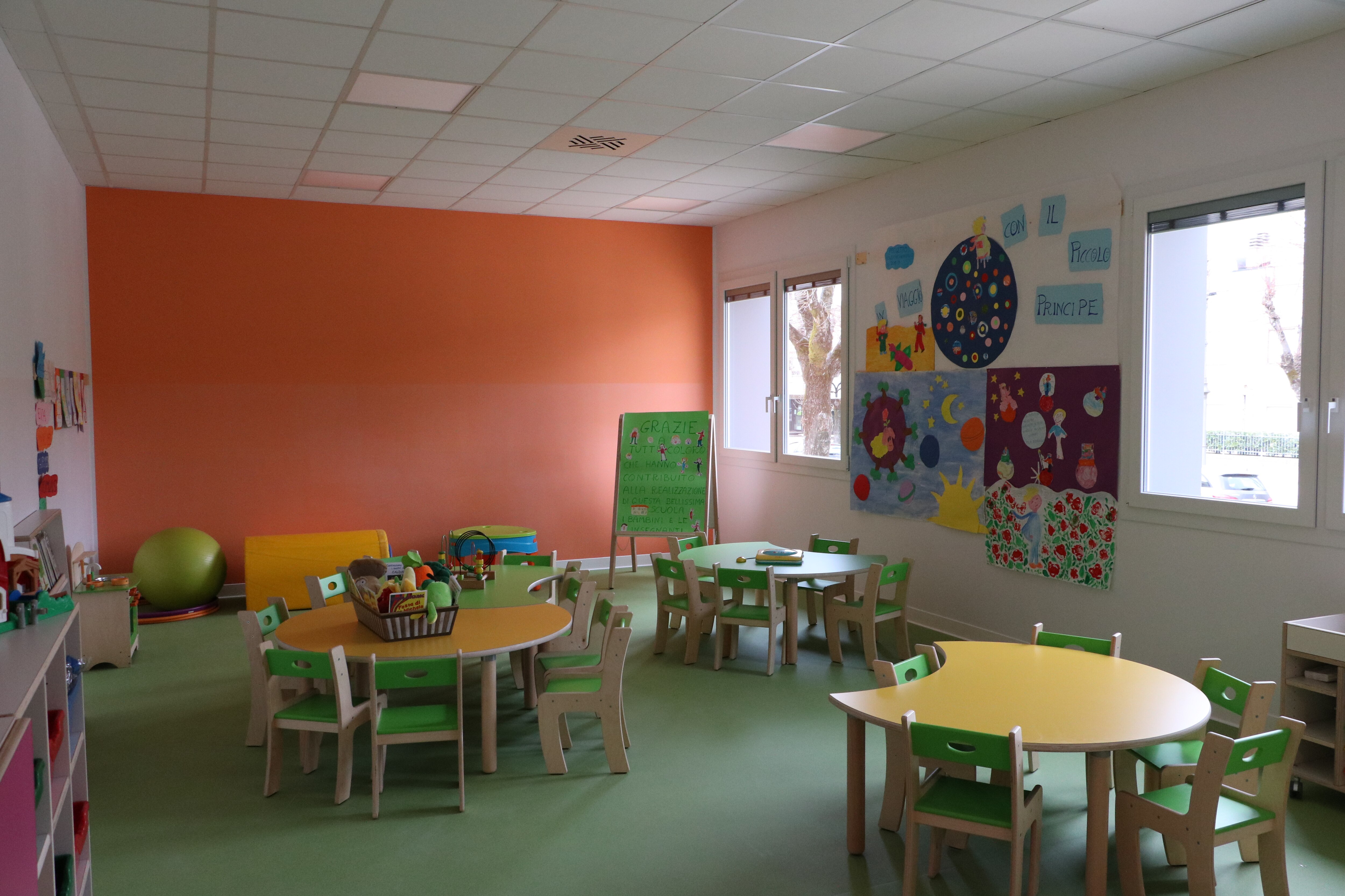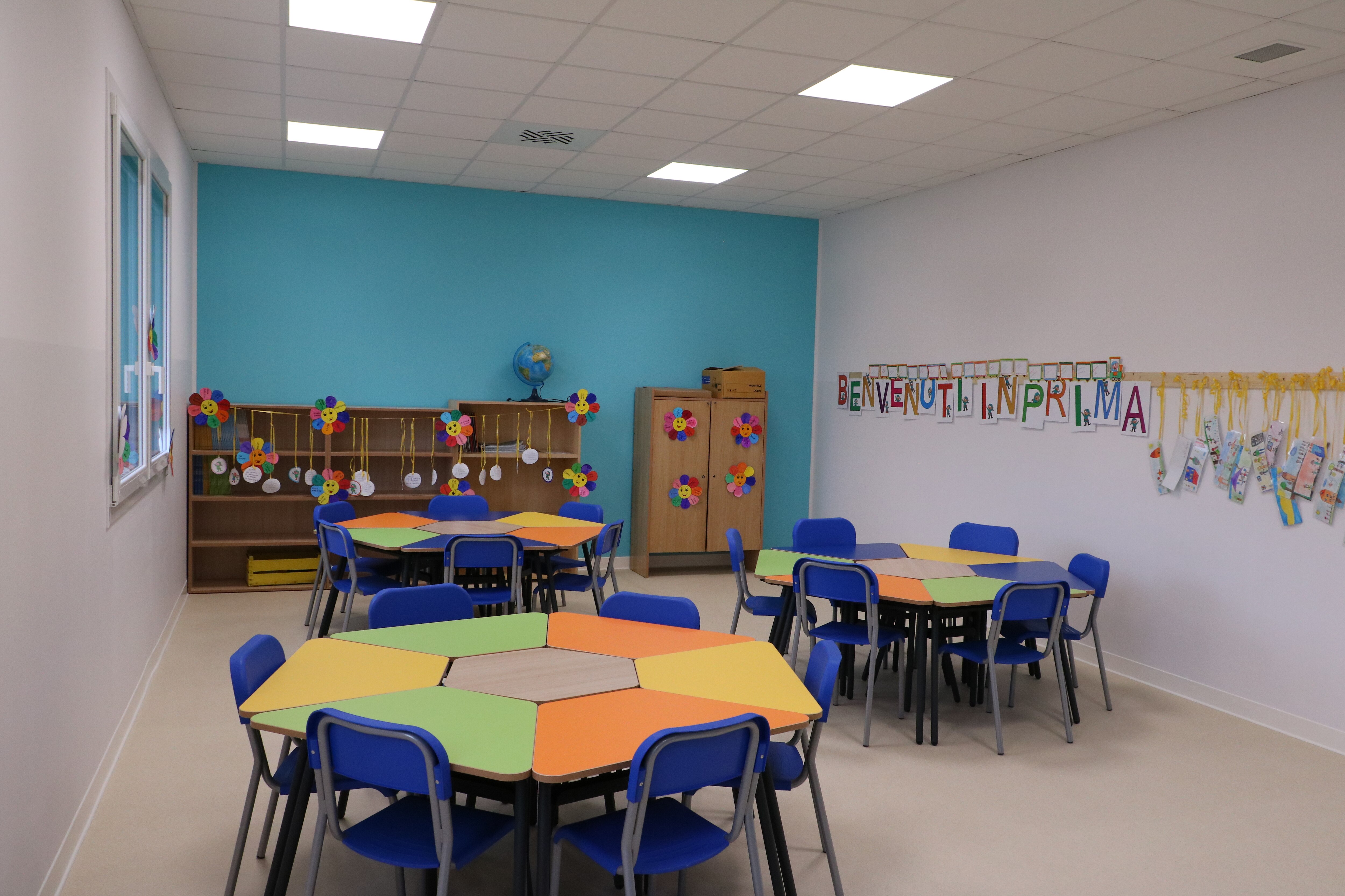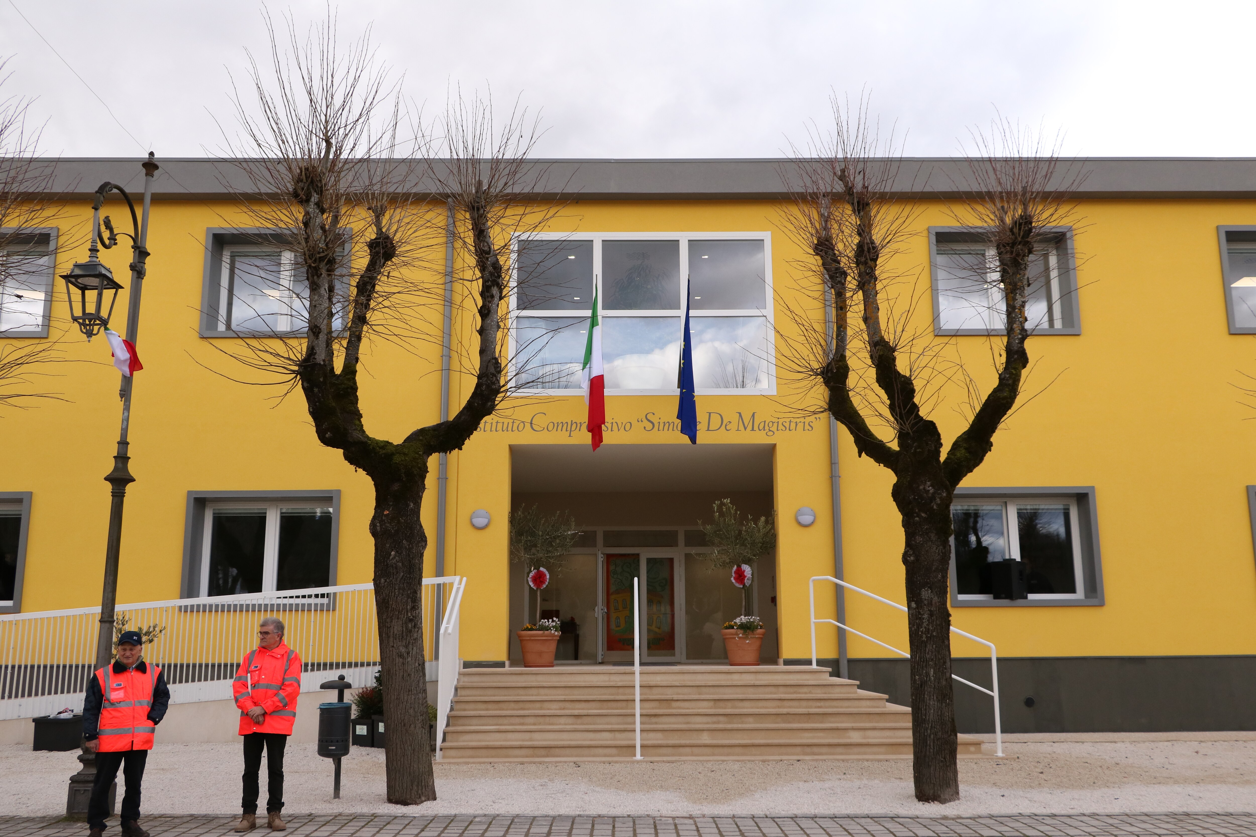 I 1.700 metri quadrati della nuova scuola di Viale Umberto, intitolata al pittore manierista Simone De Magistris, accolgono tre sezioni della scuola dell’infanzia e cinque della primaria, per un totale di 250 bambini. La struttura è stata realizzata in acciaio per la resistenza al sisma e in materiali di tamponamento e copertura utili a garantire il massimo comfort termico, nel rispetto dell’Ordinanza n.14 del 16 gennaio 2017 emessa dal Commissario straordinario del Governo per la ricostruzione nei territori dei Comuni delle Regioni di Abruzzo, Lazio, Marche e Umbria interessati dall’evento sismico. Per il nuovo edificio, che ospita anche un auditorium, una biblioteca, un laboratorio di grafica ed un’aula informatica, sono stati impiegati pannelli fotovoltaici per garantire una maggiore efficienza energetica, e ampie vetrate per stabilire una connessione con il paesaggio storico.