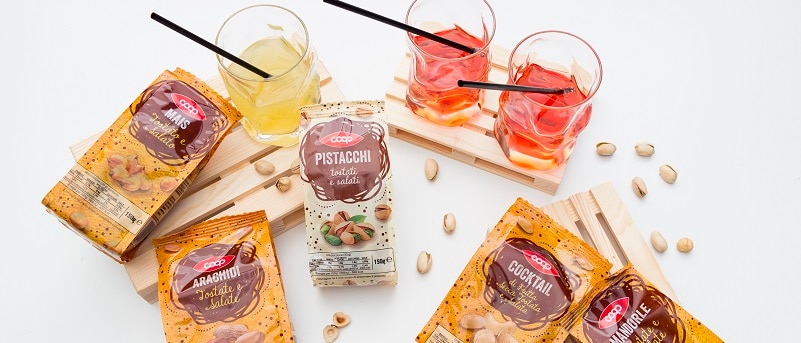 Completano la linea vari tipi di frutta secca: arachidi, pistacchi e cocktail di frutta secca, tostati e salati, e due novità, le mandorle pelate tostate a secco e salate e il mais tostato e salato.