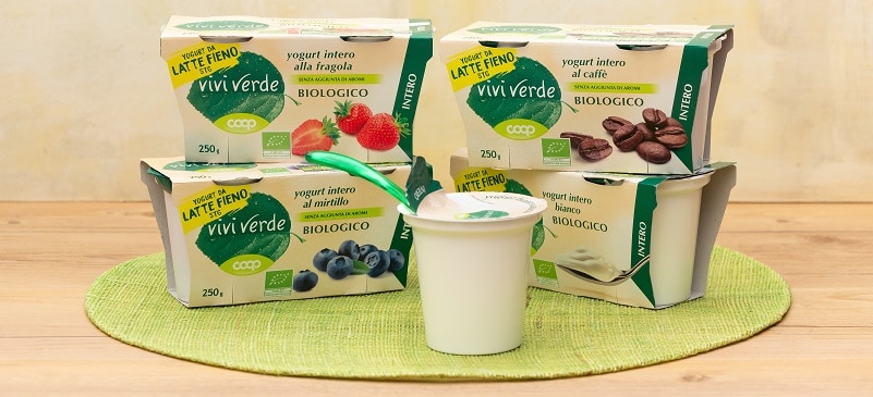 Tutti gli yogurt interi biologici Vivi verde sono stati riformulati per migliorare la qualità e il sapore del prodotto. La nuova ricetta utilizza solo aromi naturali e latte fieno STG, proveniente cioè da mucche allevate quasi esclusivamente con erba secca, fiori di campo e fieno essiccato naturalmente, con utilizzo sempre più ridotto di mangimi e totale assenza di OGM. La linea prevede sei tipologie: bianco, fragola, mirtillo, caffè, vaniglia, e il nuovissimo gusto agli agrumi.