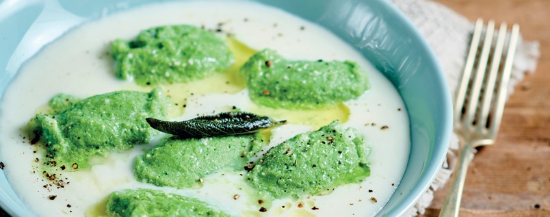 500 g di ricotta vivi verde, 350 g di bietole, 2 uova, 250 g di farina bianca “00”, 120 g di Grana Padano Dop Riserva fior fiore, semola di grano duro, noce moscata, 50 g di burro da panna fresca fior fiore, sale e pepe. Per la fonduta: 800 g di Grana Padano Dop Riserva fior fiore, 50 g di latte, 15 g di fecola di patate, noce moscata, sale e pepe.