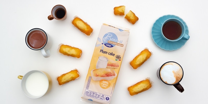 Per la prima colazione o per uno snack goloso, ecco una tra le merendine più classiche, ma senza zuccheri aggiunti. Il plum cake Bene.sì è prodotto con yogurt 100% italiano e con uova fresche da galline allevate a terra. Con il 30% in meno di grassi saturi rispetto alla media dei normali plum cake, risponde alle esigenze dietetiche di molti adulti e bambini.