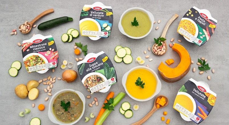 Le zuppe fresche rappresentano un trend di mercato in crescita, per questo Coop ha deciso di introdurre una nuova linea continuativa di zuppe pronte che va a rafforzare l’offerta attuale, rappresentata dai piatti pronti vegetali Vivi verde, già disponibili nel banco frigo dell’ortofrutta. La nuova linea è composta da cinque minestre classiche (tre zuppe in pezzi e due vellutate), realizzate con ricette 100% vegetali a base di verdure, legumi, cereali e olio EVO.