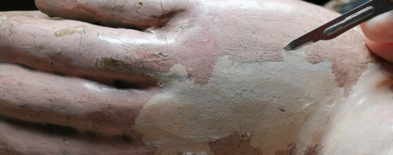 La dottoressa Rossella Calanca è a capo dei lavori di restauro della “Madonna adorante”, attualmente arrivati anch’essi a metà dell’iter programmato. La scultura di Gianfranco Gagliardelli, in terracotta policroma e dorata, raffigura una Madonna in contemplazione del Bambino Gesù, con le mani giunte e lo sguardo assorto. L’opera, intitolata alla protettrice di Bisenti, è oggetto di grande devozione popolare. Dopo un'analisi dell'opera nel suo complesso che ha rilevato un forte deterioramento, i lavori si sono concentrati su un'approfondita pulitura, che ha fatto emergere la colorazione originale sottostante così come la migliore definizione delle mani ricoperte nel tempo da strati di stucco e pittura. Le operazioni sono avanzate con una stuccatura delle fessurazioni e il ritocco pittorico. Per completare il recupero manca solo la lucidatura completa e il trattamento anti-tarme della base lignea che servirà a scongiurare il suo deterioramento nel tempo.