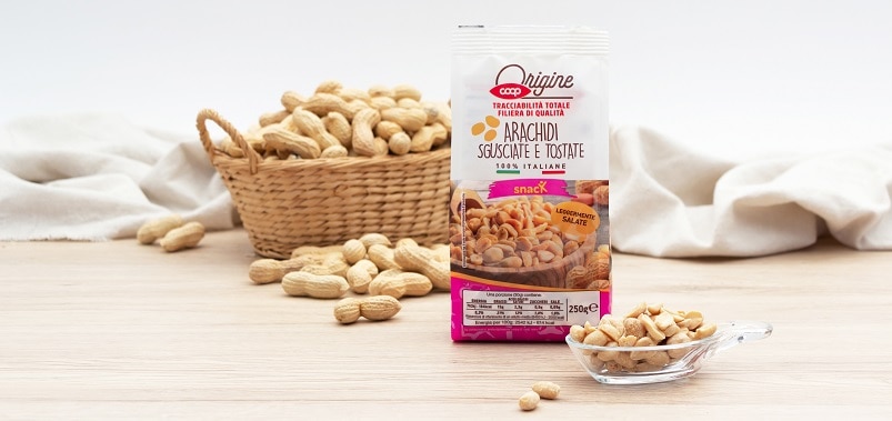 Le arachidi sgusciate e tostate Origine sono coltivate esclusivamente sul territorio italiano; la raccolta in campo avviene nel mese di settembre con una fase di pre-essicazione al sole che precede la fase di sgusciatura e tostatura. La leggerissima aggiunta di sale (0,3%) rende il prodotto finale uno snack davvero invitante e goloso, adatto in particolare per gli aperitivi ma anche per un sano e veloce fuoripasto. Le arachidi sono anche un ingrediente alternativo in cucina per primi e secondi piatti, insalate e dolci.