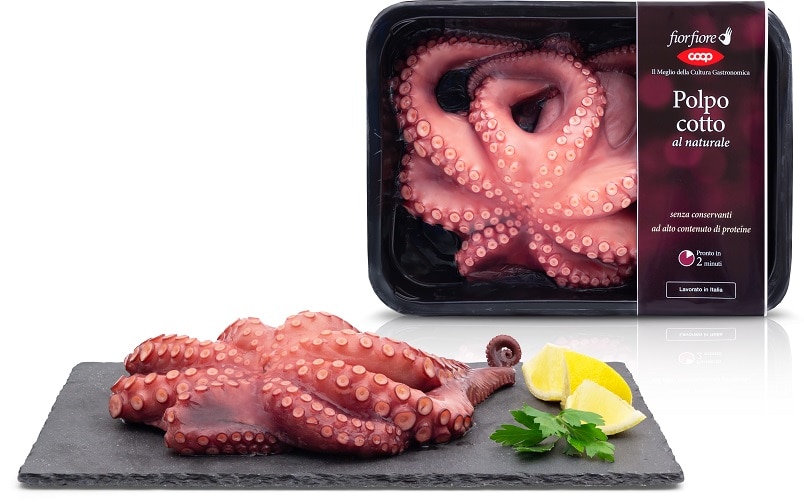 Il Polpo Fior fiore Coop appartiene alla pregiata specie Octopus vulgaris e proviene dai mari dell’Oceano Atlantico nei quali questo cefalopode viene pescato. Viene poi lavorato in Italia ed è un alimento ricco di proteine. Il polpo è cotto al naturale senza uso di conservanti e può essere consumato