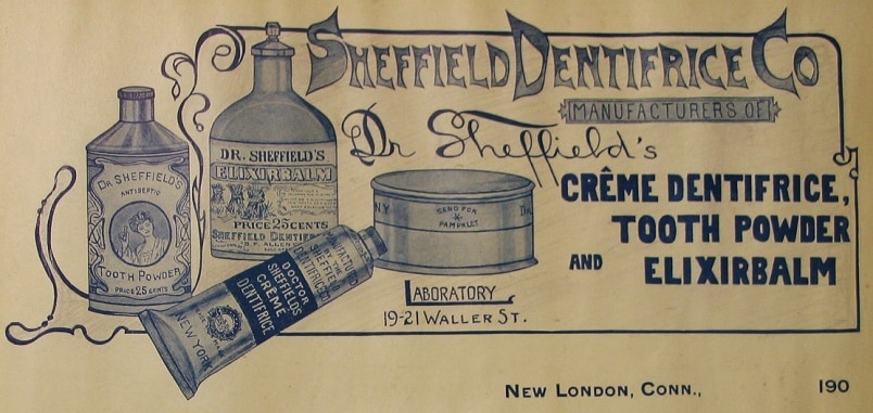 Il dentifricio così come lo conosciamo oggi, cremoso e dal sapore gradevole, è stato inventato negli Stati Uniti negli anni '70 dell'Ottocento dal dottor Washington Sheffield, un dentista di New London, in Connecticut. Il dottore mise a punto una crema che usava per i suoi pazienti, a cui nel tempo ha aggiunto estratti di menta, che lasciava un alito fresco e gradevole. I pazienti apprezzarono l'invenzione e iniziarono a chiedere dei campioni, e così il dottore, insieme a suo figlio Lucius, anch'egli dentista, avviò la Sheffield Dentifrice Co e iniziò a produrre la Dr. Sheffield's Crème Dentifrice.