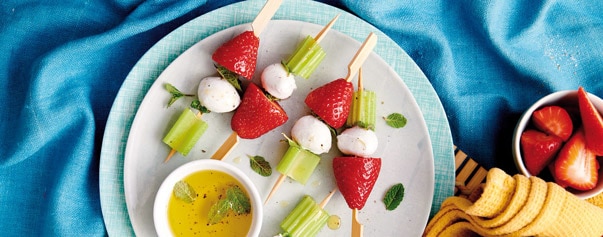 Fragole, mozzarella di bufala e coste di sedano: un tris fresco e veloce per un aperitivo “ficcante”
