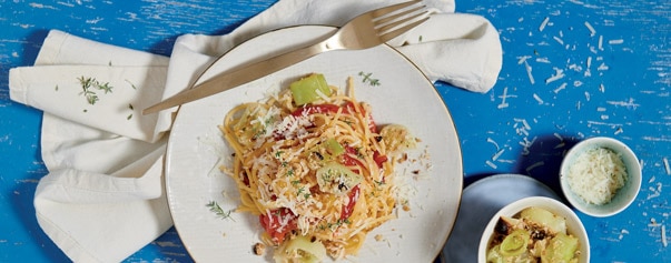 Una pasta antica e un sugo sfizioso: spaghetti con peperoni e crumble di porri. Il condimento si prepara in pochi minuti e una facile "sbriciolata" decora il piatto in modo garbato ed elegante