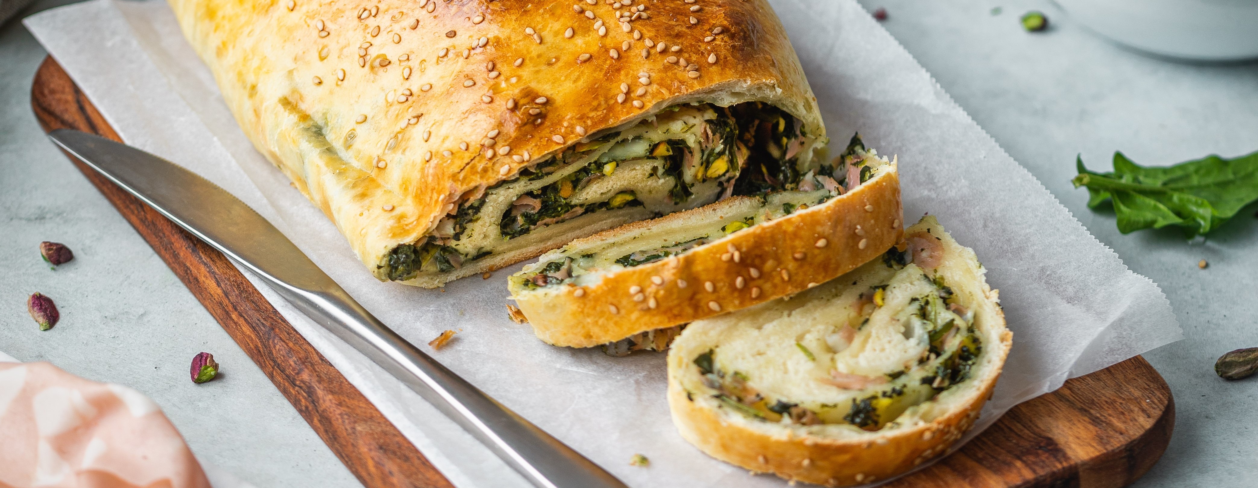 Stuzzicante come aperitivo, appetitoso come secondo; un morbido strato di pasta avvolto con mortadella, stracchino, spinaci e pistacchi