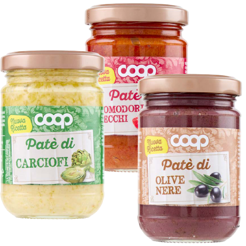 Dal 9 al 19 aprile mentre fai la spesa prendi dallo scaffale un vasetto di Patè Coop da 130 g, a scelta tra le varianti carciofi, olive nere o pomodori secchi, vai in cassa e passa la tua Carta socio.