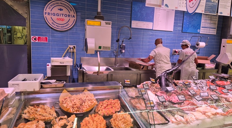 Alla Pescheria si trovano piatti pronti da cuocere, pesce fresco o surgelato per ogni tipo di ricetta. Disponibili anche uova sfuse, per un acquisto più sostenibile. Presente la Friggitoria, che consente di scegliere il pesce fresco e gustarlo fritto al momento. Sono inoltre disponibili specialità già cotte come spiedini di calamari, mazzancolle e baccalà fritto. Arriva infine il corner della Salmoneria, dedicato al salmone in diverse varianti – affumicato, a tranci o in formato take away.