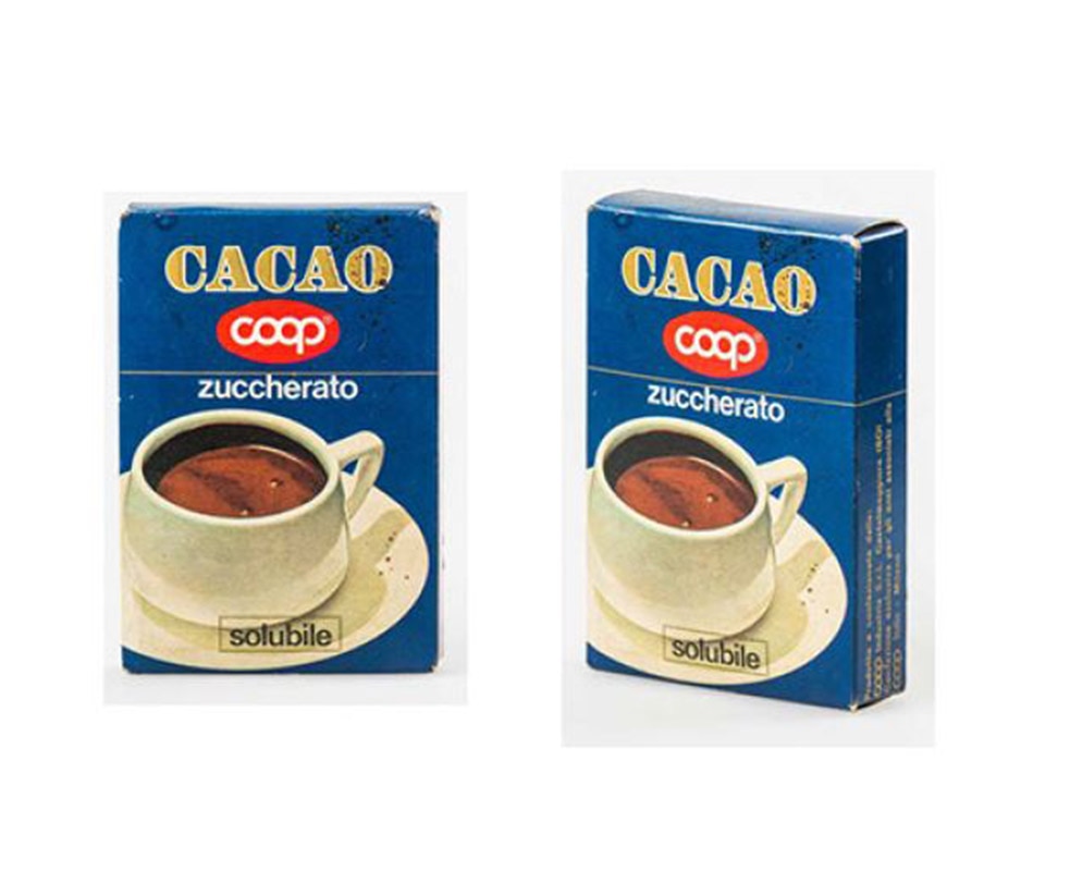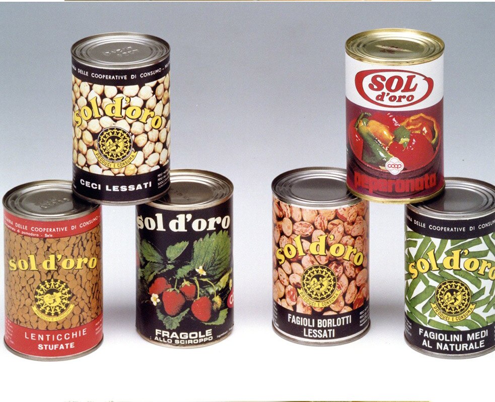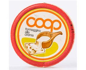 Il marchio Coop si proponeva soprattutto come garante dei prodotti: per questo era visivamente rappresentato da un timbro in cui tante persone si tenevano per mano, circondando il logo. Sui prodotti invece il logo aveva un nostalgico carattere corsivo, proprio secondo gli stili dell’epoca.