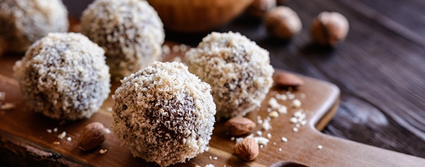 Unire 60 grammi di anacardi Origine con 50 grammi di semi di zucca Vivi verde e 180 grammi di fichi secchi, 2 cucchiai di cacao amaro d’Osa e 1 di cannella in polvere. Per i più golosi, una volta preparate le palline decoratele con cioccolato fuso a bagno maria: una delizia! - Palline di cocco pronte in pochi minuti con solo 4 ingredienti: 250 grammi di farina di cocco d’Osa (50 grammi teneteli da parte per guarnire), 450 grammi di ricotta Vivi verde, 2 cucchiai di sciroppo d’acero d’Osa