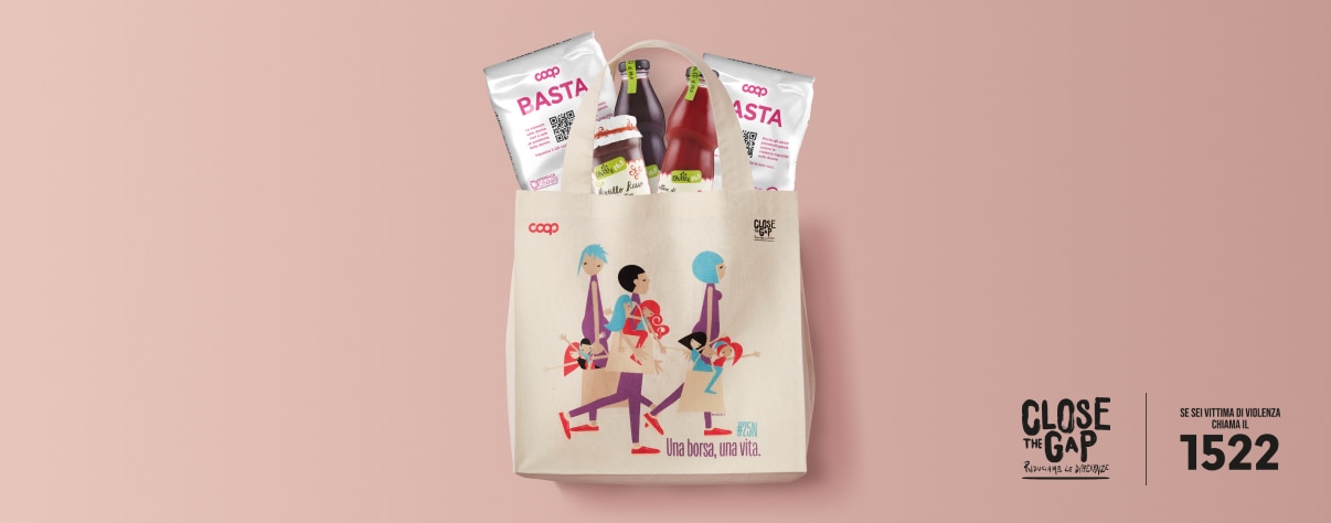 La shopper è realizzata in edizione limitata a sostegno dell'associazione Differenza Donna, che assiste le donne vittime di violenza. Inoltre, sulle confezioni di 4 formati di pasta di semola a marchio Coop sarà inserito un messaggio che invita proprio a contattare, se vittime di violenza o stalking, il numero 1522, e sarà presente un QR code che se inquadrato, permetterà di ascoltare 6 racconti di episodi di violenza contro le donne, restituiti questa volta da uomini che ne sono stati testimoni – perché figli, genitori, fratelli, amici di donne, che le hanno vissute. Storie vere, raccolte dalle operatrici del 1522 ascoltabili sul sito coop1522.it e su Spotify e interpretate dagli attori Francesco Migliaccio, Edoardo Barbone e Giacomo Ferraù sulle note del compositore Fabrizio Campanelli, che ha donato gratuitamente il suo brano per questo progetto. Le storie saranno anche ascoltate nei punti vendita grazie a Radiocoop nell’intera giornata del 25 novembre.