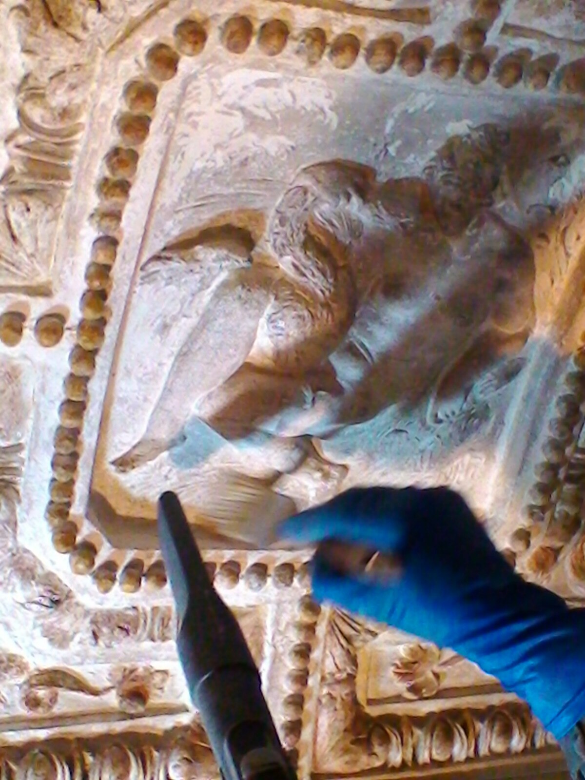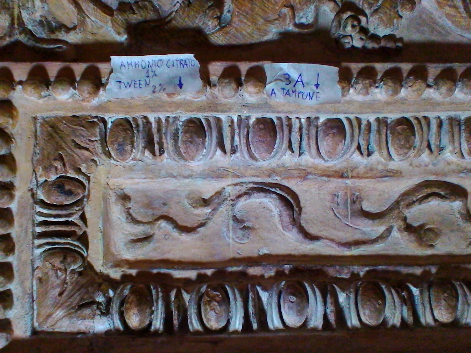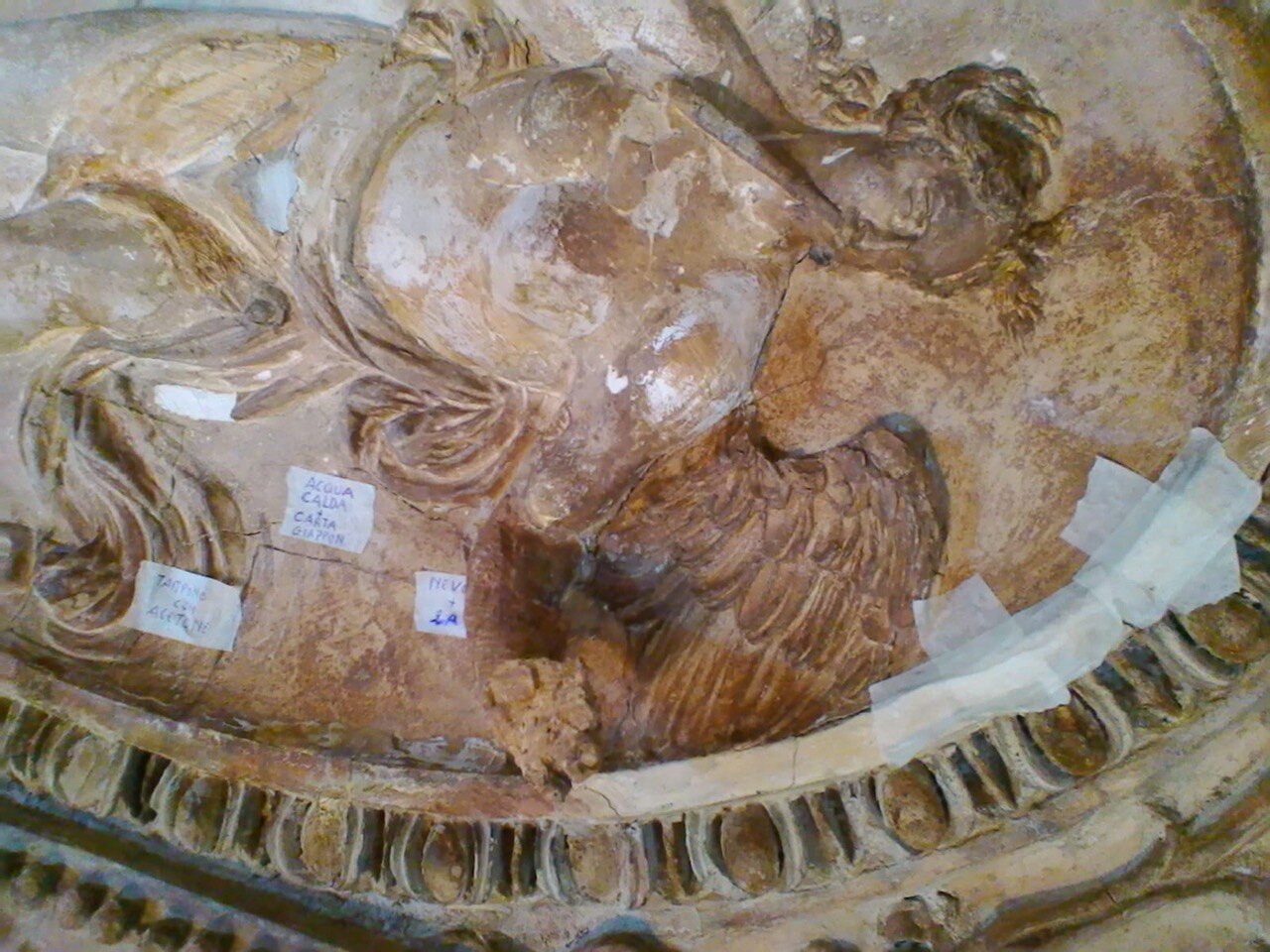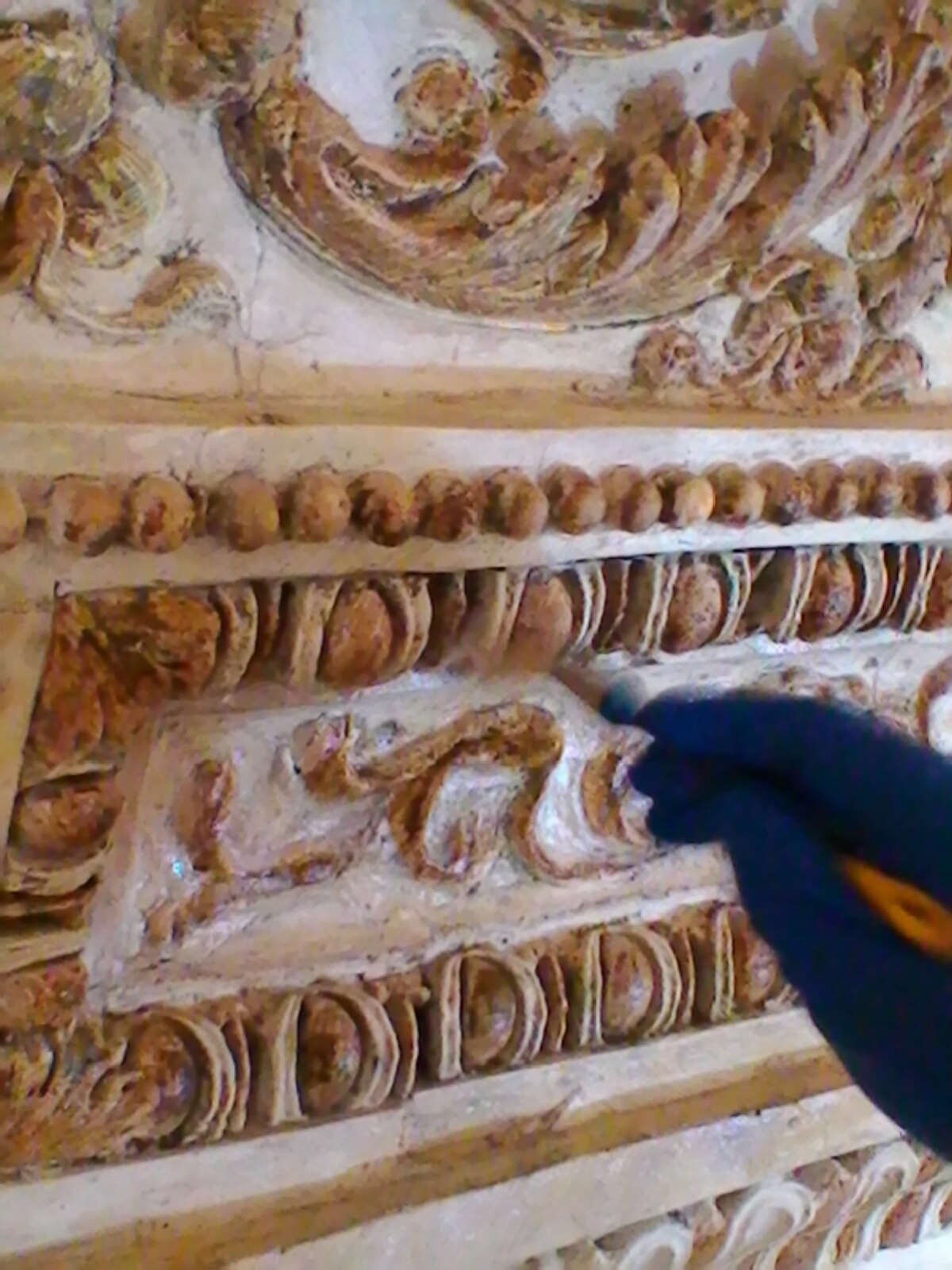 La pulitura. Ecco alcune immagini della pulitura e del consolidamento della parti in stucco staccate.