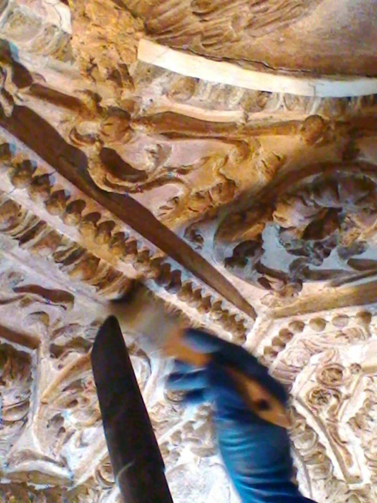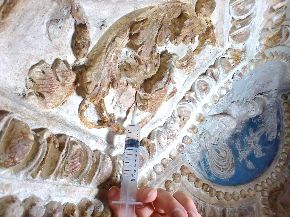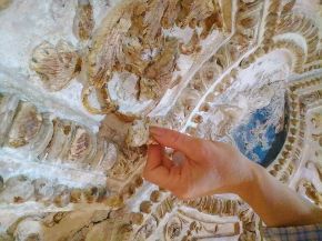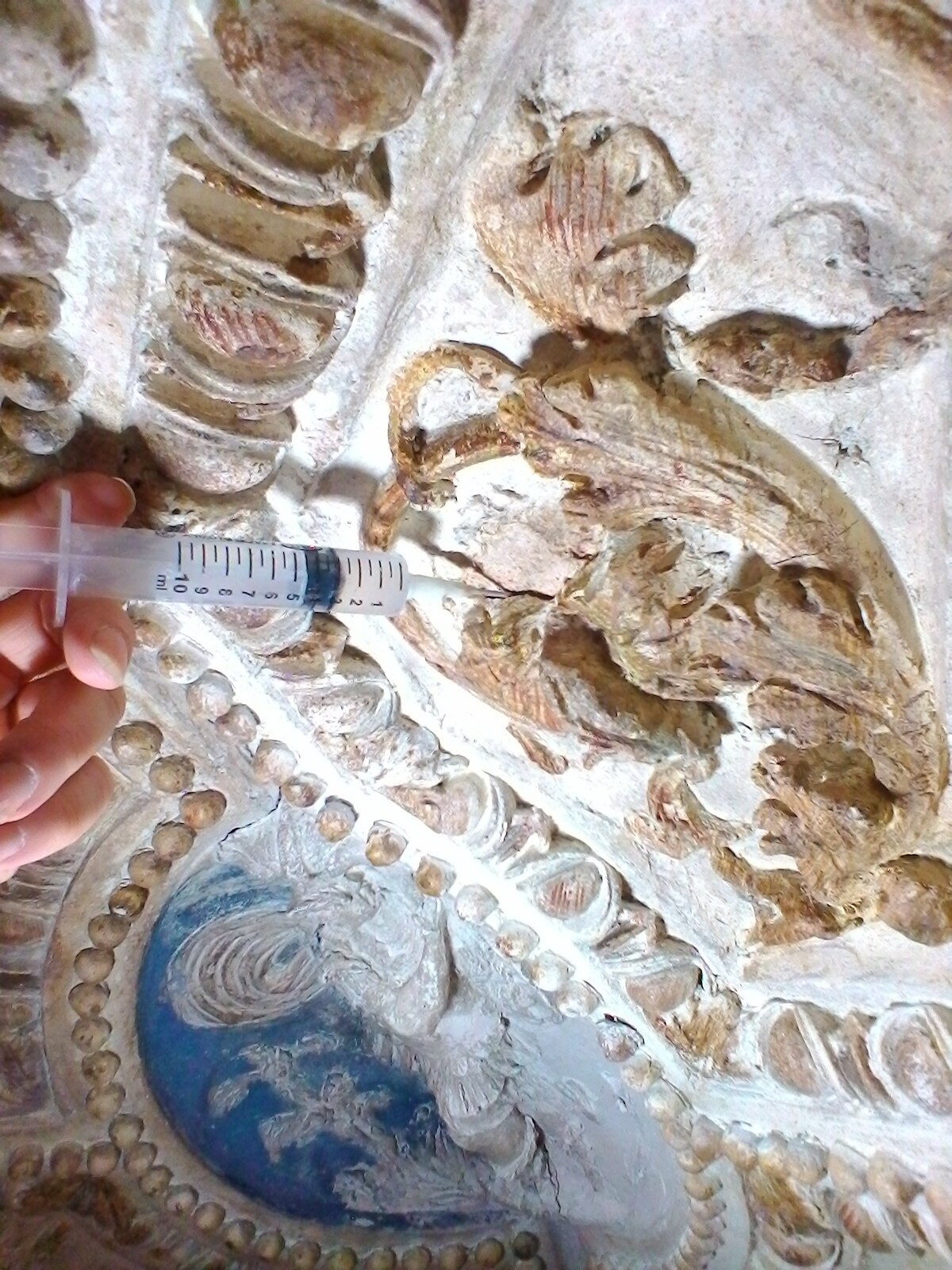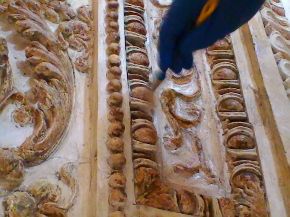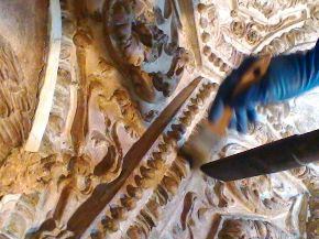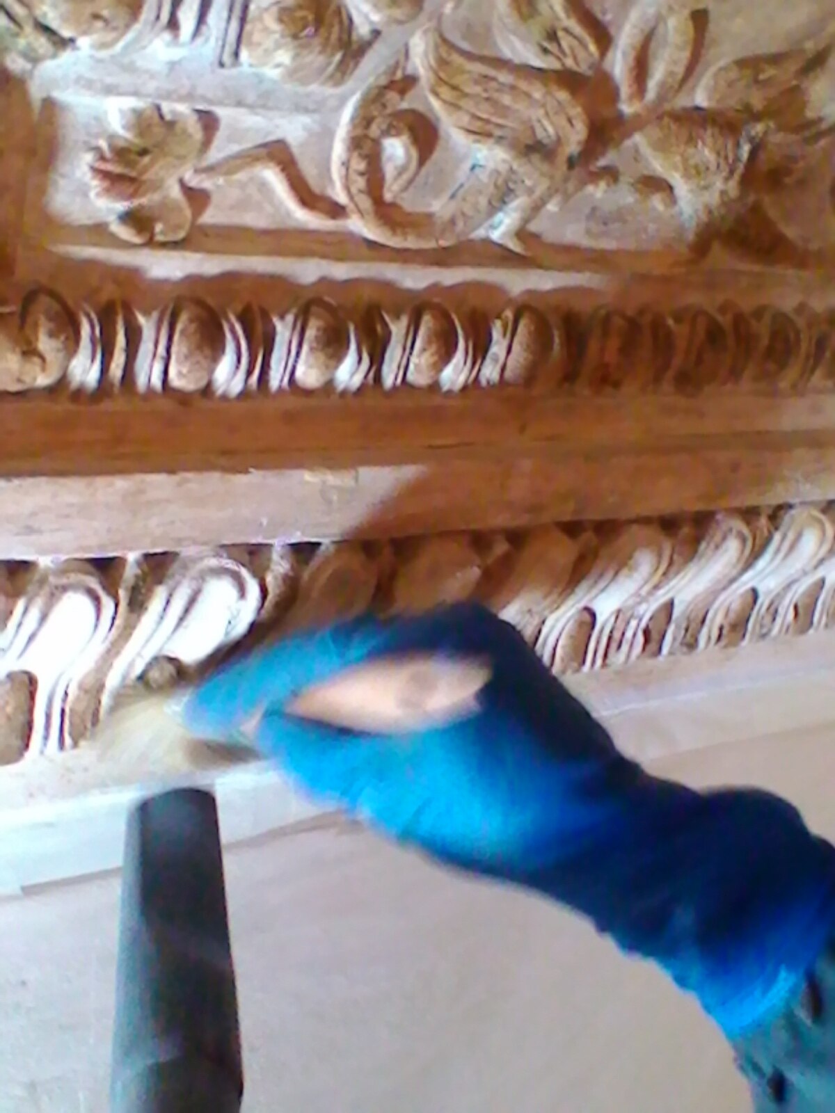 La pulitura. Ecco alcune immagini della pulitura e del consolidamento della parti in stucco staccate.