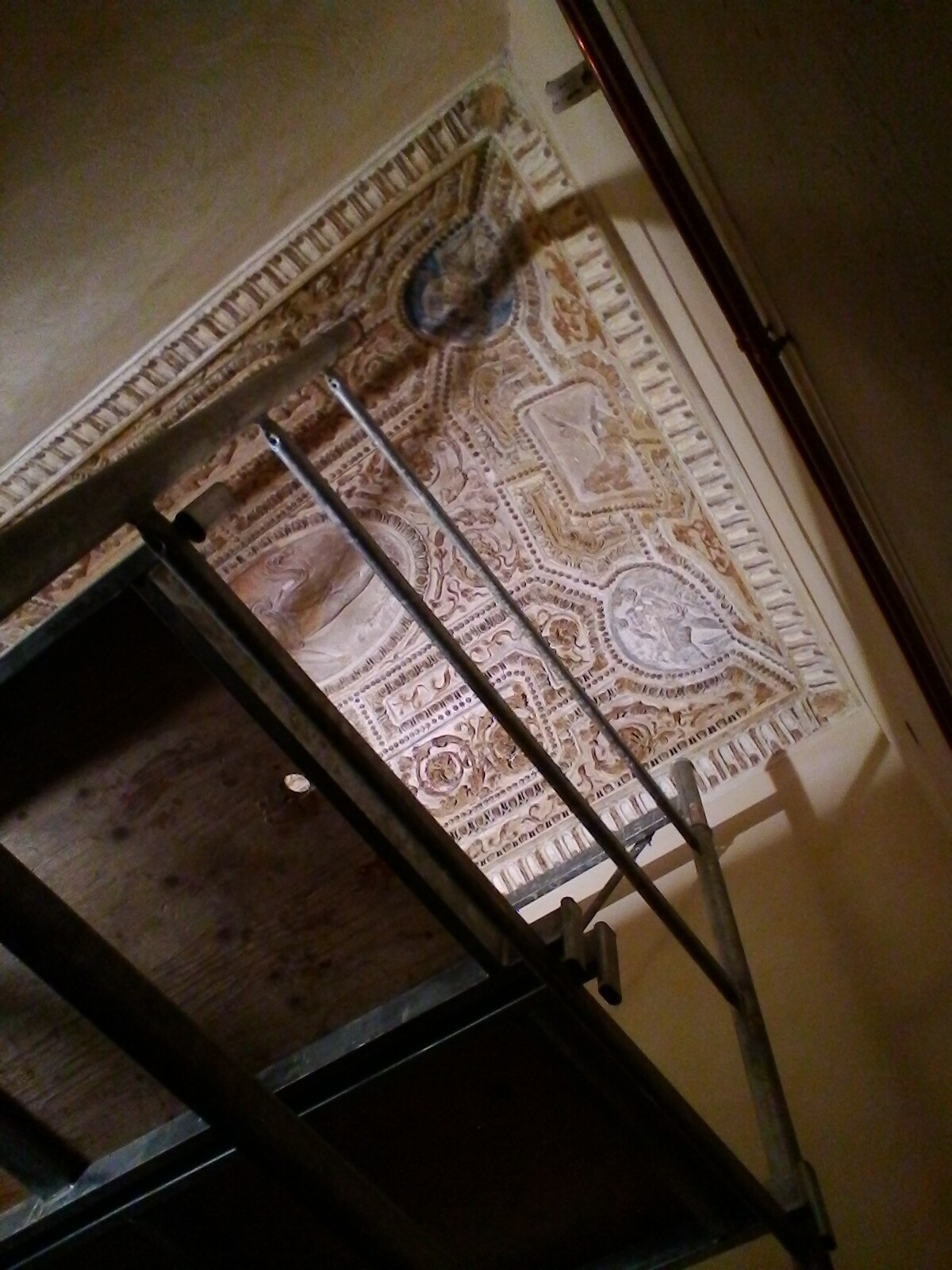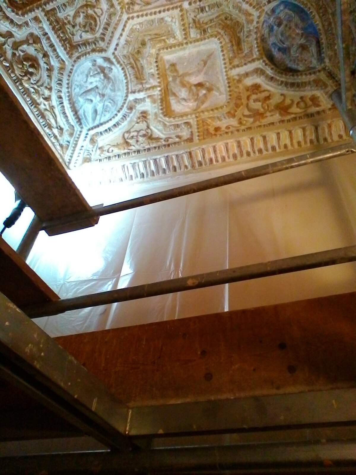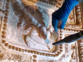 Al giro di boa. Ecco alcune immagini delle fasi di spolveratura, lavaggio, consolidamento, incollaggio e consolidamento della volta. Il restauro è circa a metà del suo percorso!