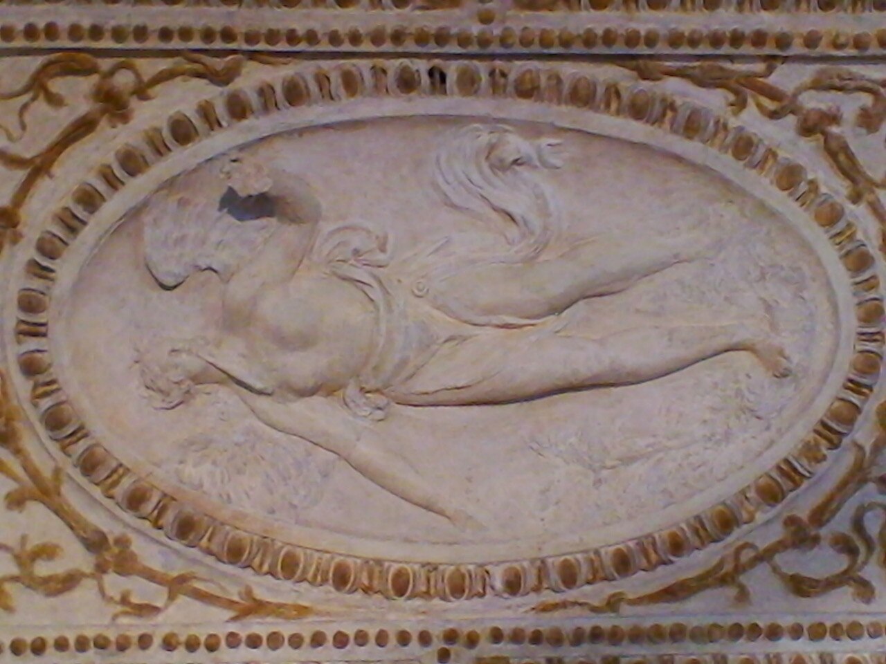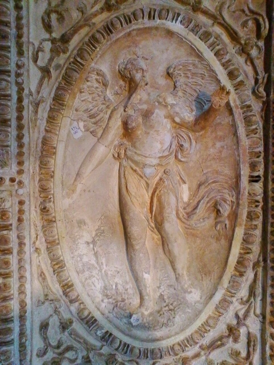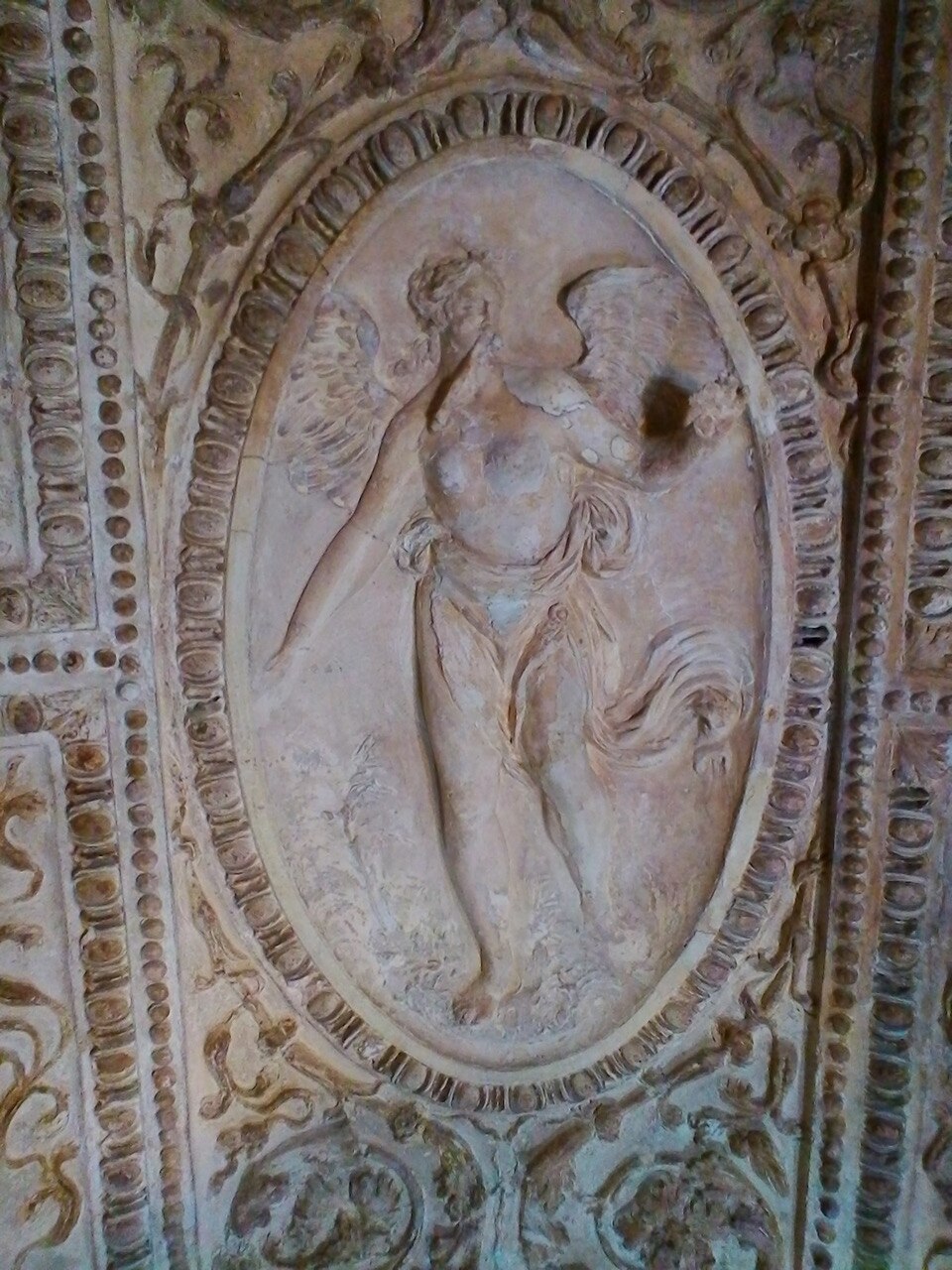 L’opera si distingue per grandiosità e bellezza, configurandosi come un viaggio ideale che percorre la storia dell’umanità. Una mescolanza disinvolta di temi sacri e profani, tra umano e divino, secondo la visione dell’uomo rinascimentale, per il quale classicità e cristianità sono strettamente legati attraverso un complesso sistema di rimandi allegorici. Tra l’inizio e la fine della narrazione si inseriscono la mitologia con la sala delle fatiche di Ercole e l’epica con la sala di Troia. A concludere il racconto il così detto “camerino della Vittoria” a ricordare la grandezza dell’età classica. Qui una maestosa Vittoria alata, armata di pilum, piccolo gavellotto d'epoca romana si staglia nel comparto centrale. Ai lati, compaiono due lunghi riquadri decorati con un elegante fregio a girali d’acanto. Sulla parete opposta all’ingresso, compare, sulla destra, l’ovale con Giove, il quadro centrale con una Figura allegorica femminile e un secondo ovale con Mercurio che trasporta Bacco bambino. Lungo il lato corto opposto, sono invece presenti l’ovale con Ares, il riquadro centrale che raffigura Leda e il cigno e l’ovale con la raffigurazione di Mercurio.