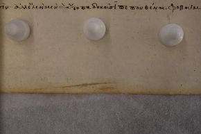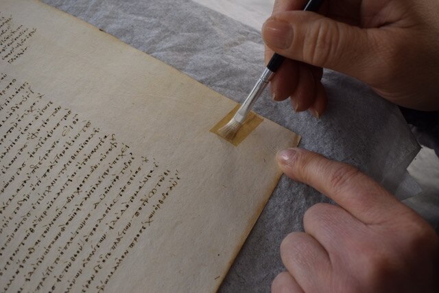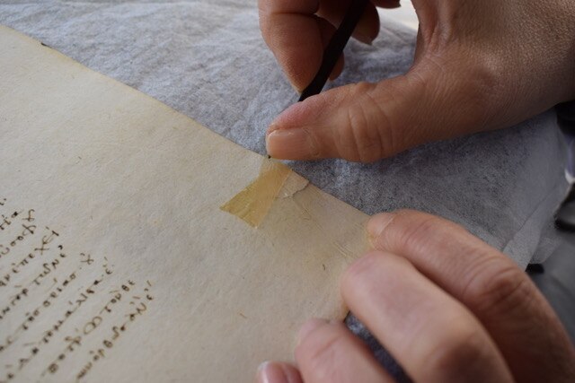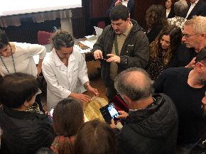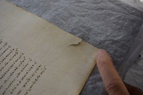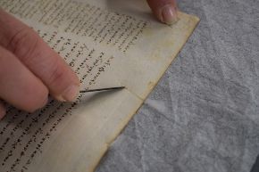 Un intervento di grande cesello. Ecco alcune immagini molto particolari e curiose, che mostrano le operazioni di inumidimento, rimozione degli interventi precedenti, rinsaldo della lacerazione, incollaggio dei bordi, rinsaldo con velo di carta giapponese, rifilatura del velo in eccesso, ed infine riposizionamento del supporto cartaceo.