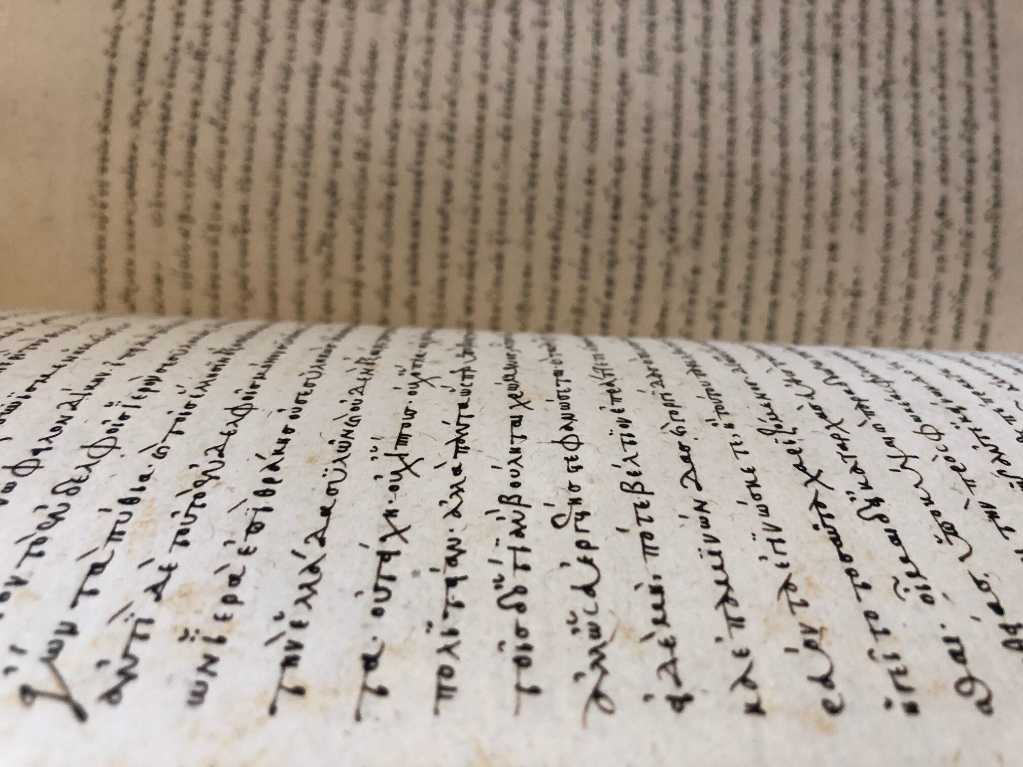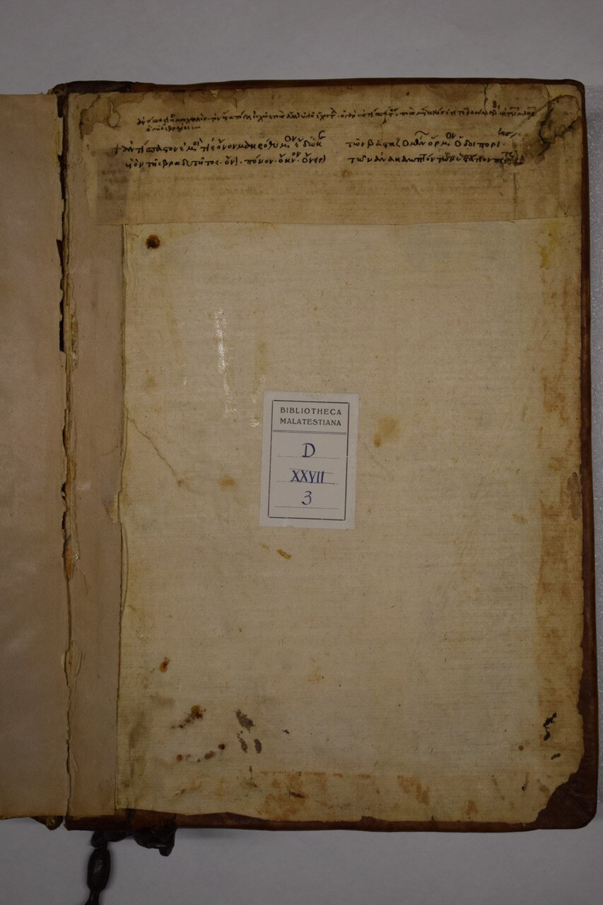 Il codice cartaceo D.XXVII.3 “Le orazioni del retore greco Aristide vissuto nel II sec. D.C” fu compilato da un unico copista. È composto da 366 carte di mm 310×230, redatto in minuscola.