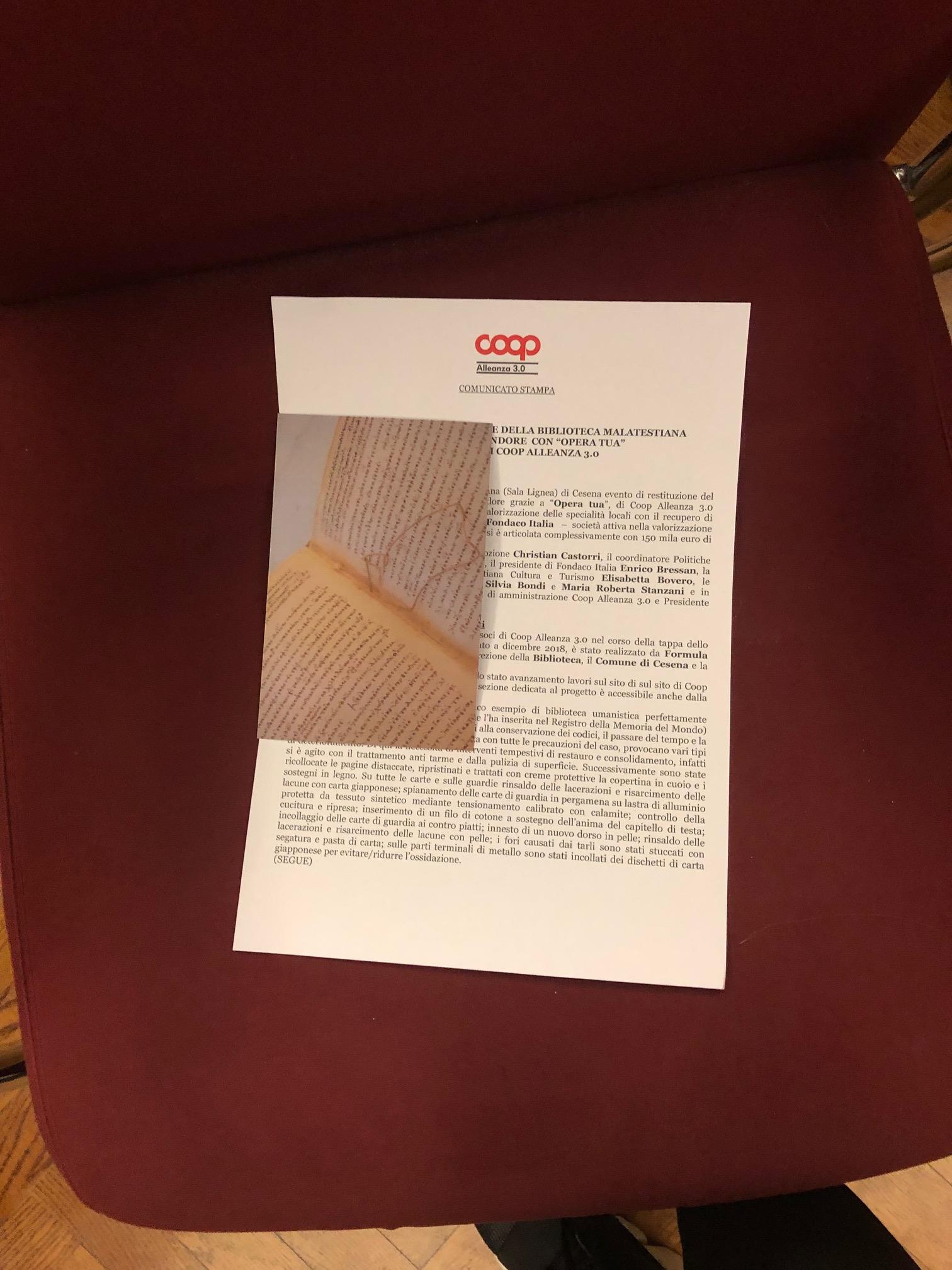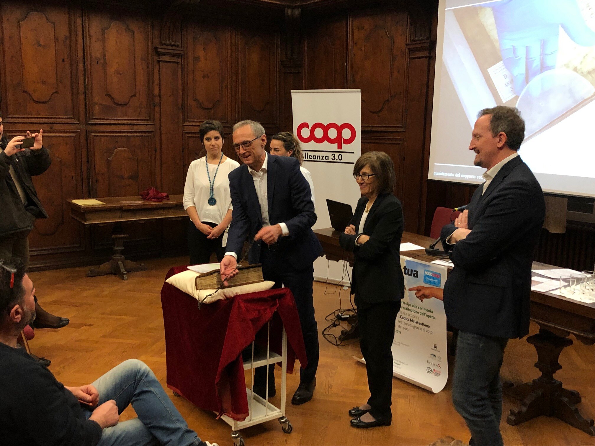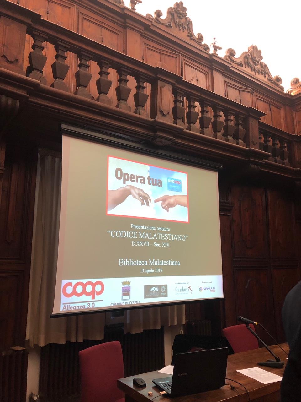 L'inaugurazione. Sabato 13 aprile si è tenuta presso la Biblioteca Malatestiana l'inaugurazione del Codice malatestiano, completamente restaurato. All’appuntamento hanno partecipato l’assessore comunale alla Cultura Christian Castorri, il coordinatore Politiche sociali Coop Alleanza 3.0 Enrico Quarello, il presidente di Fondaco Italia Enrico Bressan, la Dirigente del Servizio Biblioteca Malatestiana Cultura e Turismo Elisabetta Bovero, le responsabili del restauro Formula Servizi Silvia Bondi e Maria Roberta Stanzani e in rappresentanza dei soci Coop la Consigliera di amministrazione Coop Alleanza 3.0 e Presidente Zona soci Cesena Forlì, Veronica Bridi.