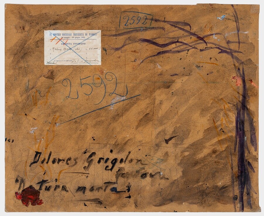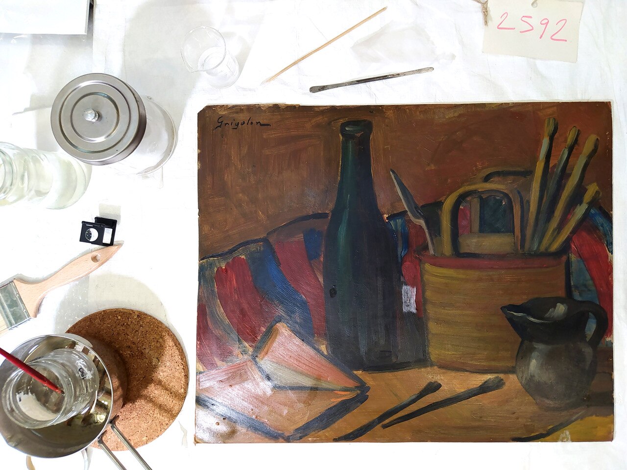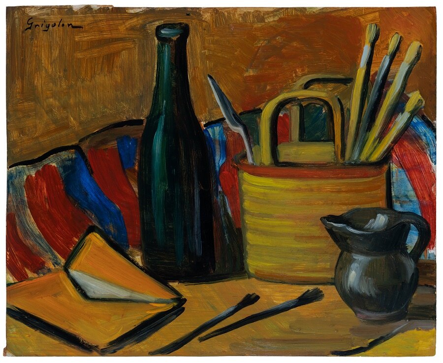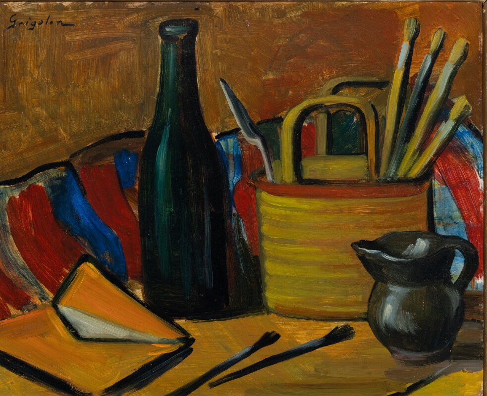 L'opera, esposta alla IX Biennale d'Arte Triveneta di Padova nel 1951, è eseguita ad olio su cartone e rappresenta il tavolo di lavoro di un pittore. La ricchezza cromatica, qualità per cui Dolores Grigolon si distinse nei suoi lavori, si accompagna qui alla solidità della composizione. I contorni degli oggetti raffigurati sono definiti con sicurezza da un segno nero che ne costruisce la struttura.