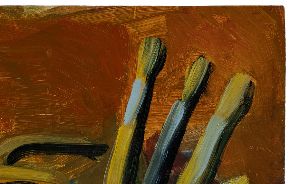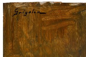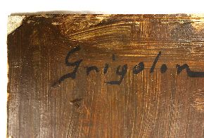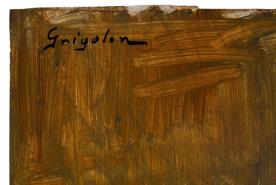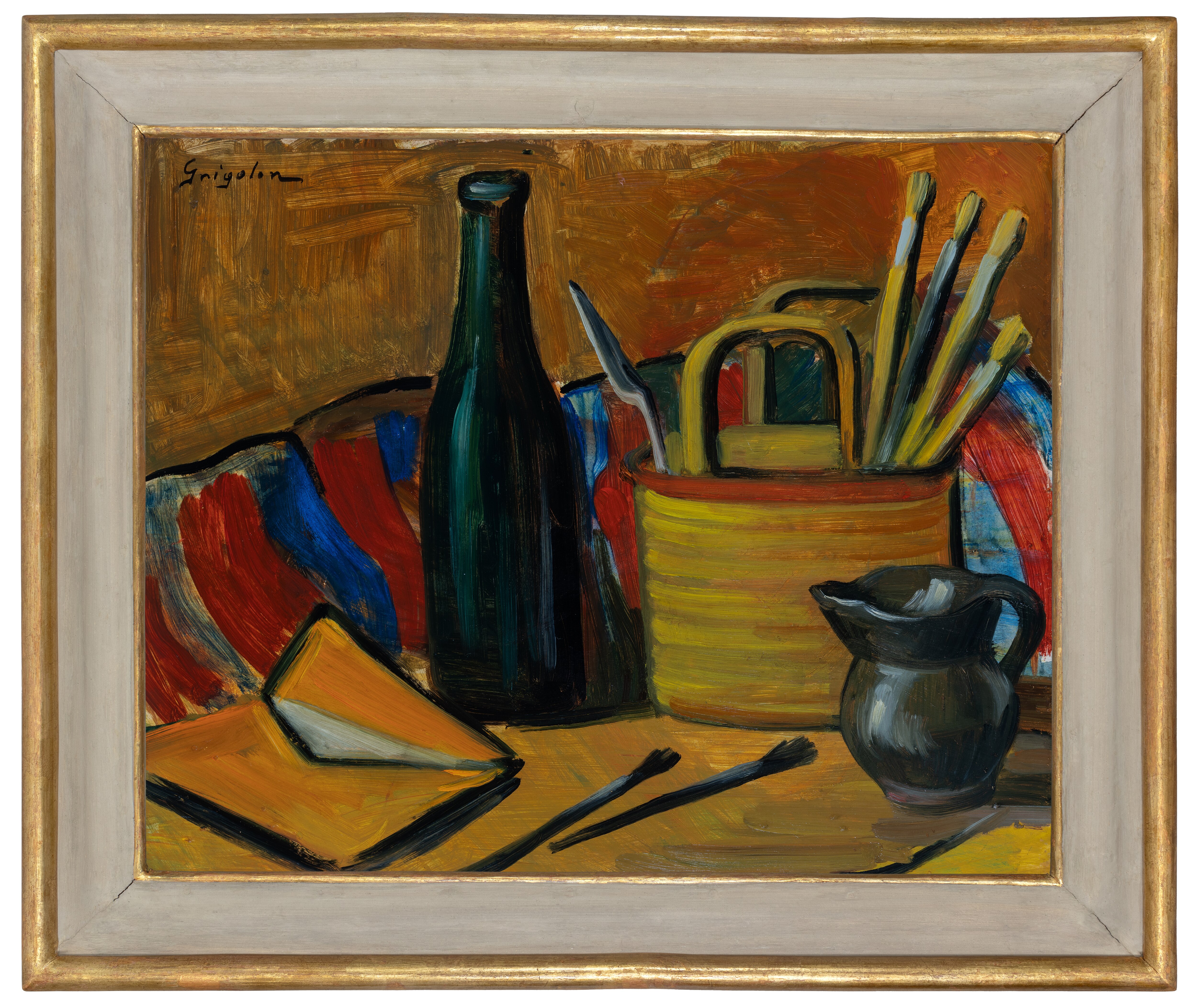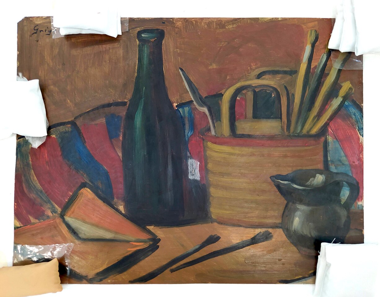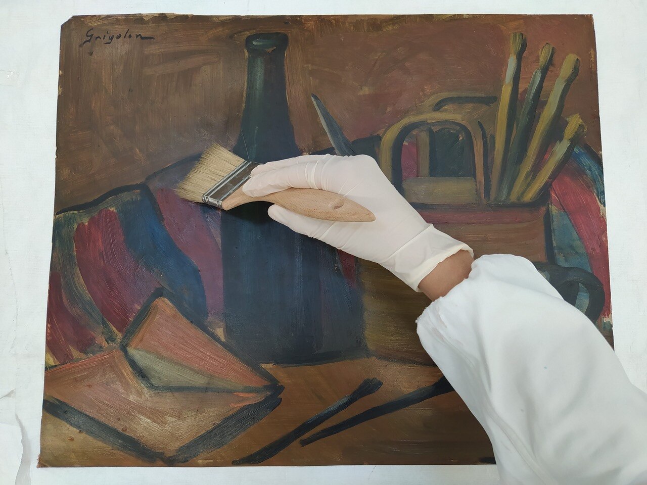 L'opera, esposta alla IX Biennale d'Arte Triveneta di Padova nel 1951, è eseguita ad olio su cartone e rappresenta il tavolo di lavoro di un pittore. La ricchezza cromatica, qualità per cui Dolores Grigolon si distinse nei suoi lavori, si accompagna qui alla solidità della composizione. I contorni degli oggetti raffigurati sono definiti con sicurezza da un segno nero che ne costruisce la struttura.