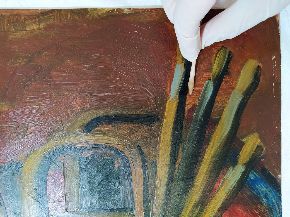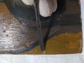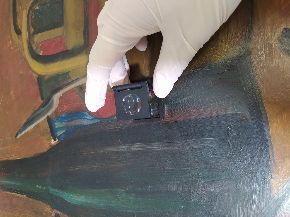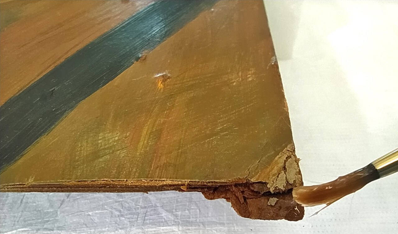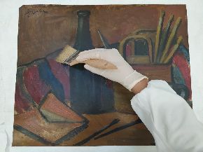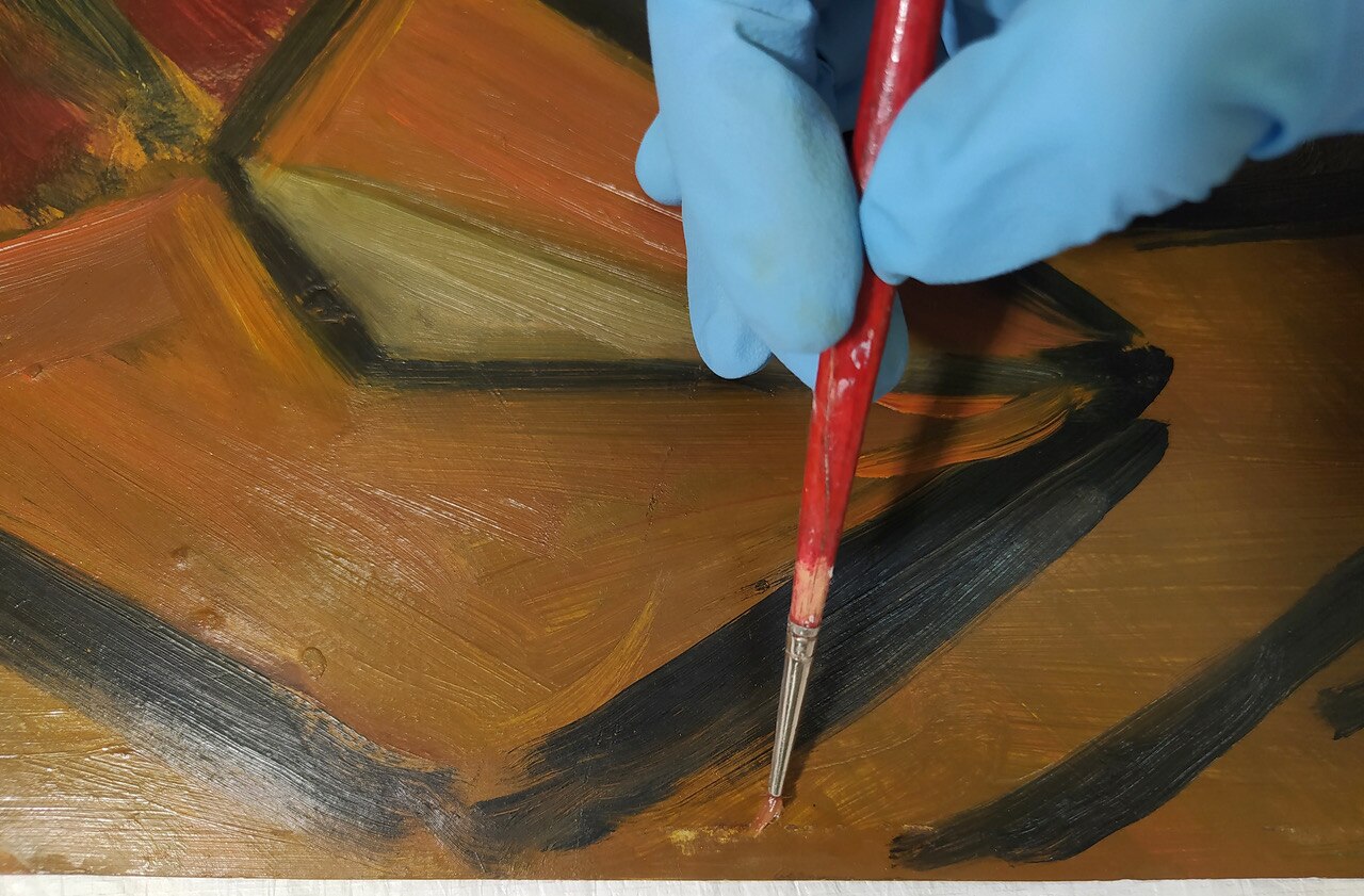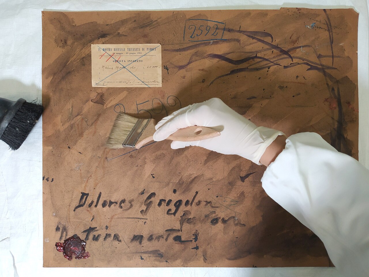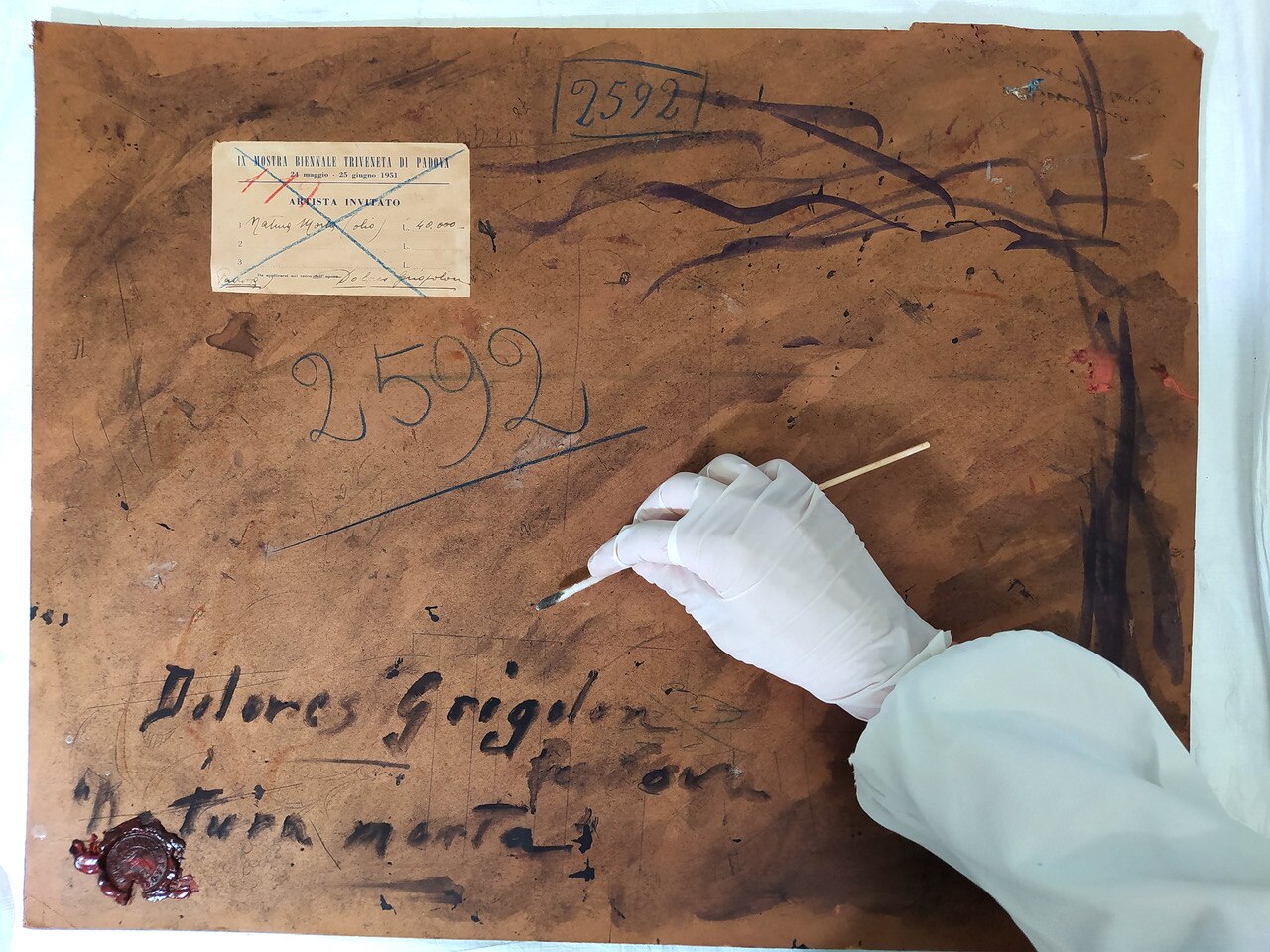 Al via il restauro. Ecco le immagini del ritiro e movimentazione dell'opera dal deposito del Museo d'Arte agli Eremitani di Padova. L'opera è stata sottoposta allo smontaggio della cornice dal dipinto, e all'osservazione ravvicinata e analisi dello stato di conservazione, allo stato di fatto. A seguito della spolveratura e rimozione del particellato incoerente con pennelli a setola morbida e aspiratore, sul recto e verso del dipinto e della cornice (con cautela laddove ci sono distacchi di colore), sulla pellicola pittorica del dipinto sono stati attuati fermatura e consolidamento localizzato in corrispondenza dei distacchi e sollevamenti di colore con resina sintetica in soluzione, velinatura di protezione e riadesione a caldo mediante l'utilizzo del termocauterio. Si è quindi proceduto alla pulitura con tensioattivo della superficie pittorica del dipinto e del supporto in cartone sul retro, alla rimozione delle sgocciolature di cera, al successivo incollaggio dei frammenti in distacco del sigillo in ceralacca presente sul verso del dipinto e infine al consolidamento e riadesione dei bordi frastagliati, scomposti o piegati del supporto in cartone, con adesivo cellulosico e asciugatura sotto peso. L'intervento è eseguito dalla restauratrice Valeria Saccarola.