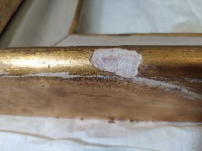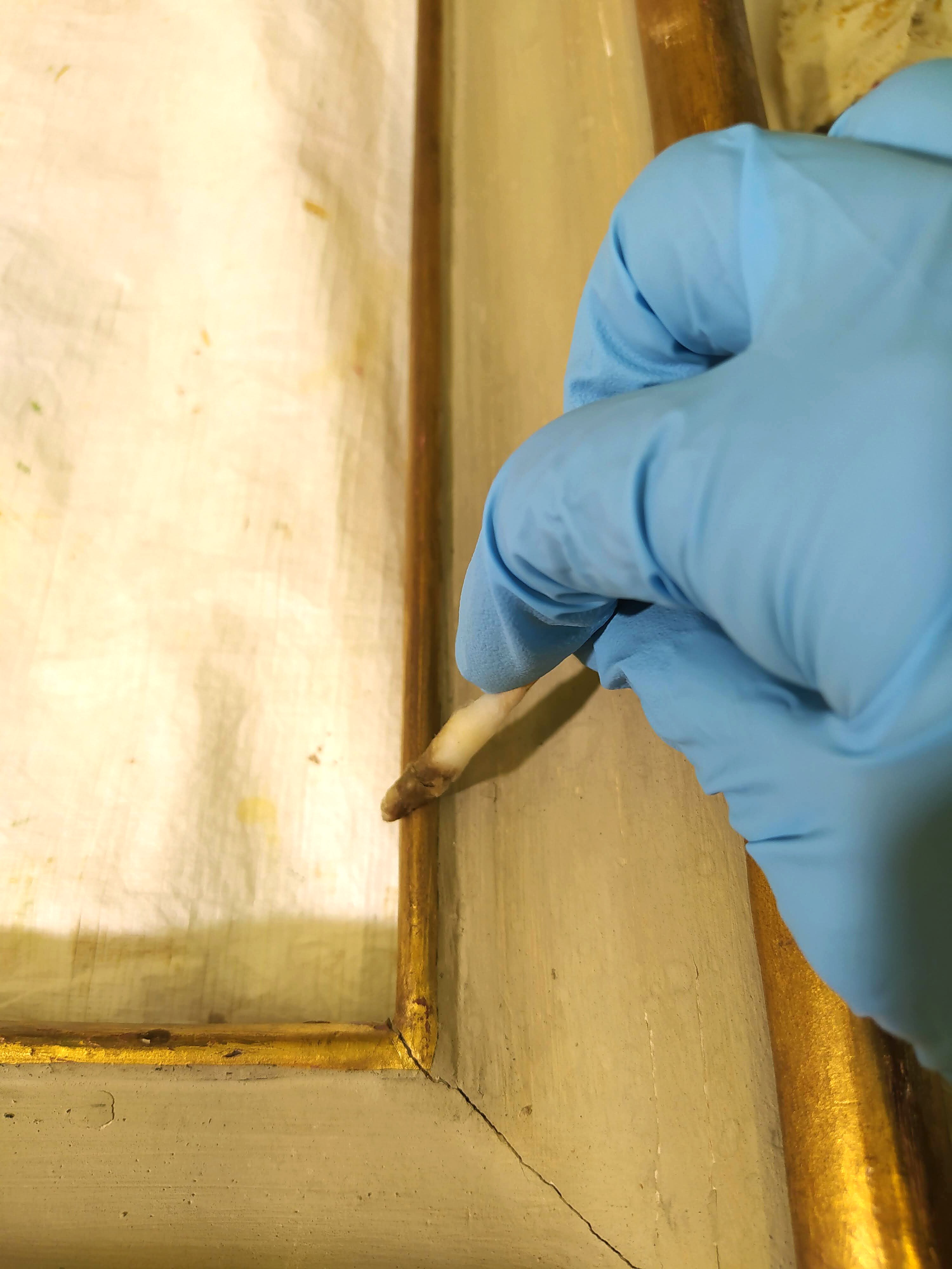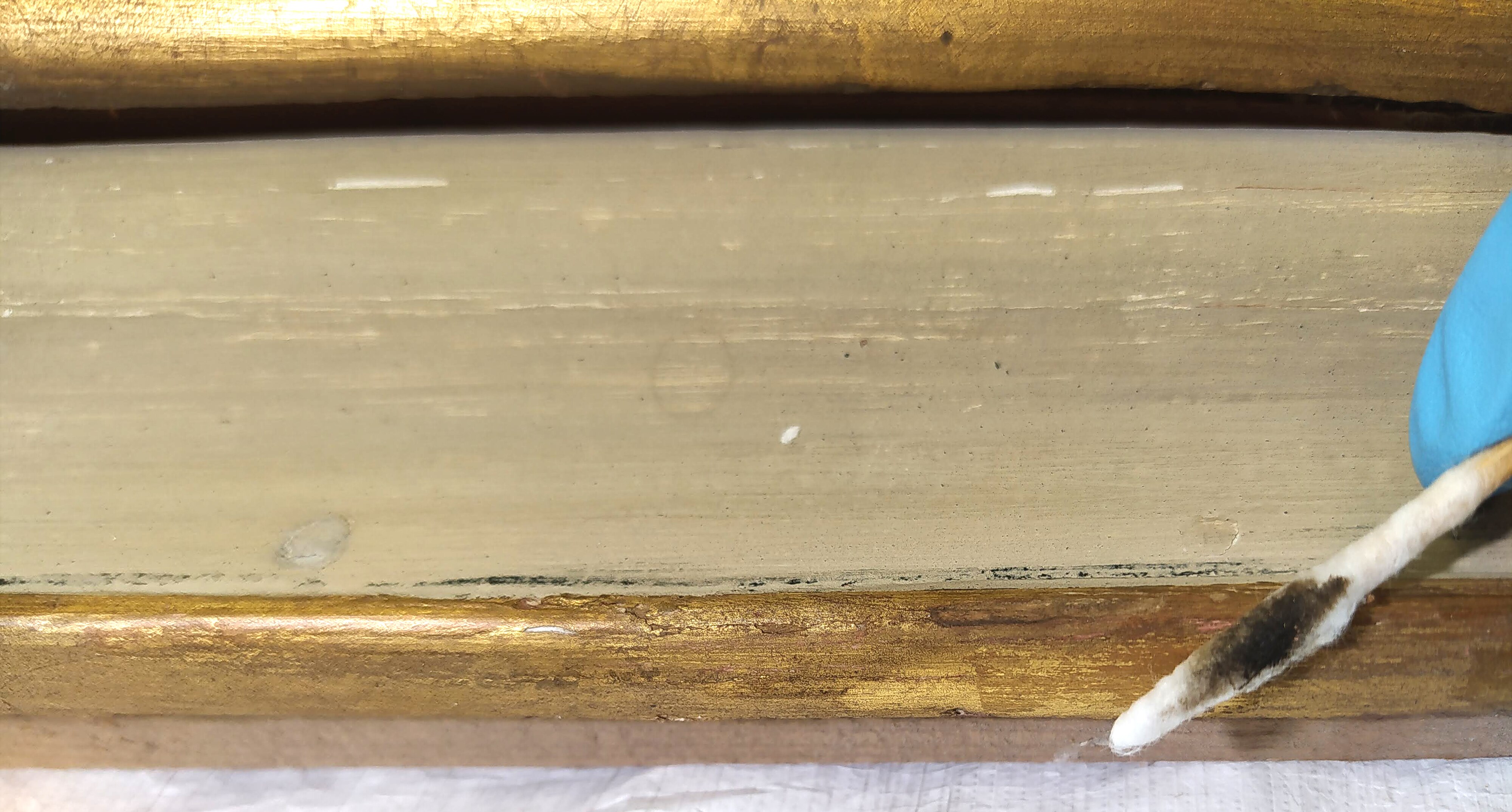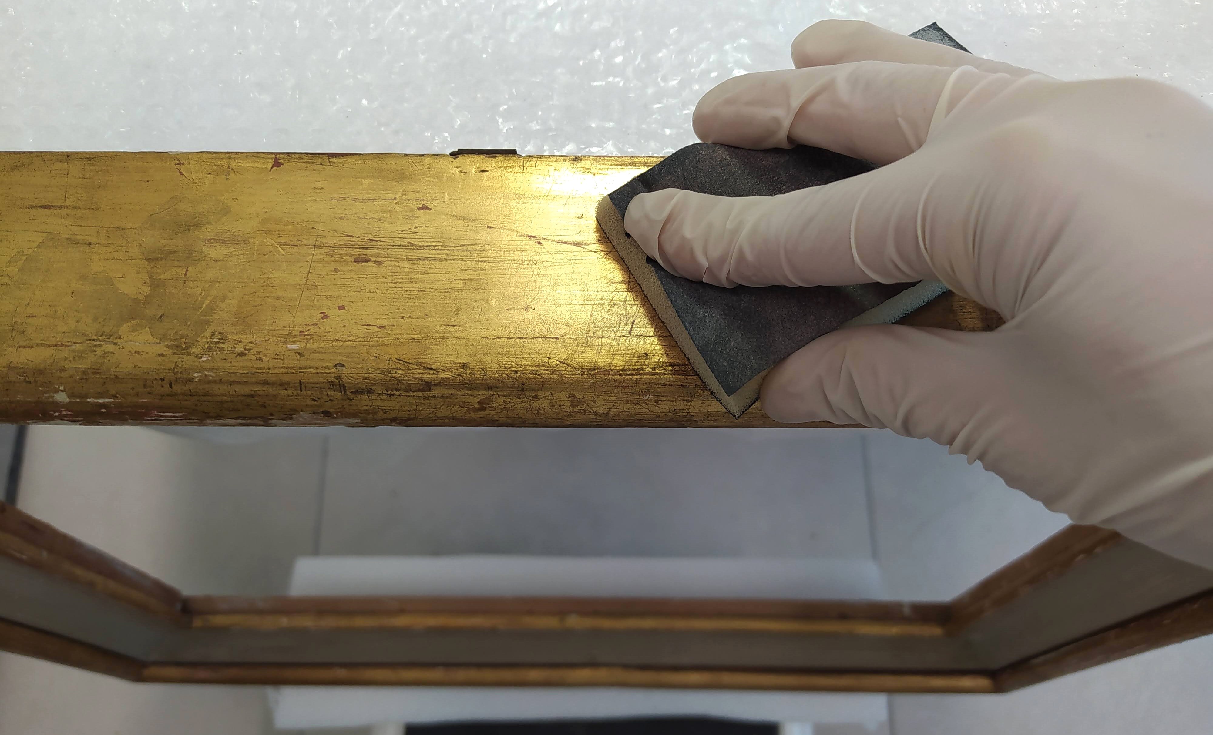 Il restauro al suo sprint finale. Procedono velocemente le operazioni di restauro, che vedono nelle immagini la pulitura, stuccatura e consolidamento della cornice, la stuccatura completa di rimozione di precedenti stuccature incongrue, e particolari degli interventi di ritocco.