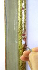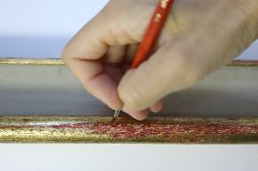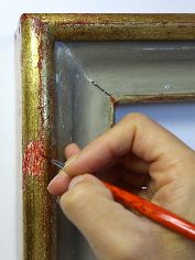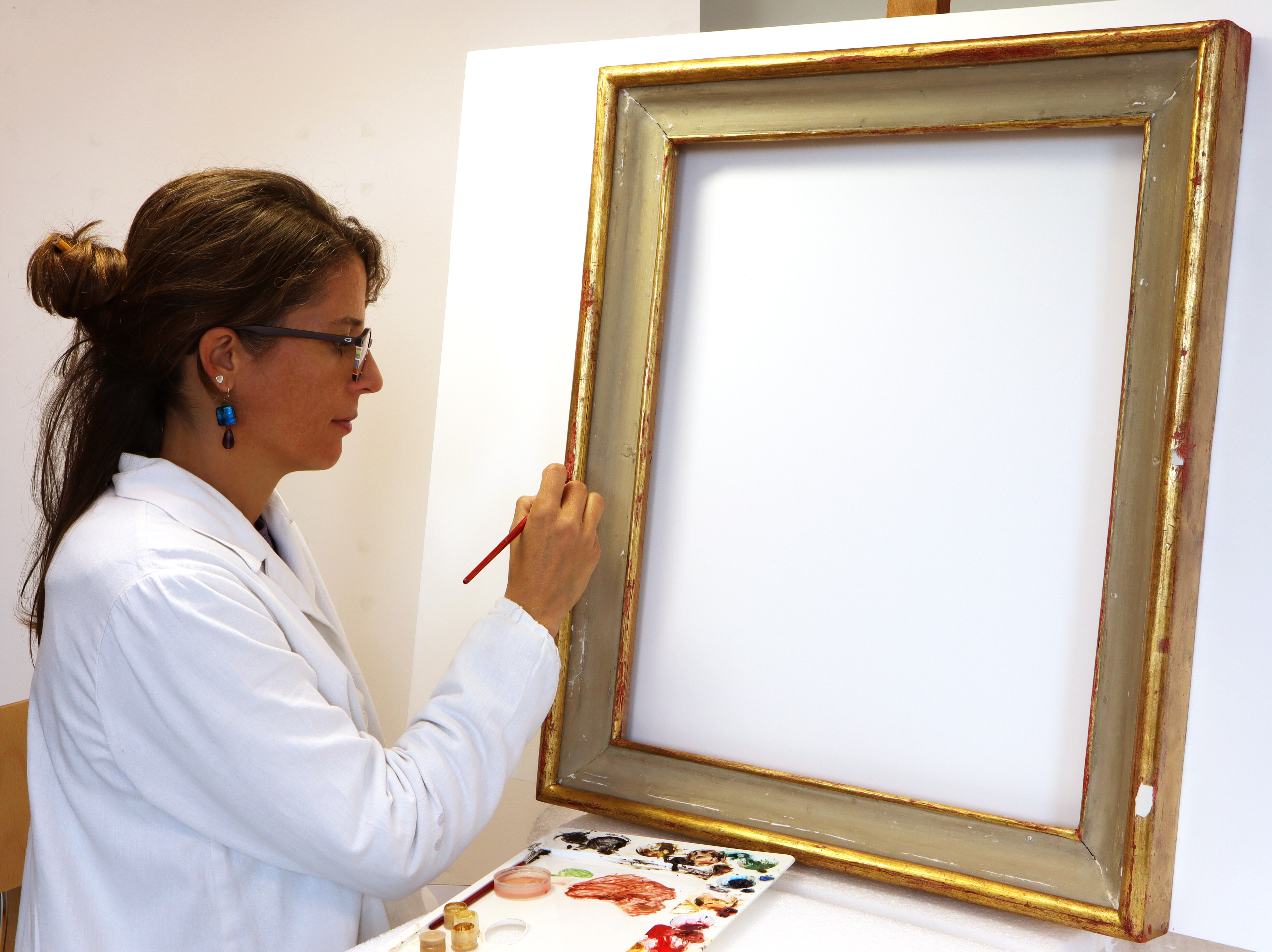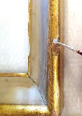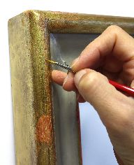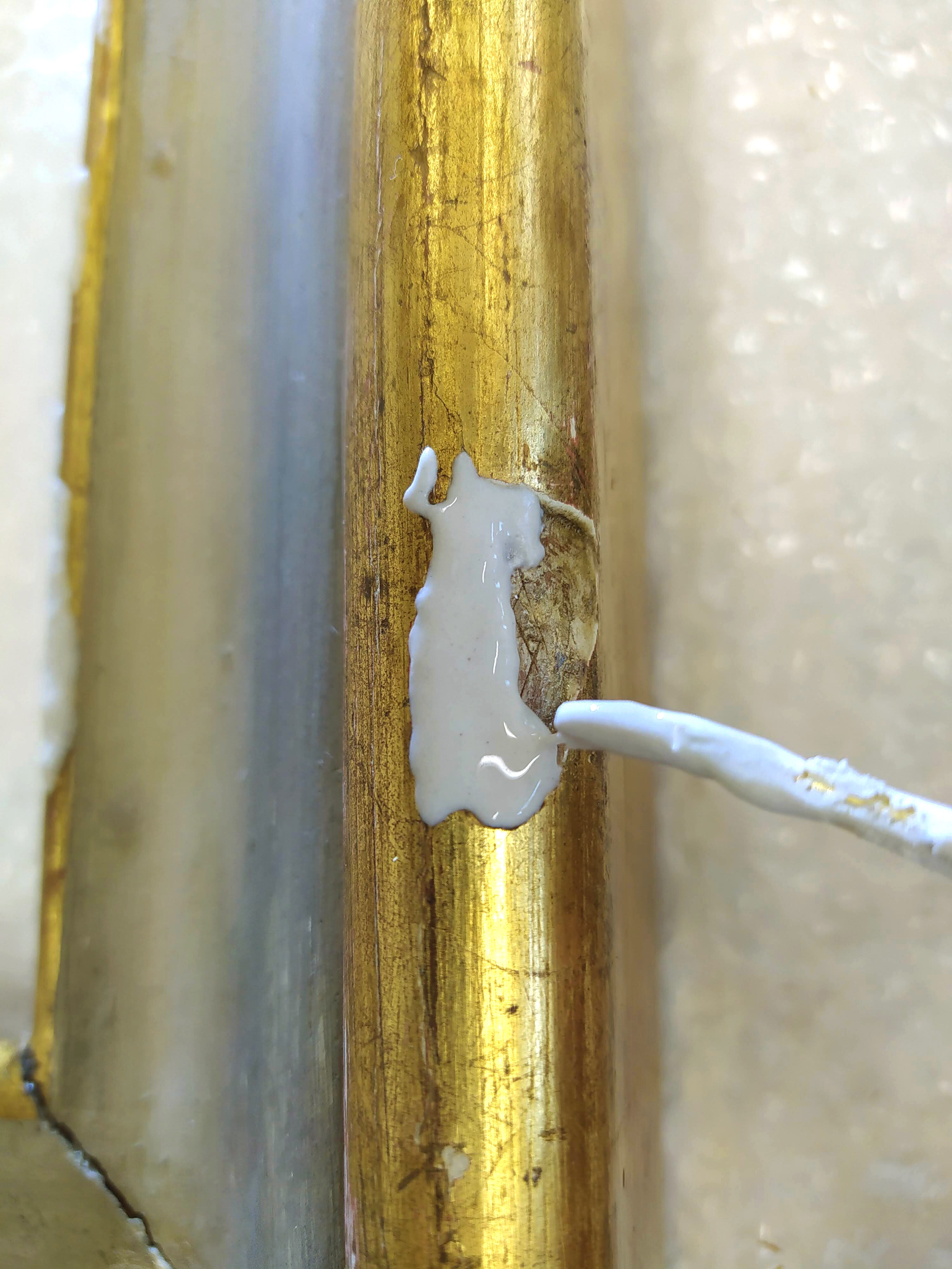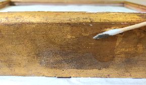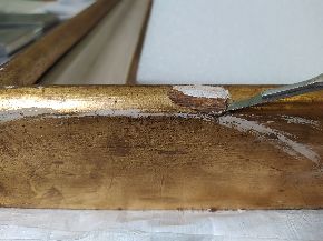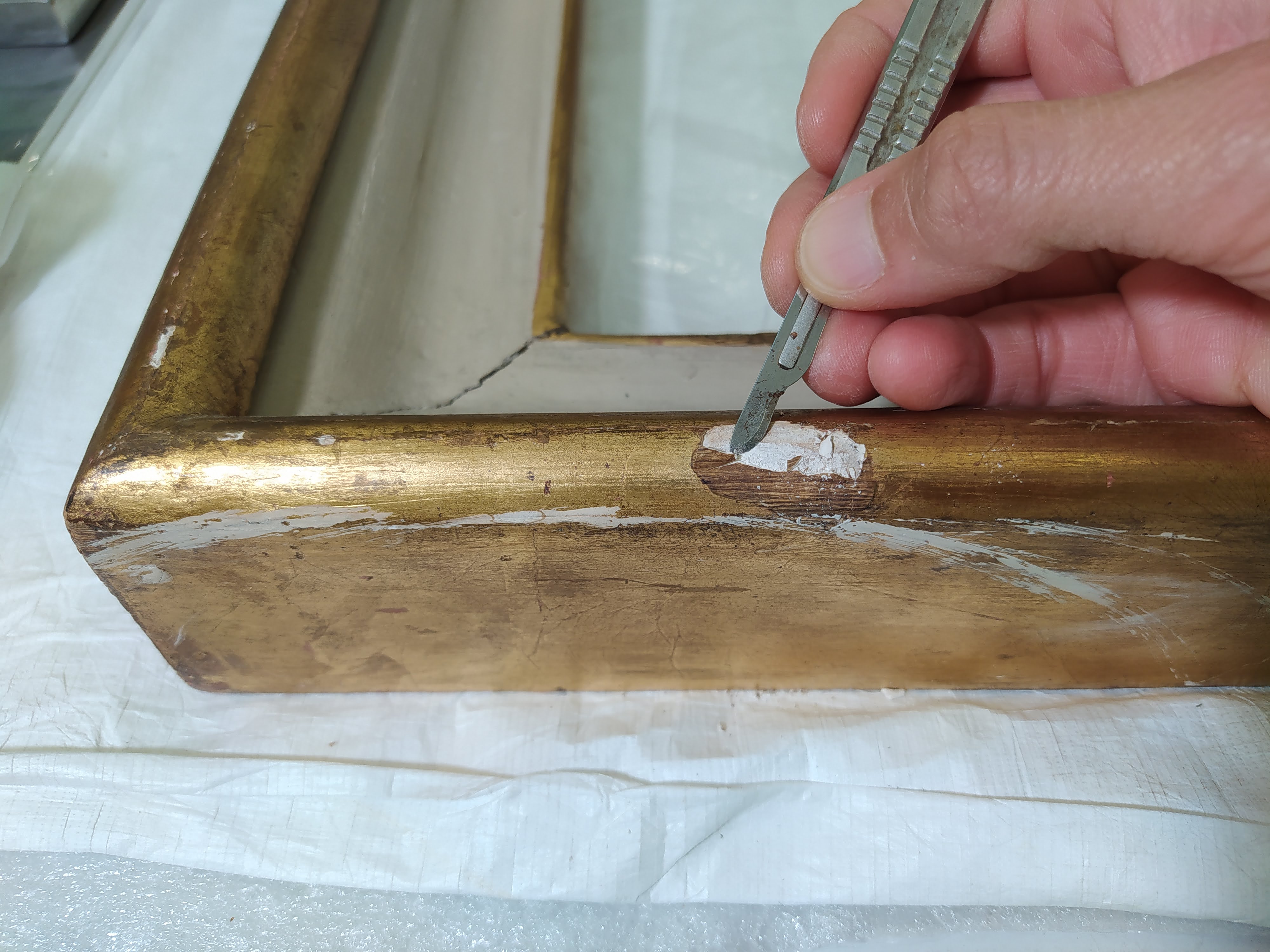 Il restauro al suo sprint finale. Procedono velocemente le operazioni di restauro, che vedono nelle immagini la pulitura, stuccatura e consolidamento della cornice, la stuccatura completa di rimozione di precedenti stuccature incongrue, e particolari degli interventi di ritocco.