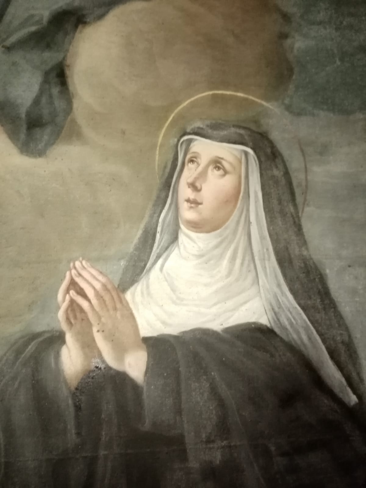 La pala d'altare è proveniente dalla chiesa del monastero femminile di San Giuliano di Fermo. È l'unica opera sicuramente attribuibile a una pittrice che è conservata nella raccolta della città ed è esposta al primo piano di Palazzo dei Priori. L'iconografia è quella vicina al contesto originario del monastero legato alla spiritualità avellanita a cui è riconducibile il san Romualdo, mentre santa Scolastica si configura come ideale protettrice della comunità femminile.