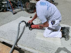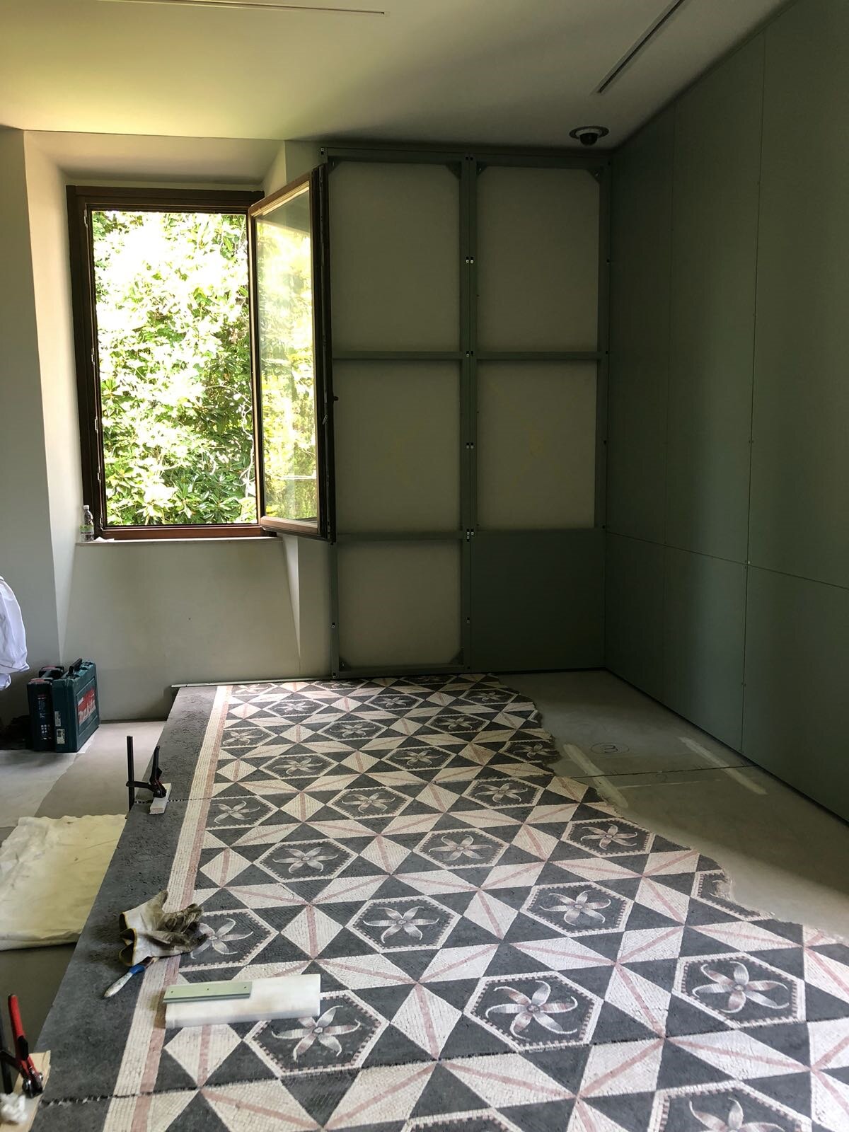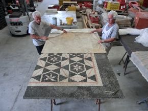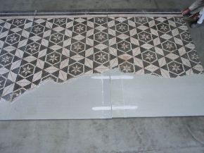I lavori sono quasi terminati. Stiamo procedendo al taglio sul retro del vecchio supporto in cemento, al capovolgimento di ciascun pannello musivo fissato sul nuovo supporto in aerolam, quindi alla rimozione del velatino di cotone dalla superficie dei mosaici e alle prove di accostamento dei pannelli prima delle fasi di assemblaggio e restauro finale.