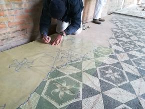 Via ai lavori! Ad Aquileia iniziano le prime fasi di restauro del mosaico a nido d’ape, attività che verrà eseguita dalla Ditta Diego Malvestito Concordia Sagittaria (Ve). Dopo la ricomposizione grafica delle parti mancanti su acetato scala 1:1 e il rilievo fotografico, è stato eseguito il taglio in due parti del mosaico, per effettuare lo stacco dall’attuale supporto in ferro e cemento non più idoneo a sostenere l’opera: verrà realizzato un supporto nuovo in aerolam a nido d’ape in alluminio spessore 3 cm. Infine, è stato effettuato il fissaggio delle parti staccate per predisporre il mosaico alla prima pulitura in laboratorio.