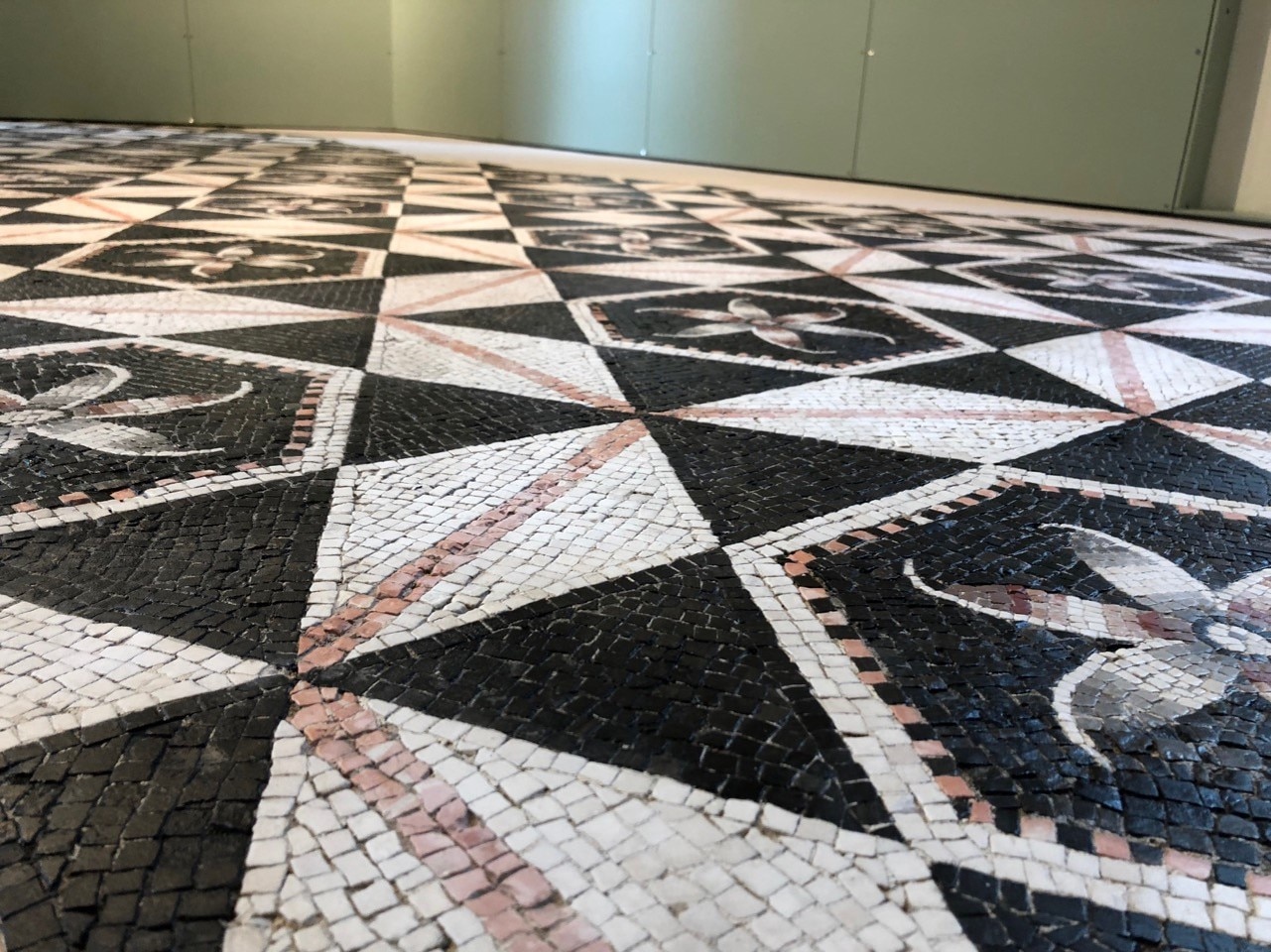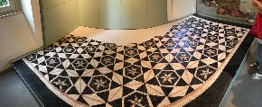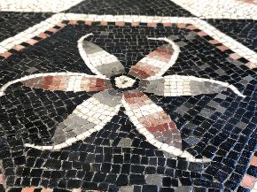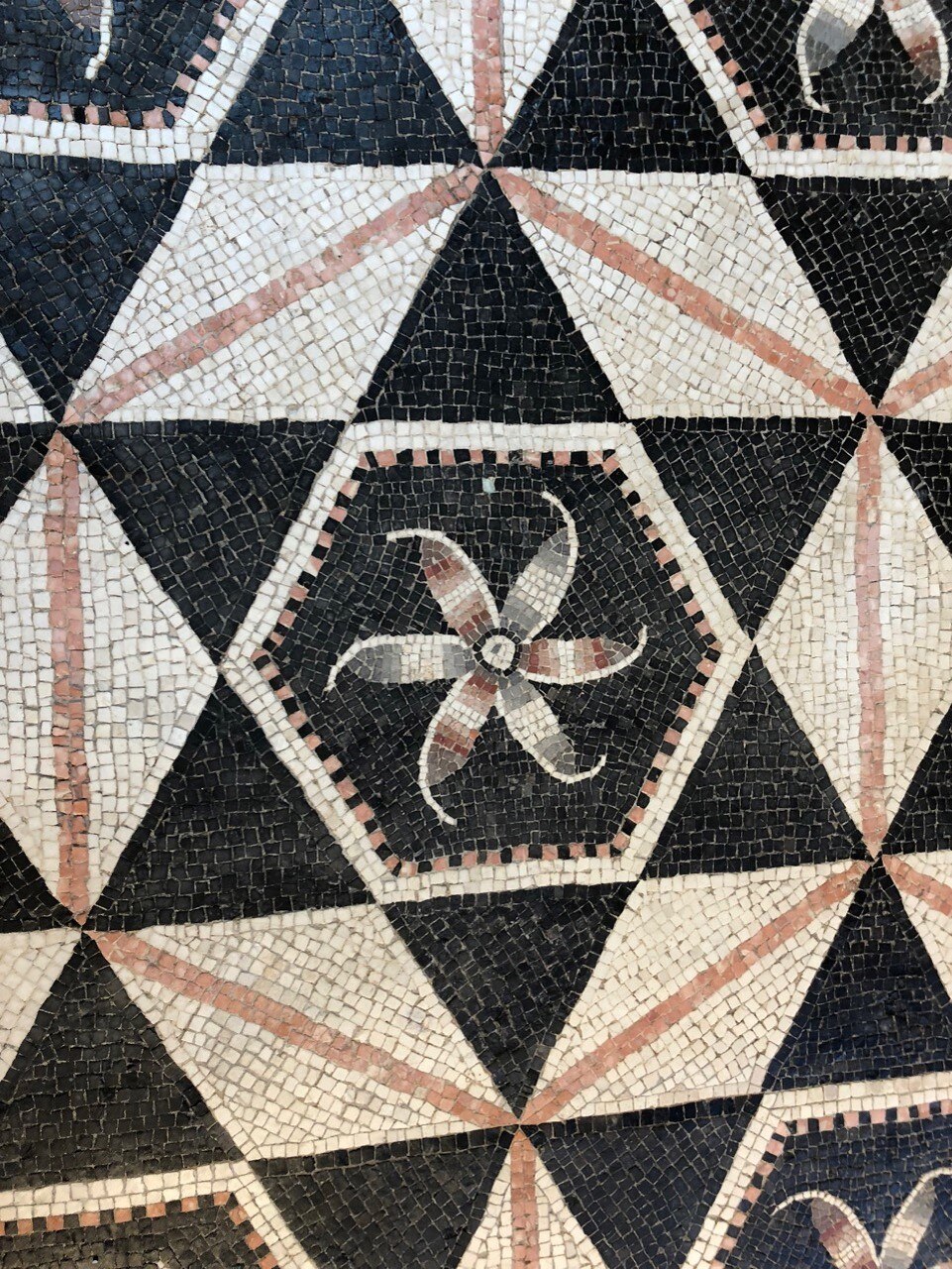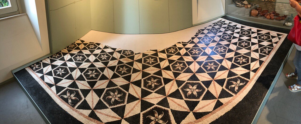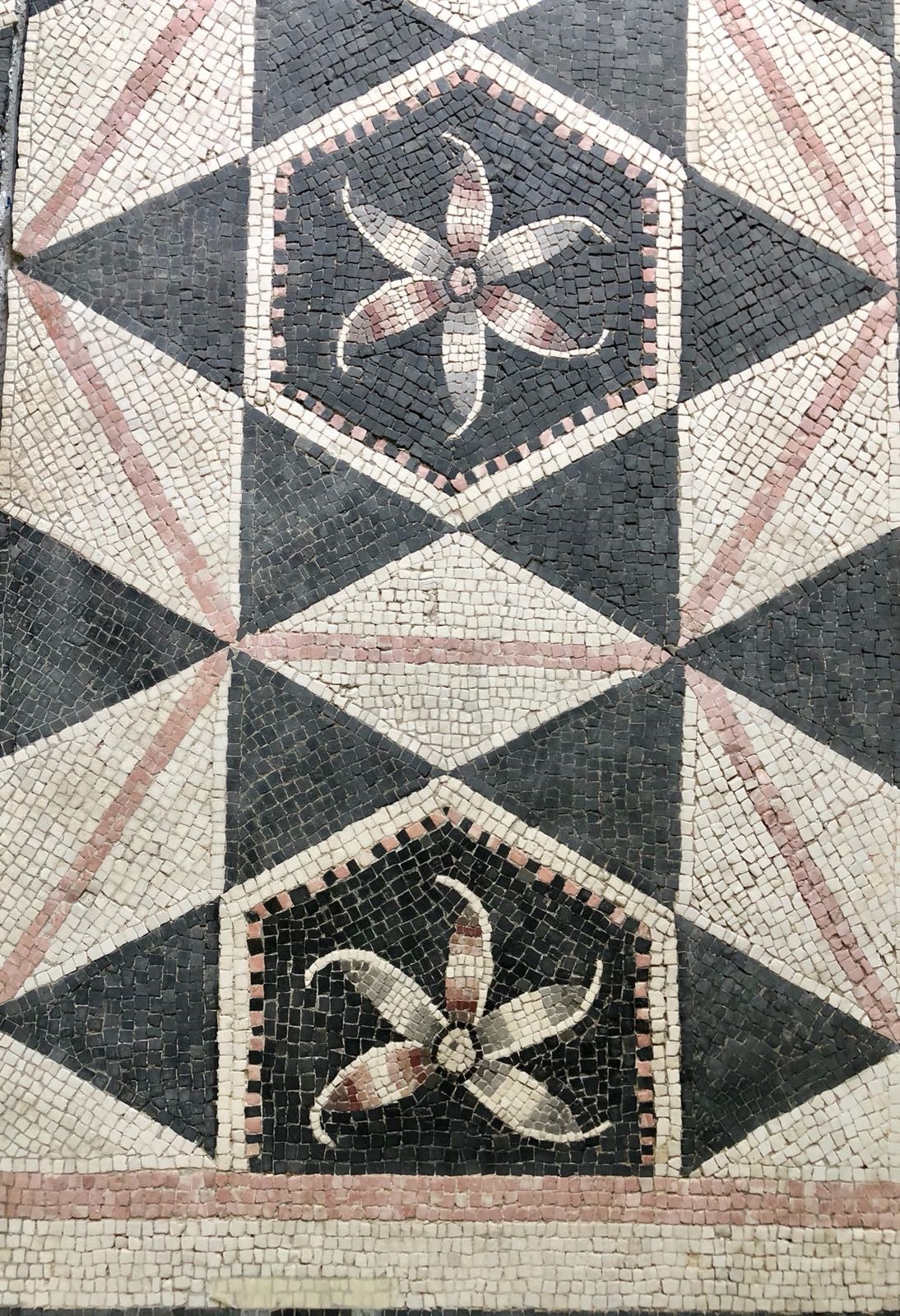 Un mosaico dalla raffinata decorazione geometrica, arricchita da fiori policromi di sei foglie, le cui estremità rialzate creano un effetto prospettico e illusionistico di movimento. Il motivo decorativo è ispirato ai modelli di origine ellenistica. Il pavimento decorava una ricca abitazione aquileiese, situata vicino al porto fluviale, e documenta la ricchezza della città durante l’età romana.