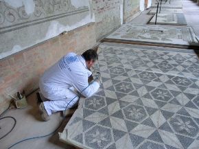 L’intervento prevede un’attenta pulizia dalle patine depositatesi durante la lunga esposizione sotto i portici del giardino del Museo Archeologico. Il mosaico verrà poi staccato dalla piattaforma in cemento sul quale si trova e sarà adagiato su una base in materiale leggero per garantirne una più adeguata conservazione.
