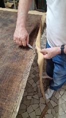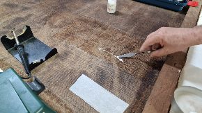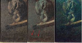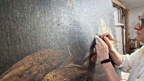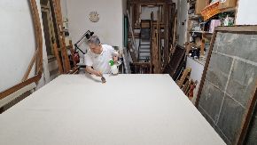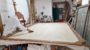 Il riposizionamento. Ecco le immagini delle operazioni di riposizionamento e quindi del tensionamento sul nuovo telaio dell’opera, dell’asporto della carta giapponese ed il ritocco della verniciatura.