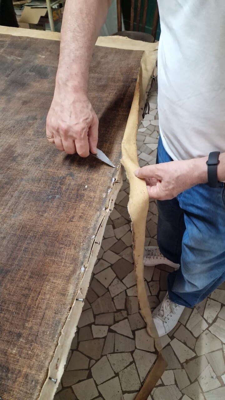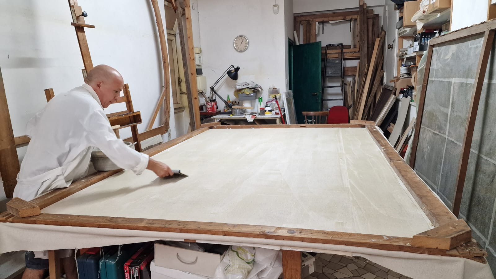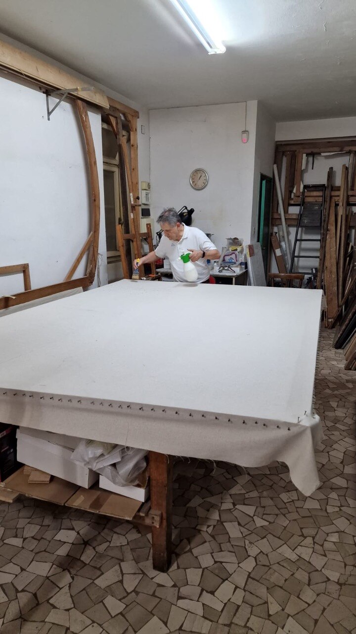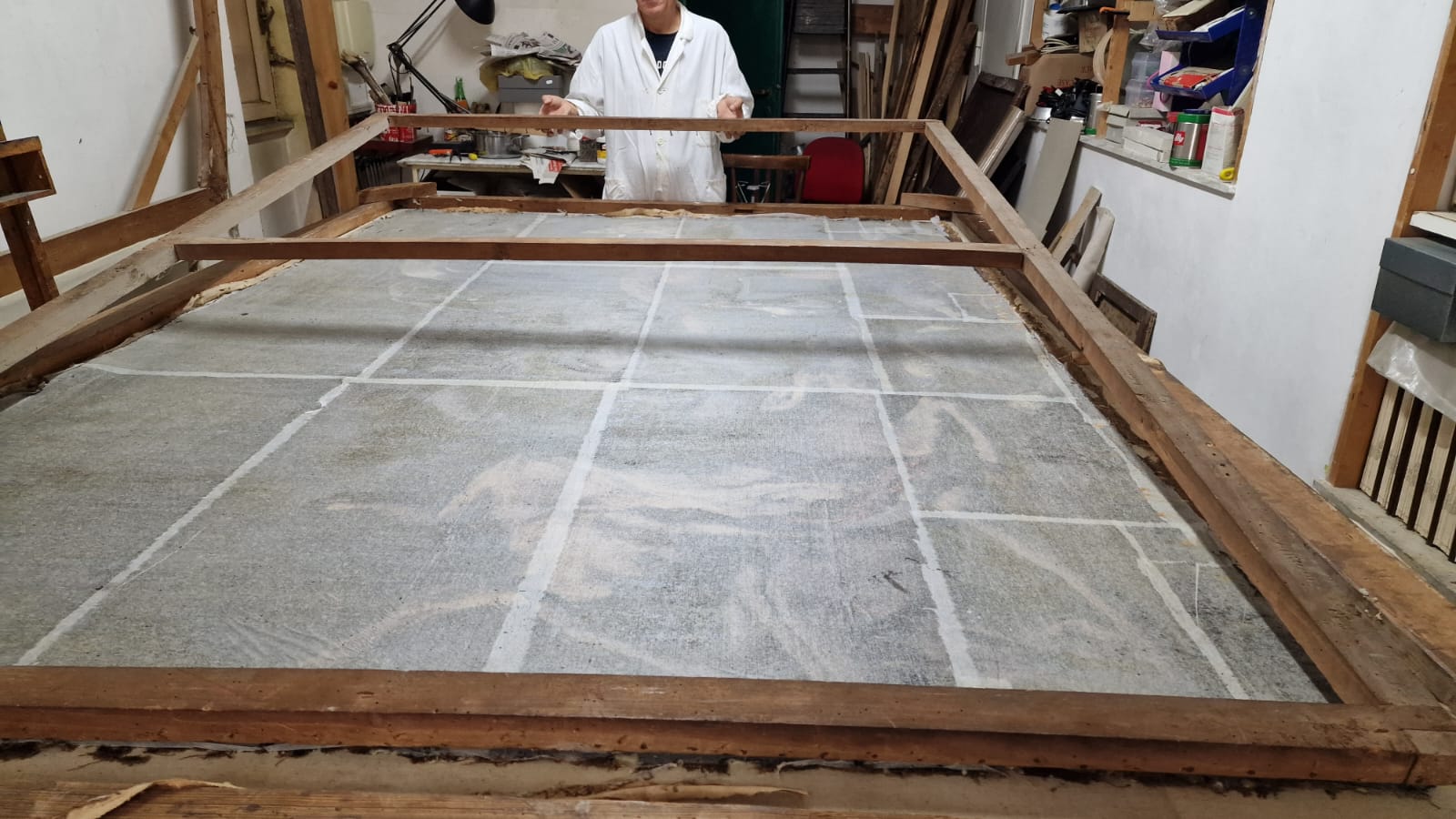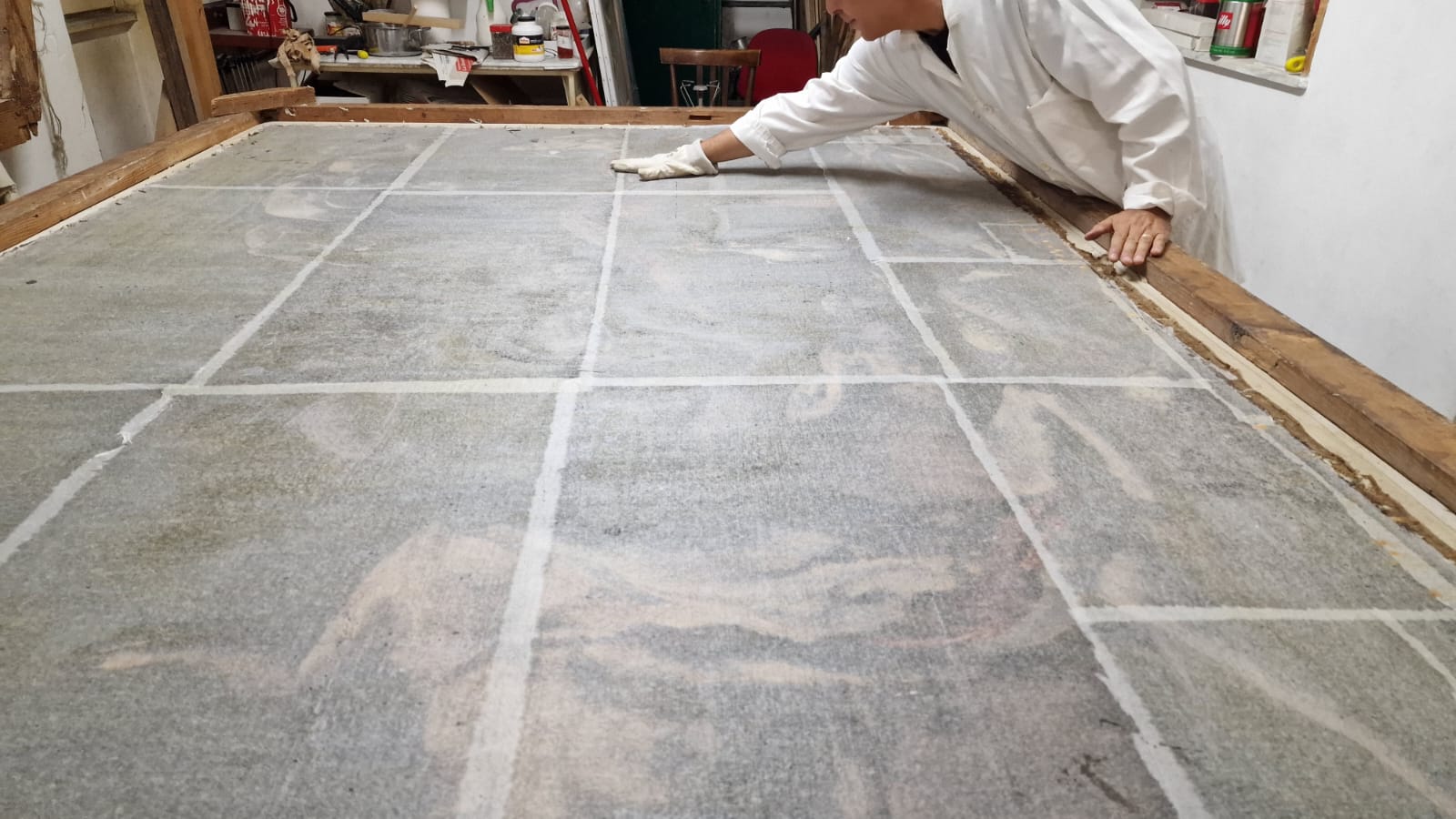 Verso il termine del restauro. Ecco le immagini delle operazioni di velinatura, il nuovo telo di supporto ed il nuovo telaio.