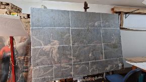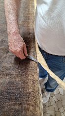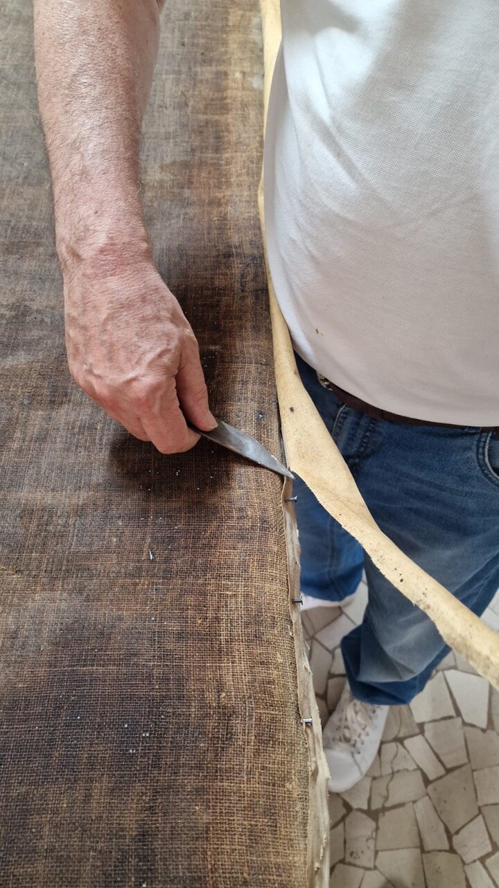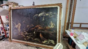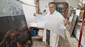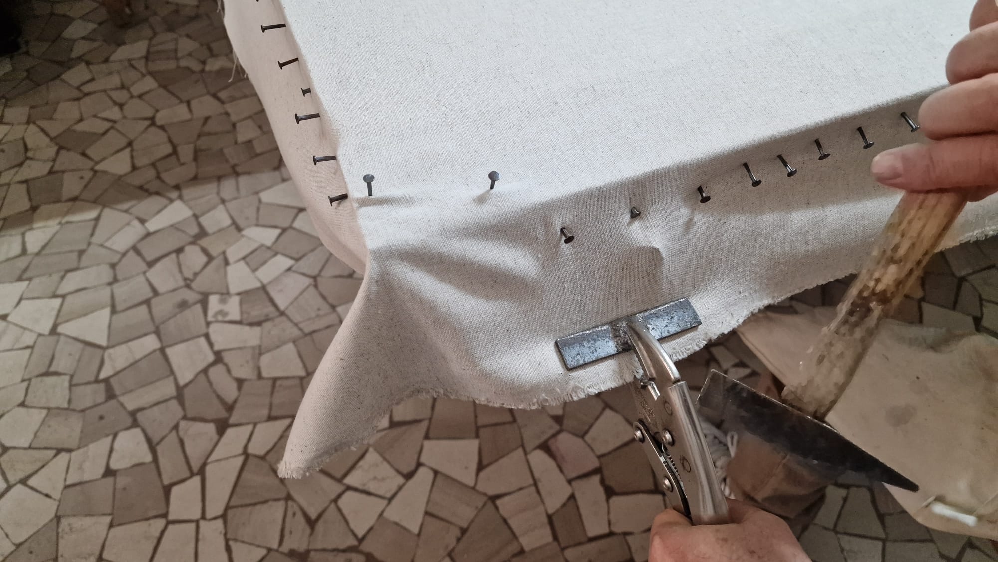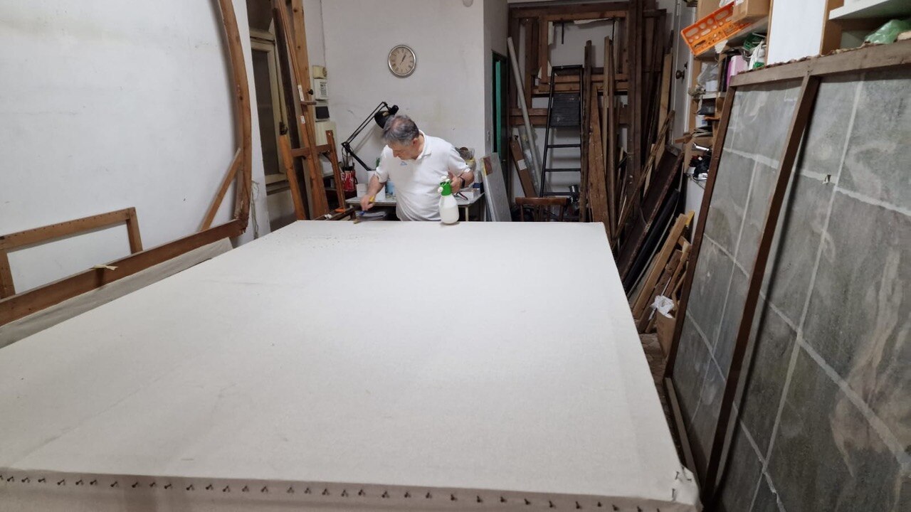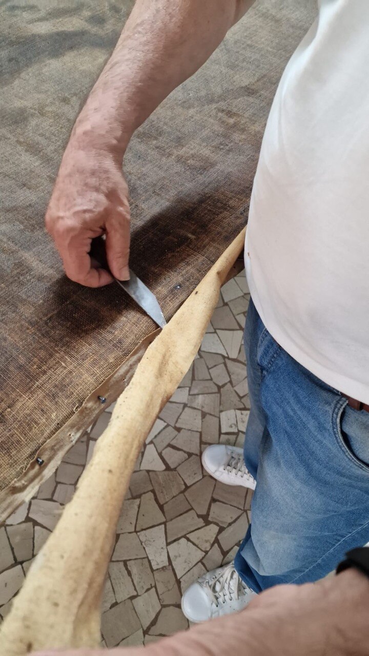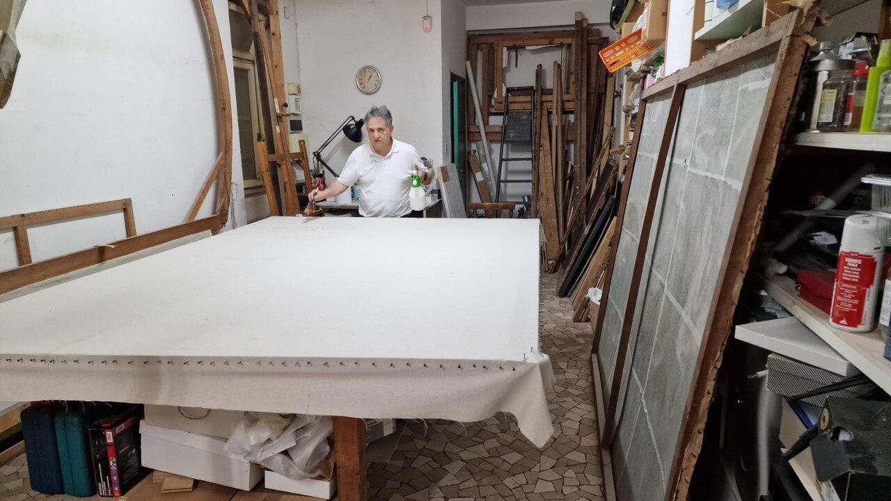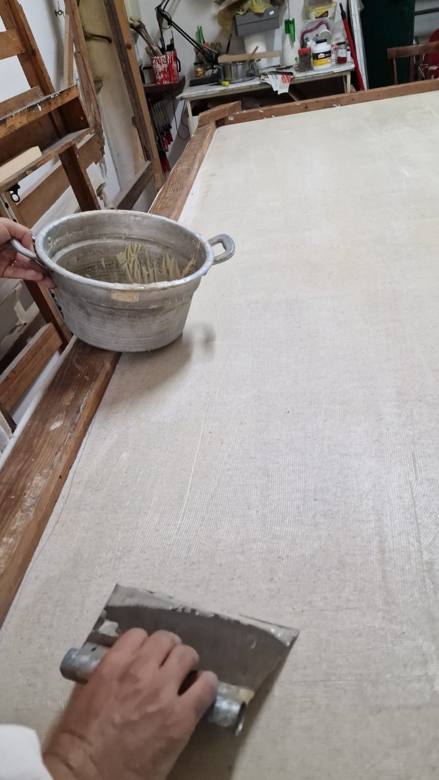 Verso il termine del restauro. Ecco le immagini delle operazioni di velinatura, il nuovo telo di supporto ed il nuovo telaio.