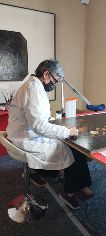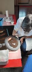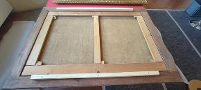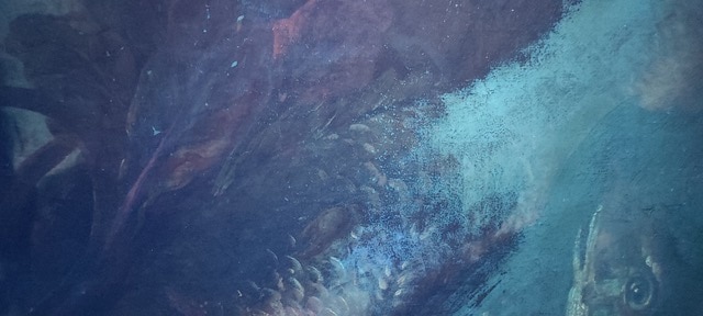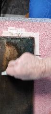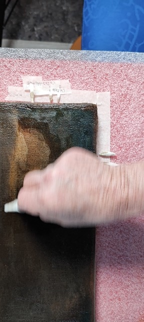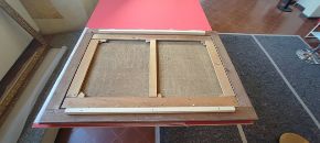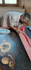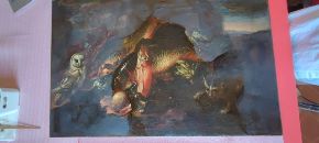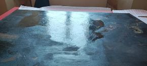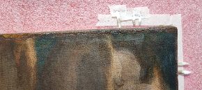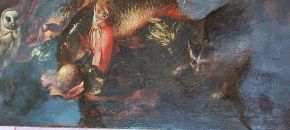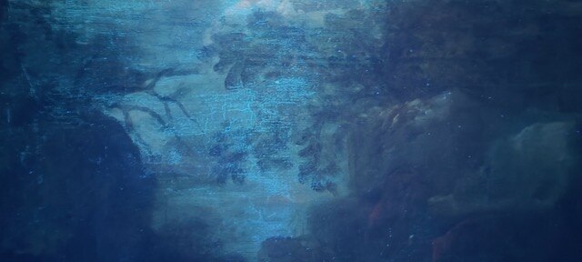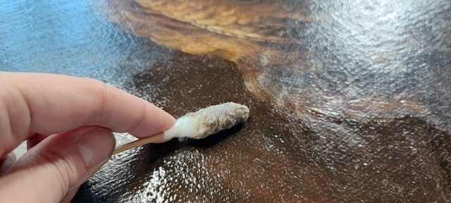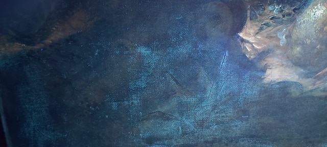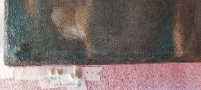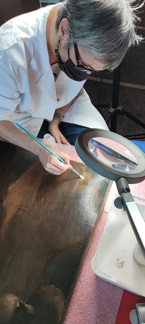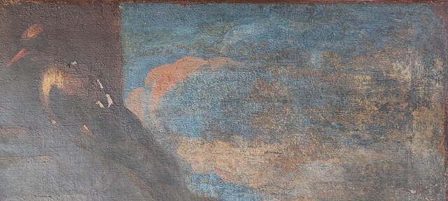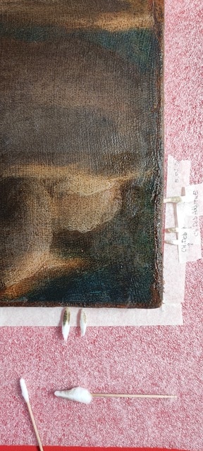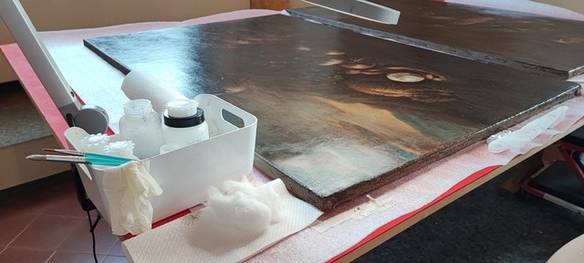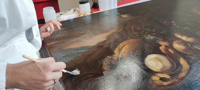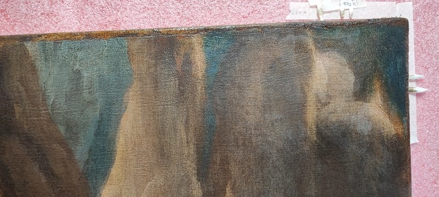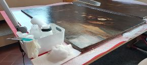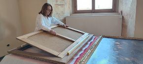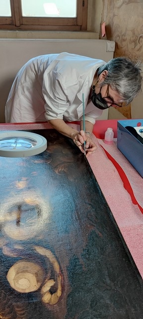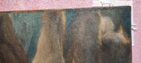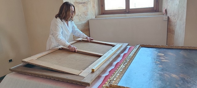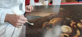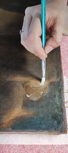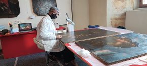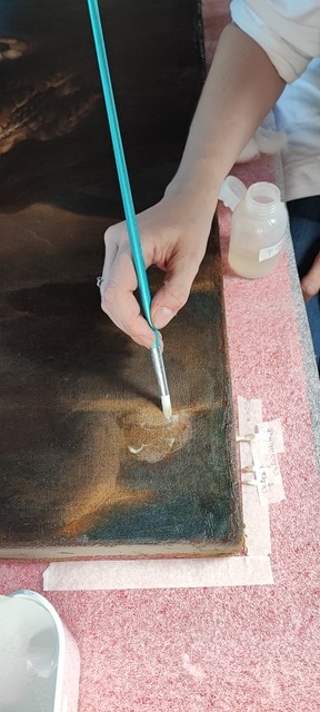Il ritocco pittorico. Ecco le immagini del ritocco pittorico, della rifoderatura e del fissaggio al nuovo telaio.