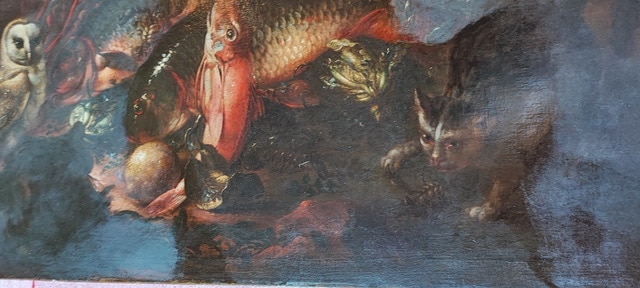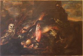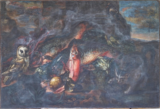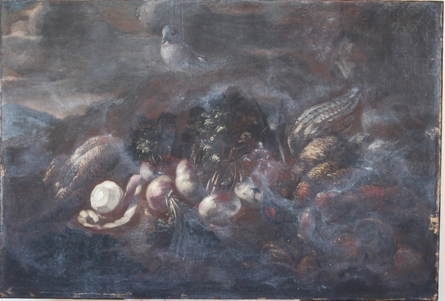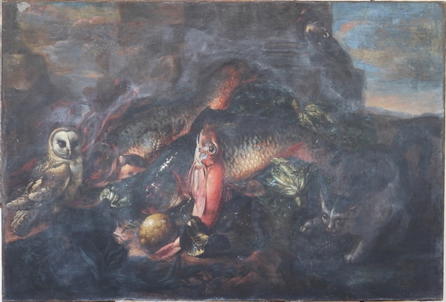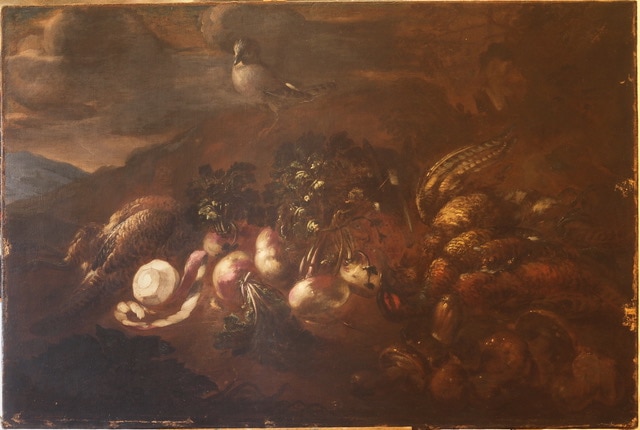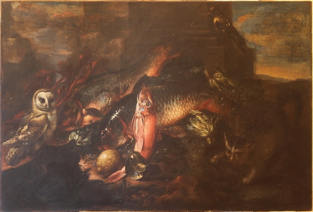 Due dipinti di ottima qualità del piacentino Felice Boselli. Nel primo al centro della tela predomina il colore rosso sfavillante dei pesci, contornati dai verdi della verdura. La luce che tocca il giallo del limone permette di sentirne la superficie rugosa. Il barbagianni e il gatto, realizzati alle estremità del dipinto, chiudono questa composizione dalla pennellata veloce e corposa. Nel secondo dipinto i toni caldi variati sul monocromo rossiccio grazie alla modulazione della luce presentano elementi poveri come alcune rape, già rappresentate in precedenza da Boselli, e un limone sbucciato. Sono loro i veri protagonisti di questa tela, in quanto valorizzati dalla luce. La gazza in cima alla composizione sembra guardare con preoccupazione i fagiani, pensando alla loro fine. Il gruppo dei soggetti rappresentati si fonde con il paesaggio circostante attraverso calde e corpose pennellate.