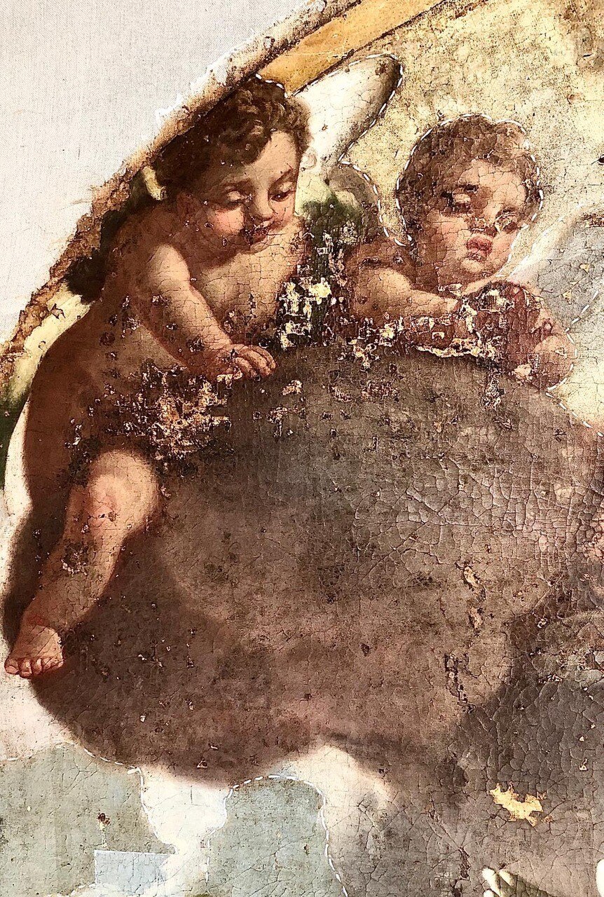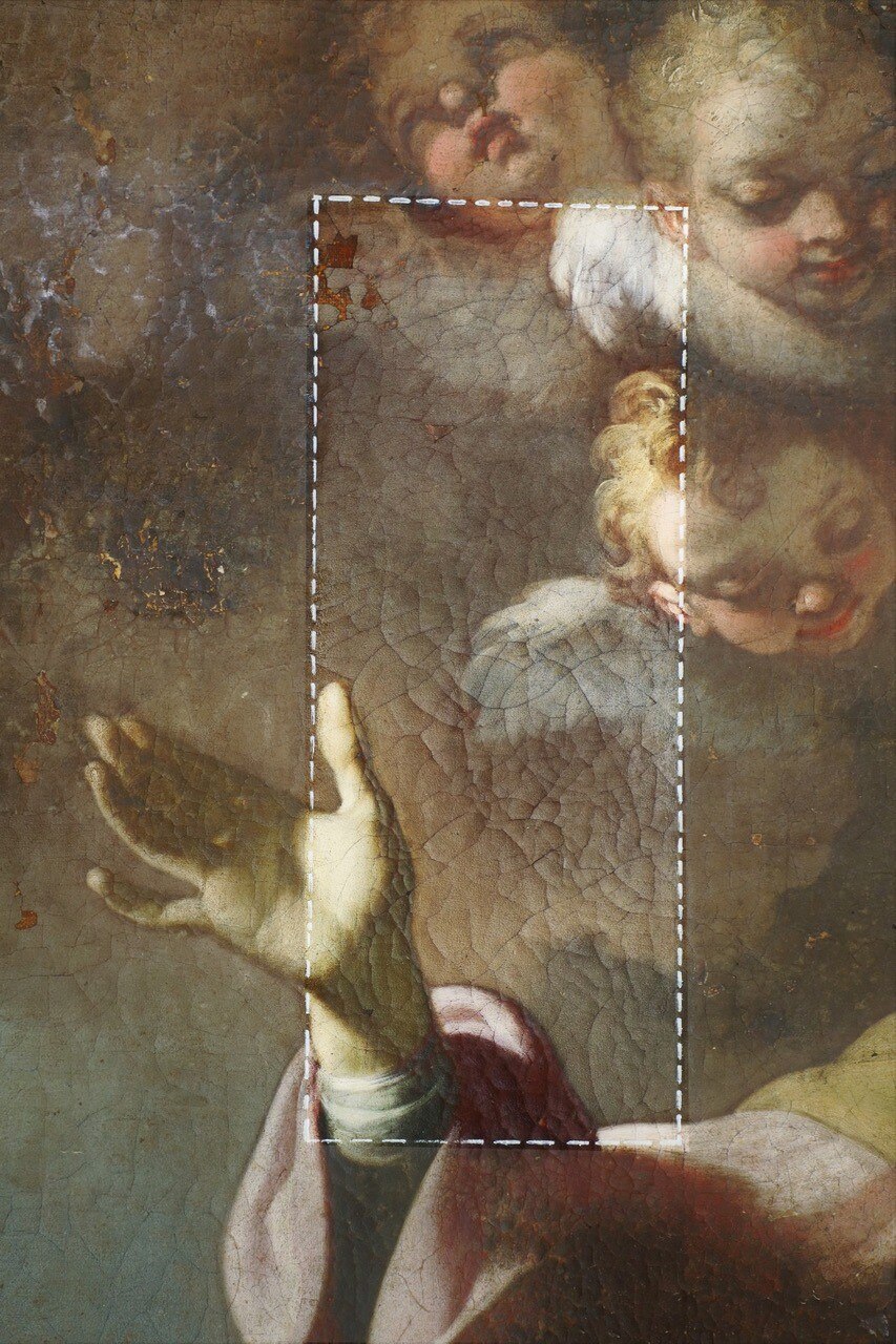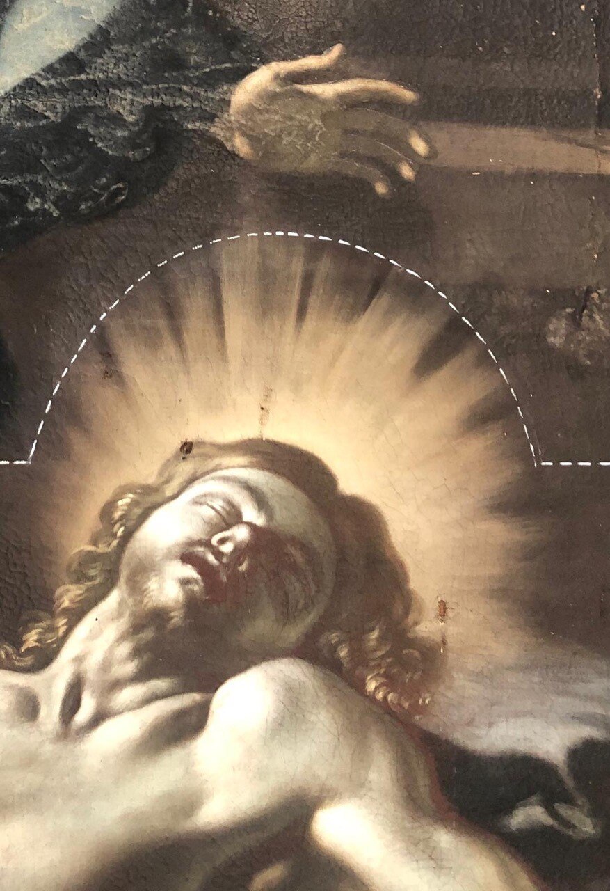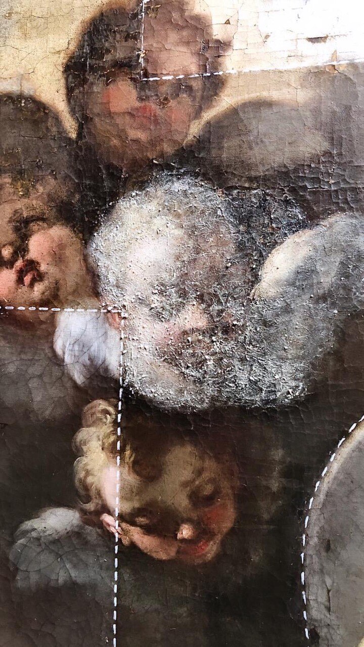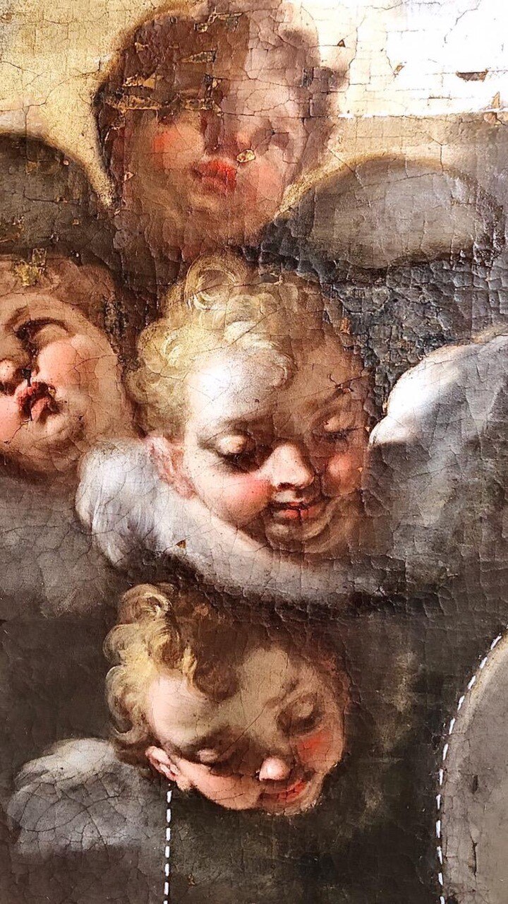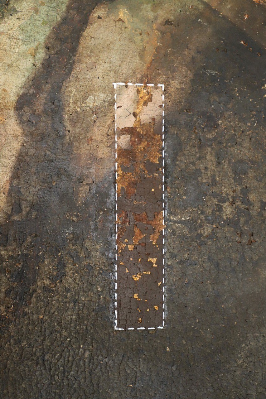 Verso la fine del restauro. Ecco le ultime fasi del restauro: l'opera è quasi pronta a brillare di una nuove luce! Vediamo le immagini del completamento della pulitura chimico-fisica, della realizzazione della cornice in legno di tiglio, della gessatura, della doratura e patinatura con bolo rosso armeno, della saturazione della pulitura della tela, del tensionamento sul telaio nuovo e infine del livellamento delle stuccature. Manca il ritocco pittorico e l’applicazione del protettivo e il restauro sarà completato!