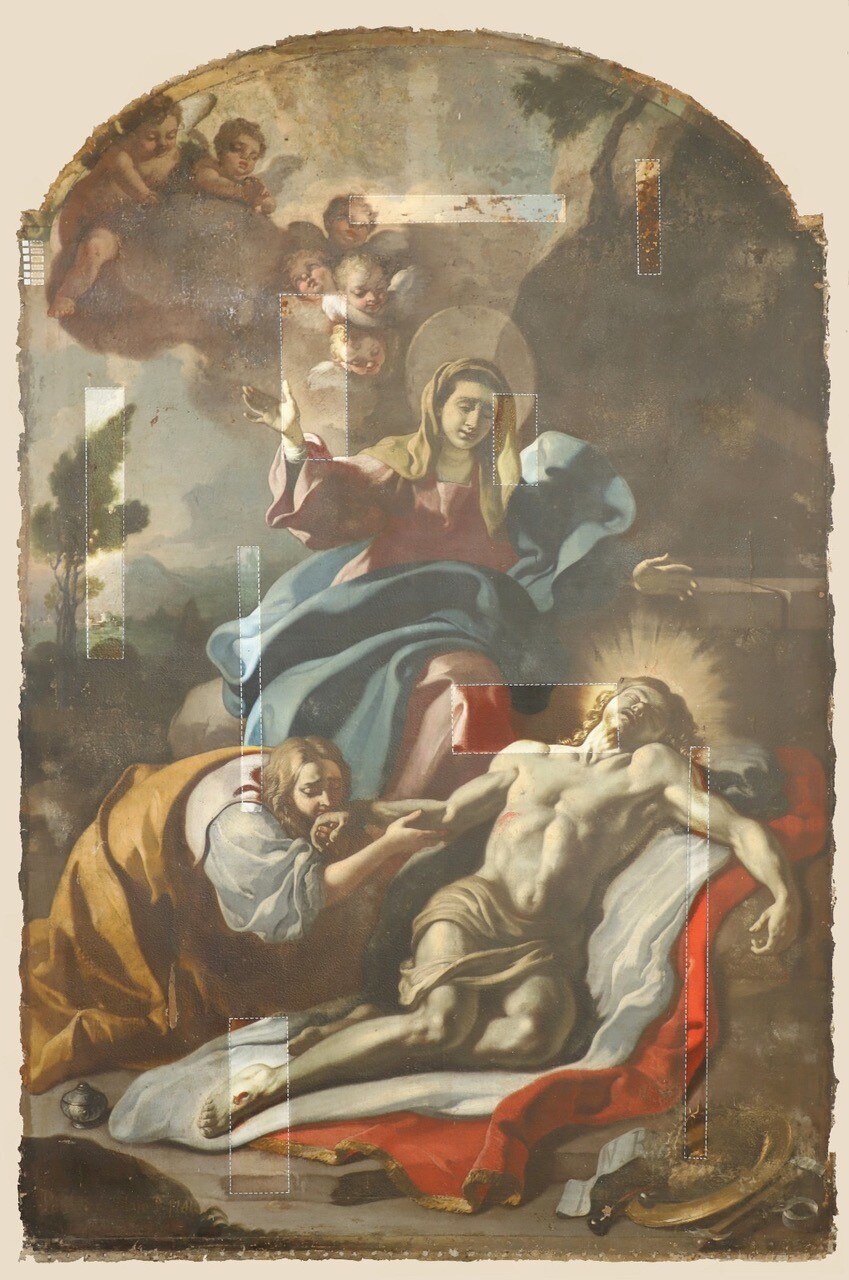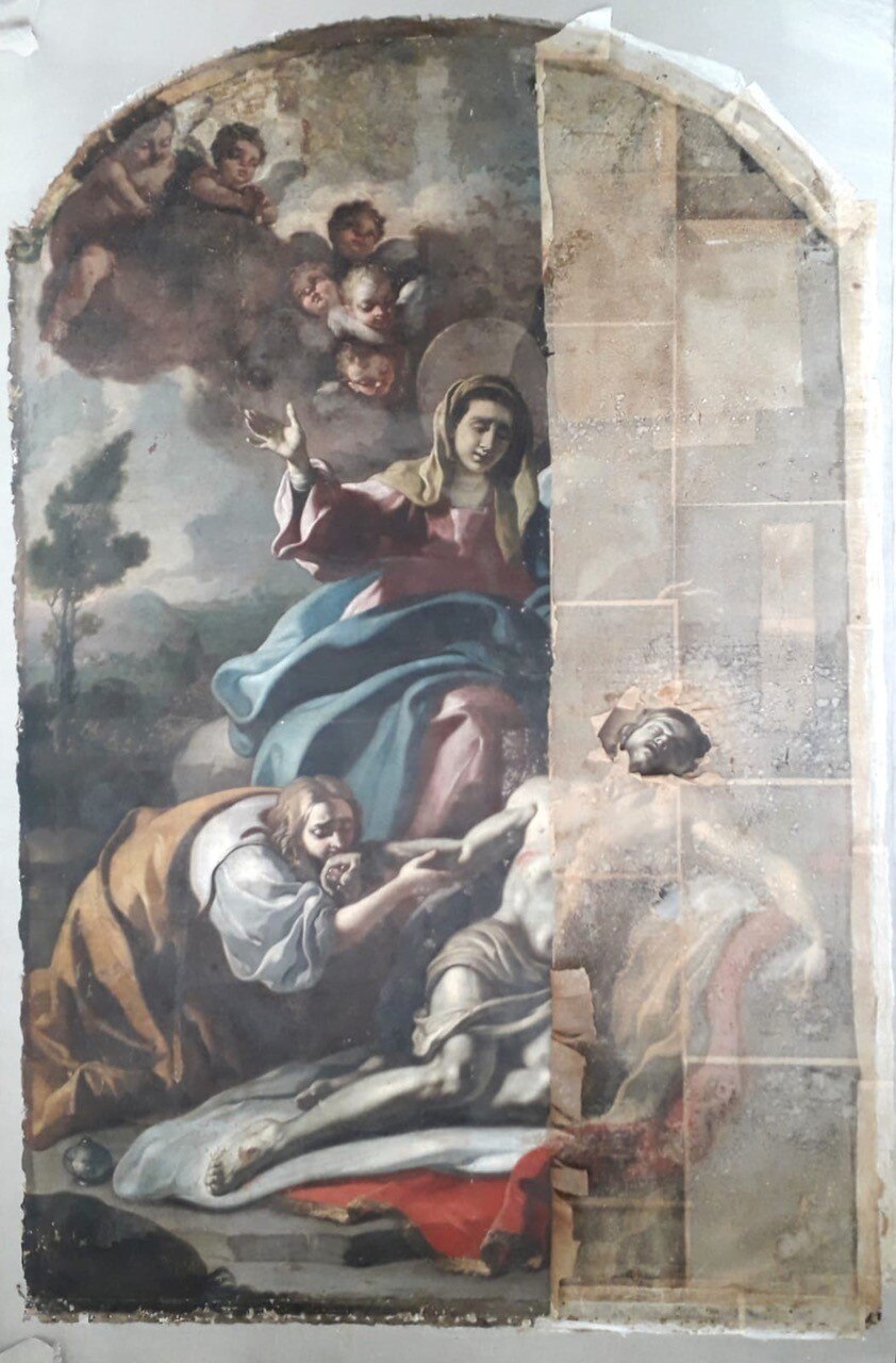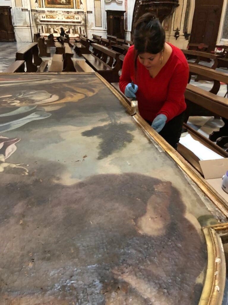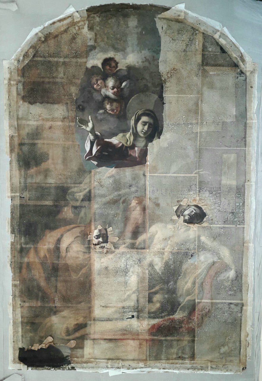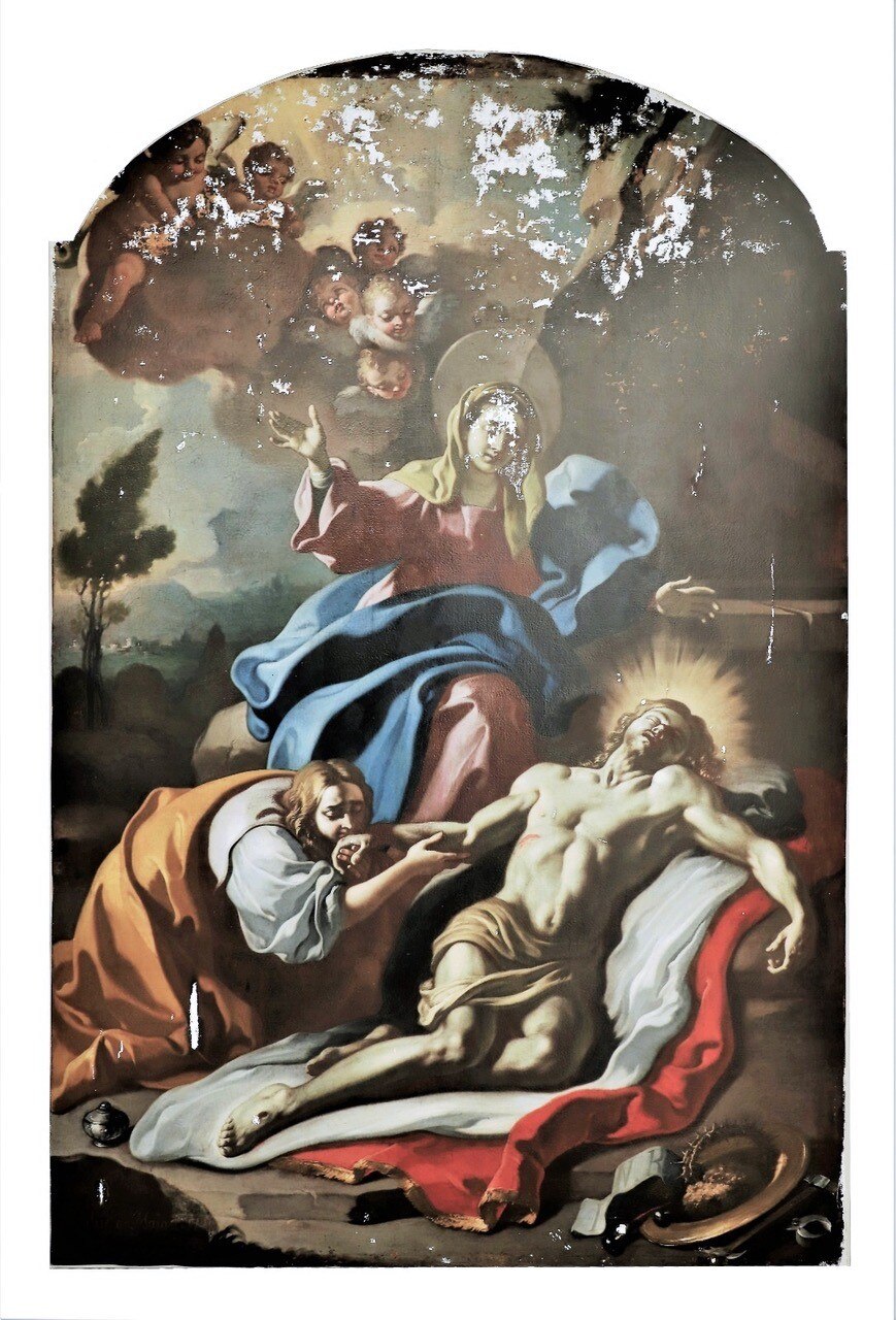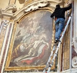 L’intervento prevede l’asporto dell’opera dal suo alloggiamento e le indagini preliminari, condotte anche tramite microprelievi per la localizzazione delle zone maggiormente degradate della tela. Si procederà quindi all'eliminazione delle fessurazioni e a un ritensionamento della tela. Dopo le operazioni di consolidamento, si prevede un ritocco pittorico, cui seguirà l'applicazione di un protettivo neutro.