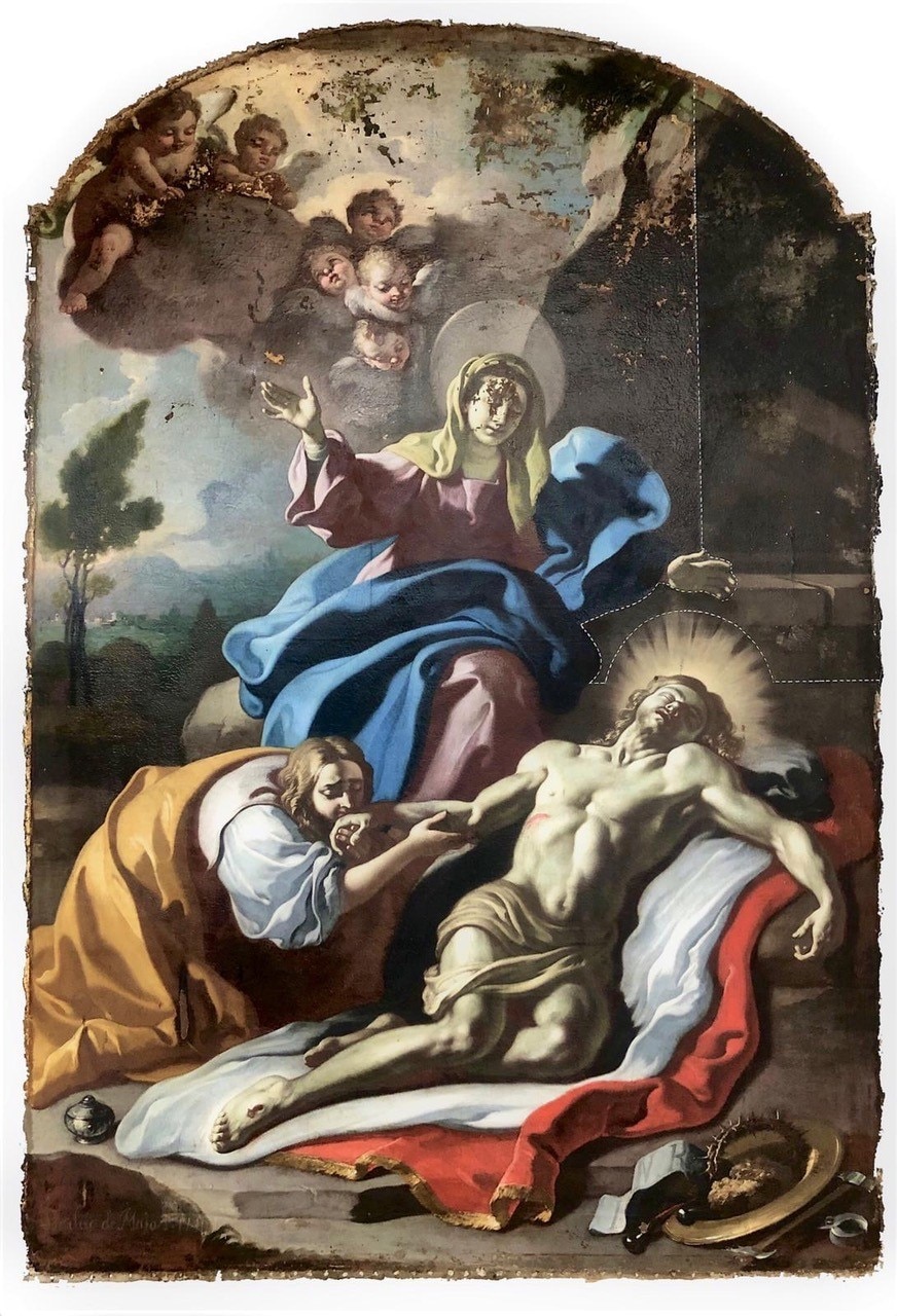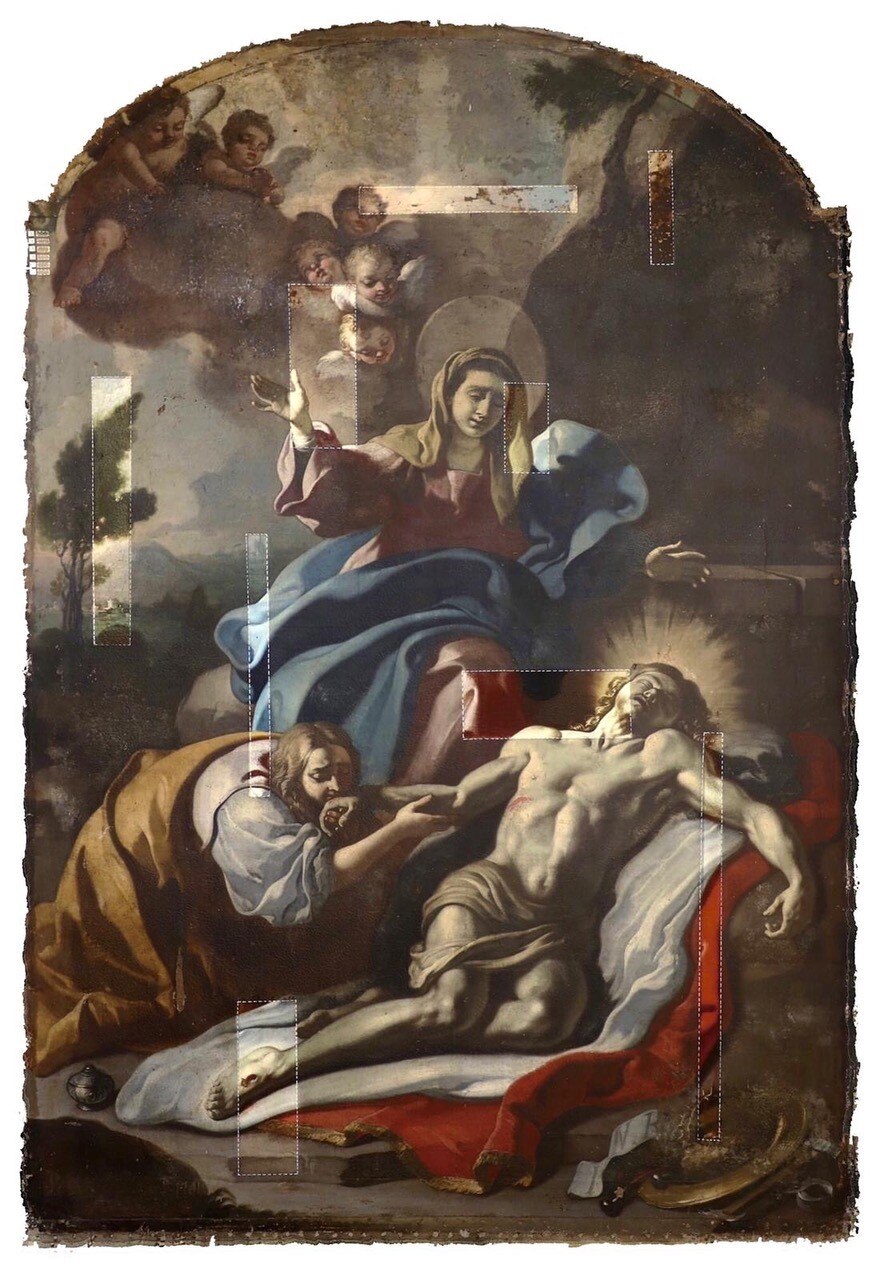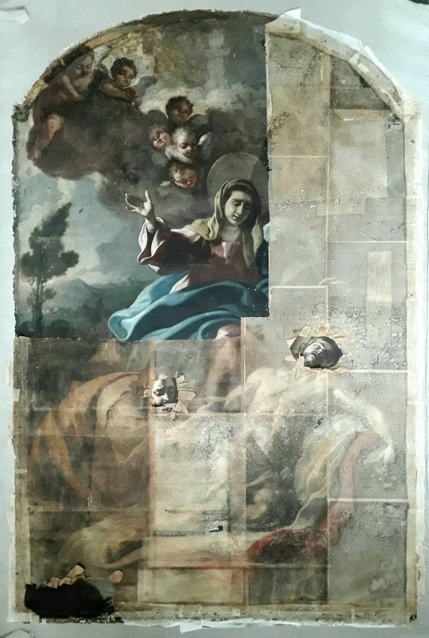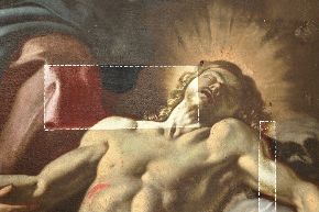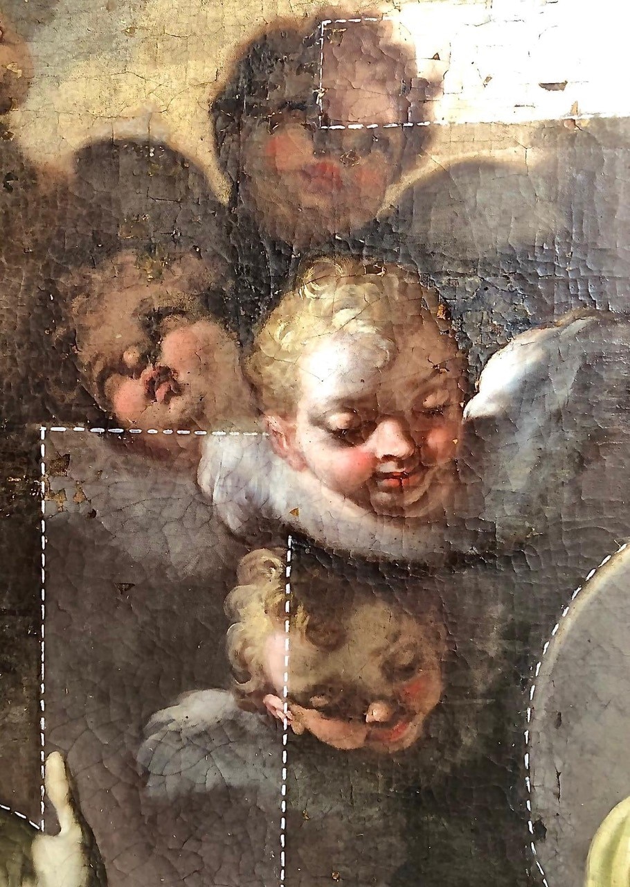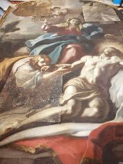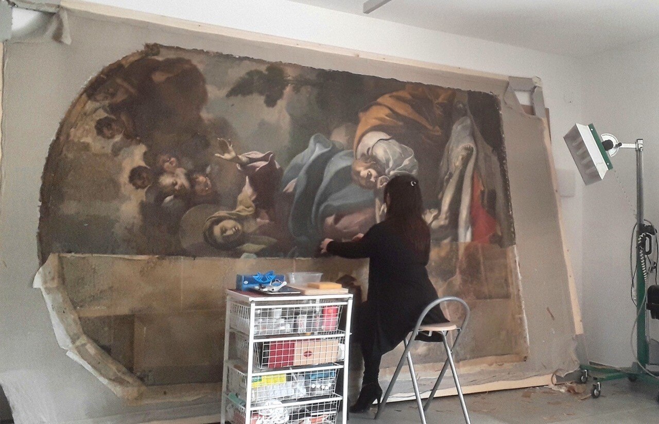 L’intervento prevede l’asporto dell’opera dal suo alloggiamento e le indagini preliminari, condotte anche tramite microprelievi per la localizzazione delle zone maggiormente degradate della tela. Si procederà quindi all'eliminazione delle fessurazioni e a un ritensionamento della tela. Dopo le operazioni di consolidamento, si prevede un ritocco pittorico, cui seguirà l'applicazione di un protettivo neutro.