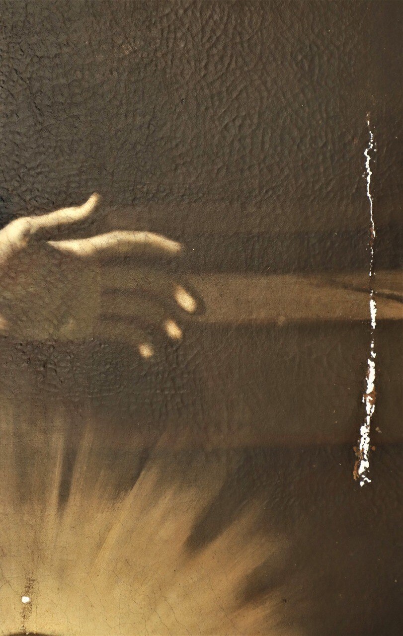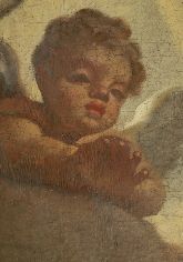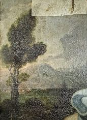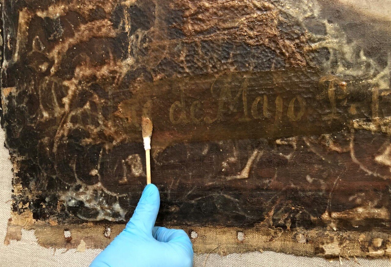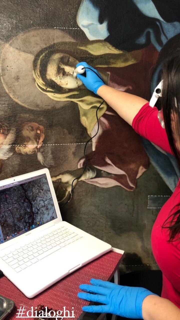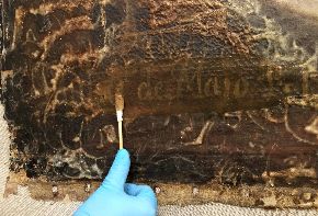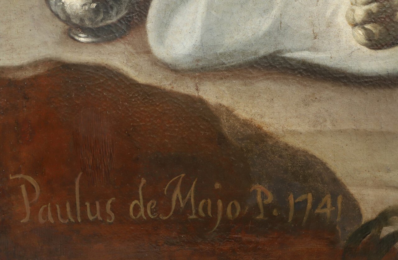 La firma. Siamo alle fasi di identificazione dei tasselli di pulitura, del suo controllo in fluorescenza e al microscopio digitale, dell'analisi delle ridipinture con ultravioletti, della rimozione delle policromie non originali e infine della pulitura con enzima amilasi, in seguito a cui si è verificato l'affioramento della firma "Paulus de Majo 1741".
