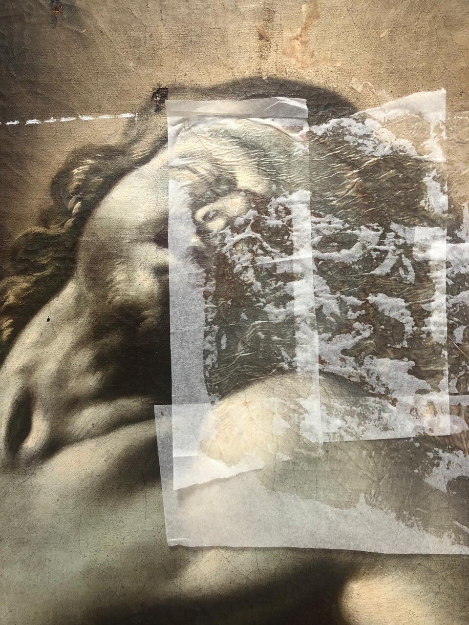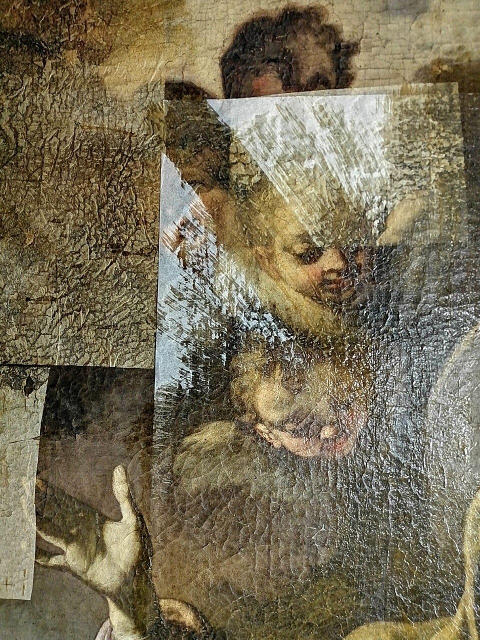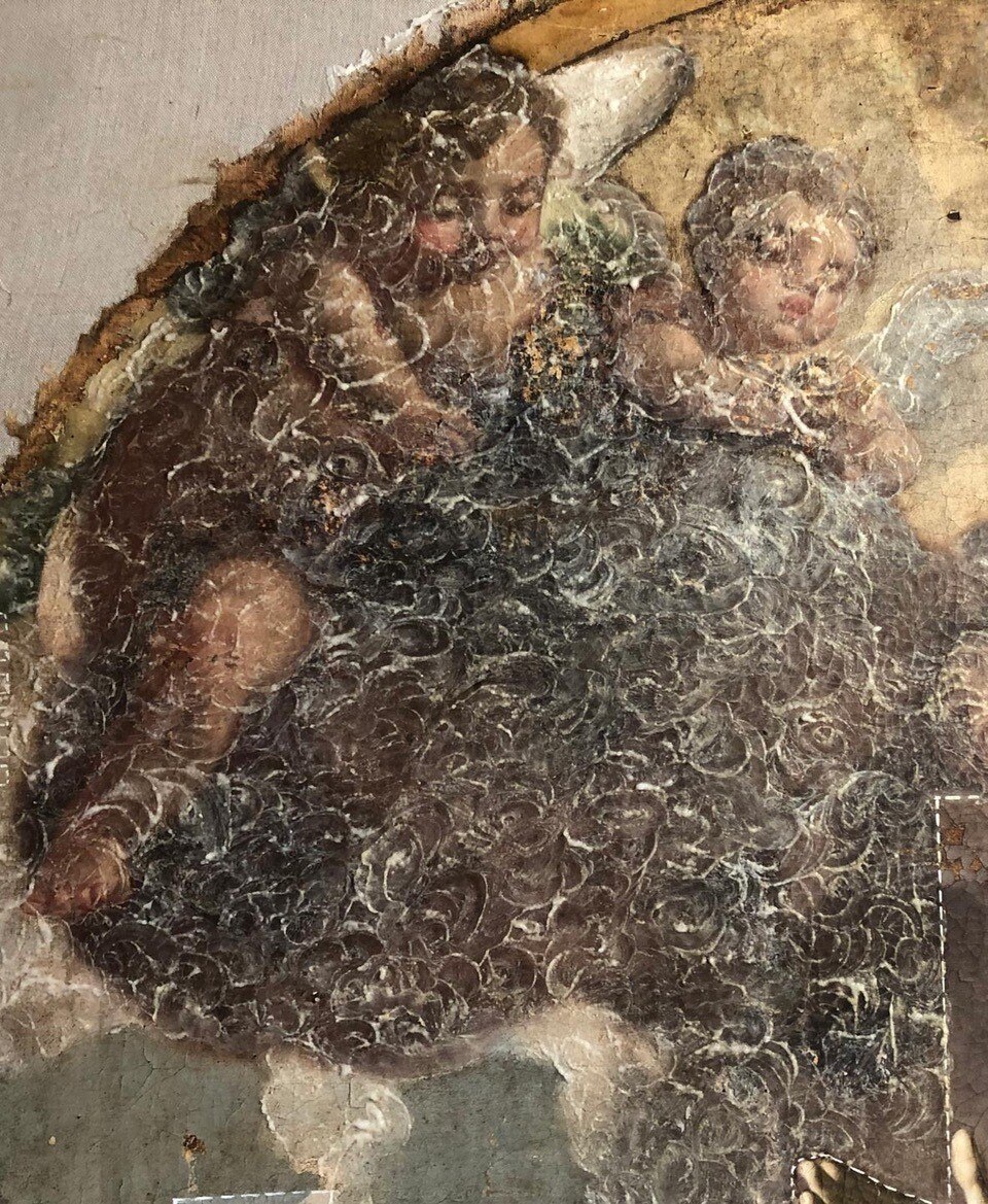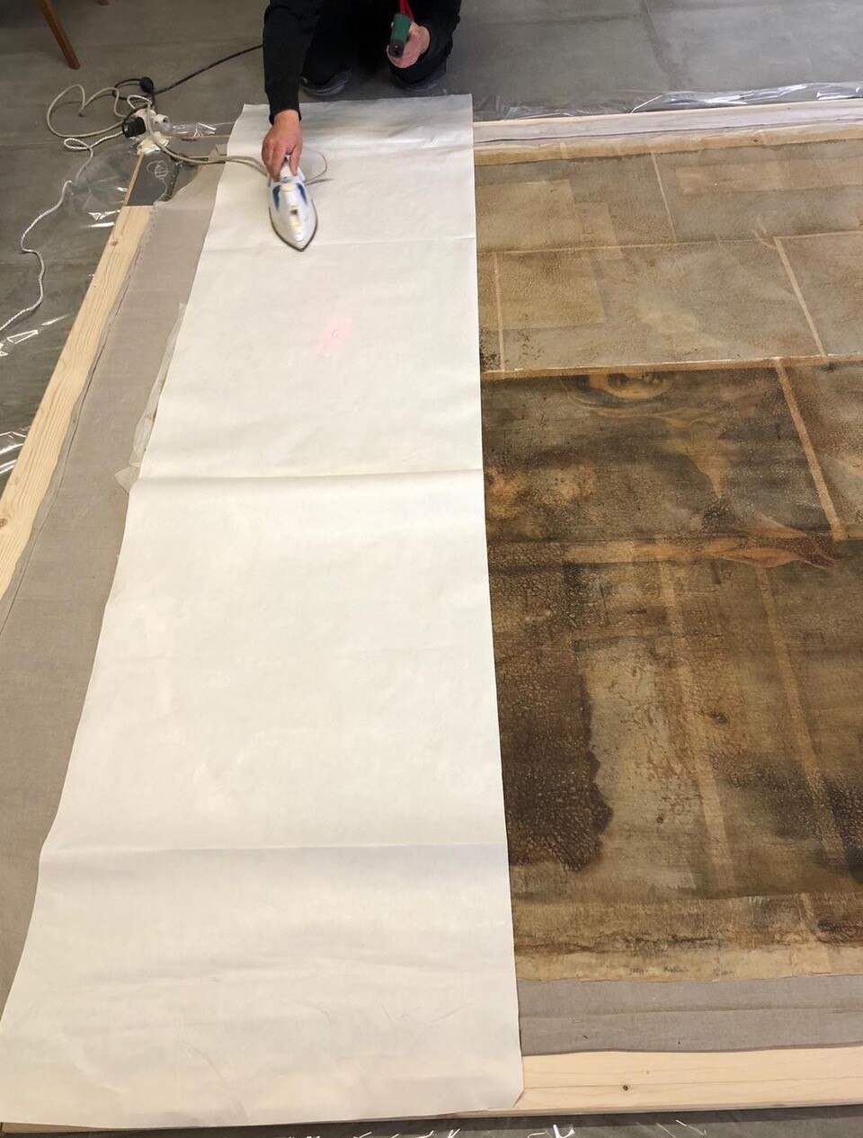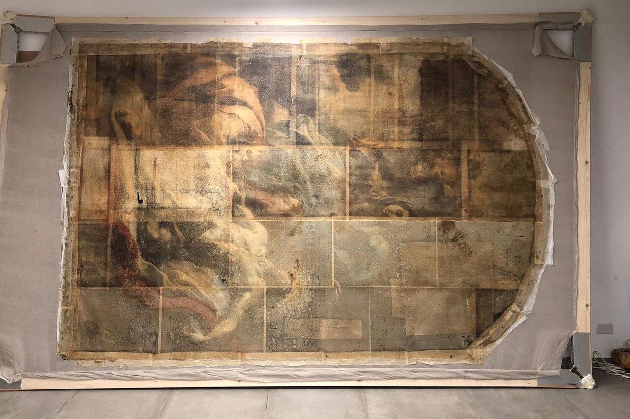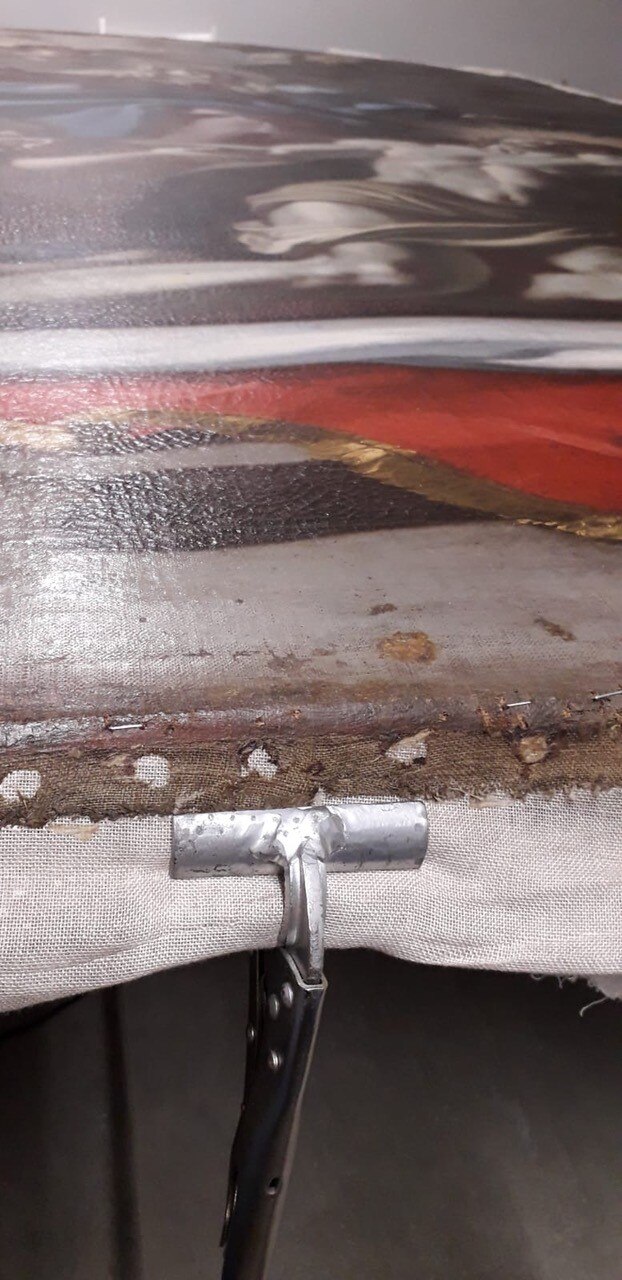 Al giro di boa. Siamo a metà dell'intervento di restauro della Pietà: ecco le immagini delle operazioni di stiratura del retro e del frontale della tela, di tensionatura, di preparazione del sottovuoto con camera anossica e infine di svelinatura.