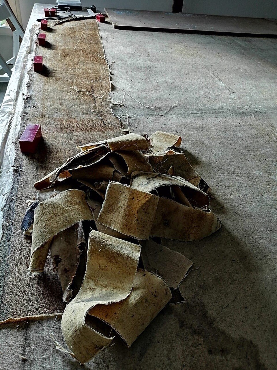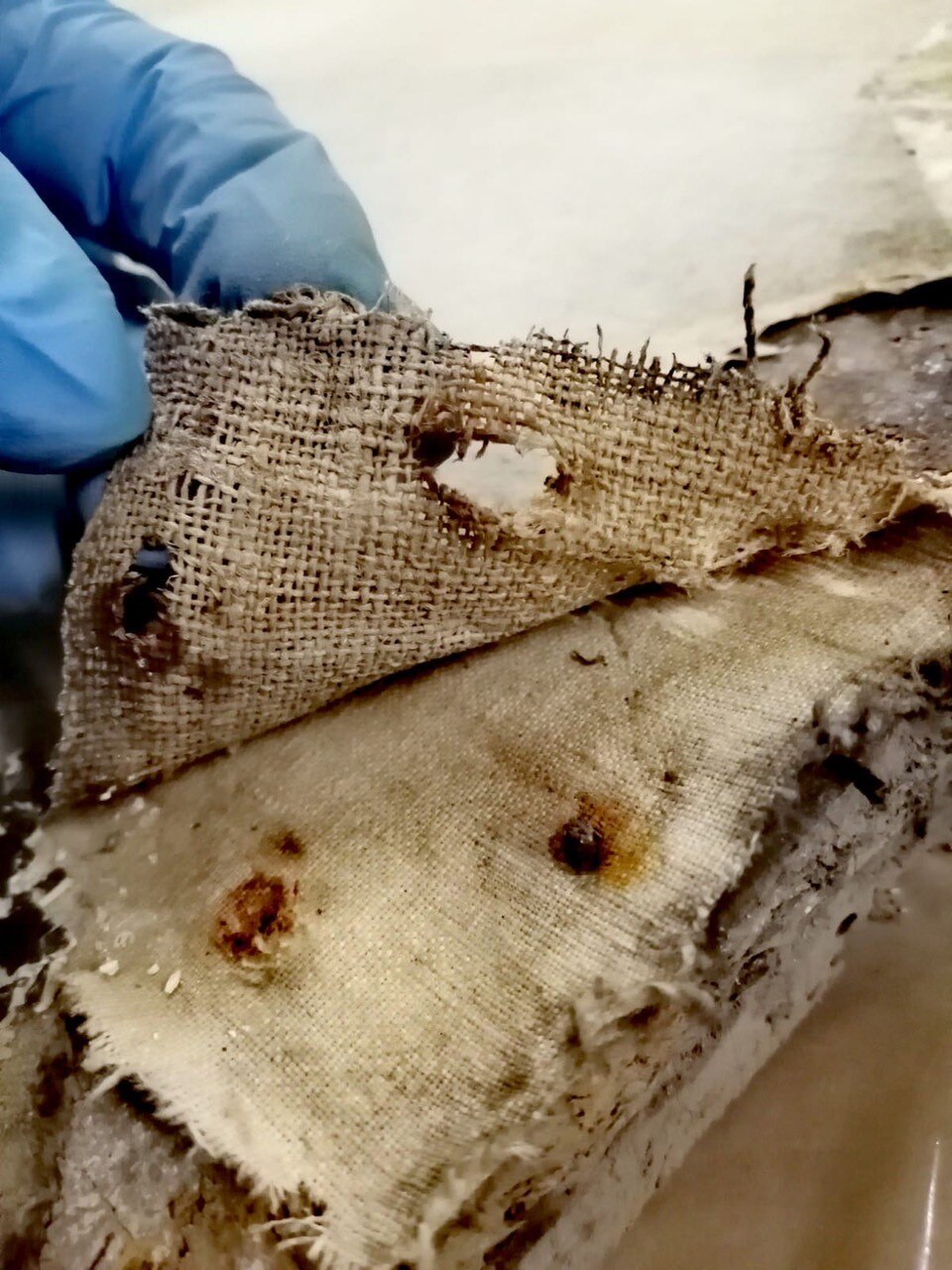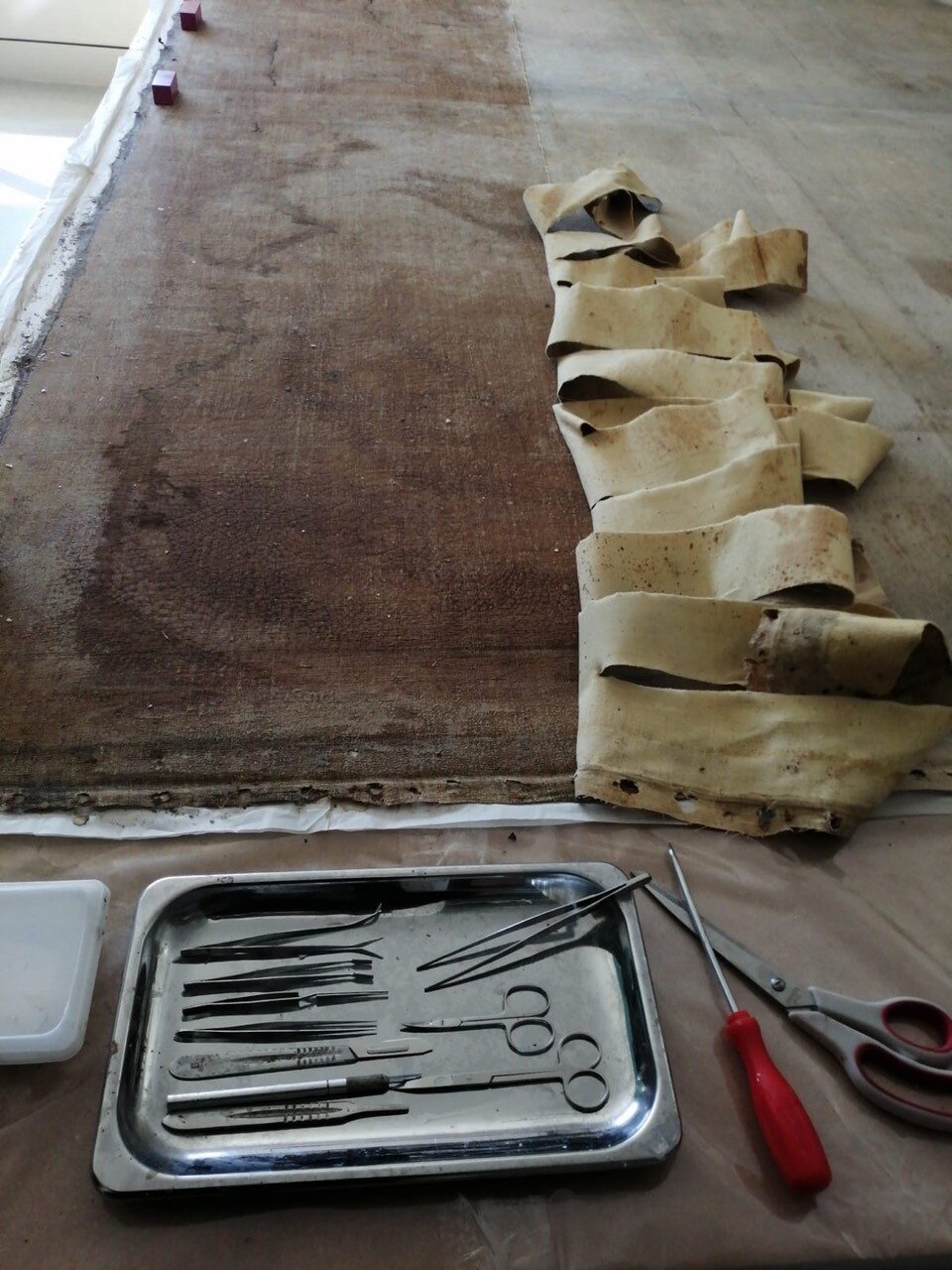 Tela e telaio: gli aggiornamenti sulla Pietà. Ecco alcune immagini davvero peculiari sulla rimozione e pulitura del supporto tessile e del telaio: potete osservare tutti i chiodi di varie dimensioni che sono stati estratti! In evidenza le differenze tra la tela originale e quella da rifodero, e gli studi sullo stato di conservazione del telaio e del supporto tessile. Al termine dell'intervento è stato rimosso il manufatto dal telaio e sono state avviate le operazioni di pulitura del supporto tessile, compresa la rimozione della tela da rifodero.