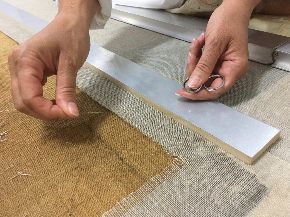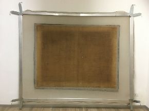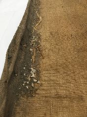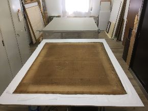 La pulitura. Ecco alcune immagini sullo stato di avanzamento dei lavori che riguardano la pulitura della tela, la velinatura della parte pittorica, la preparazione della tela per l’applicazione delle fasce perimetrali, l’applicazione delle fasce perimetrali e il consolidamento dell’angolo della cornice.